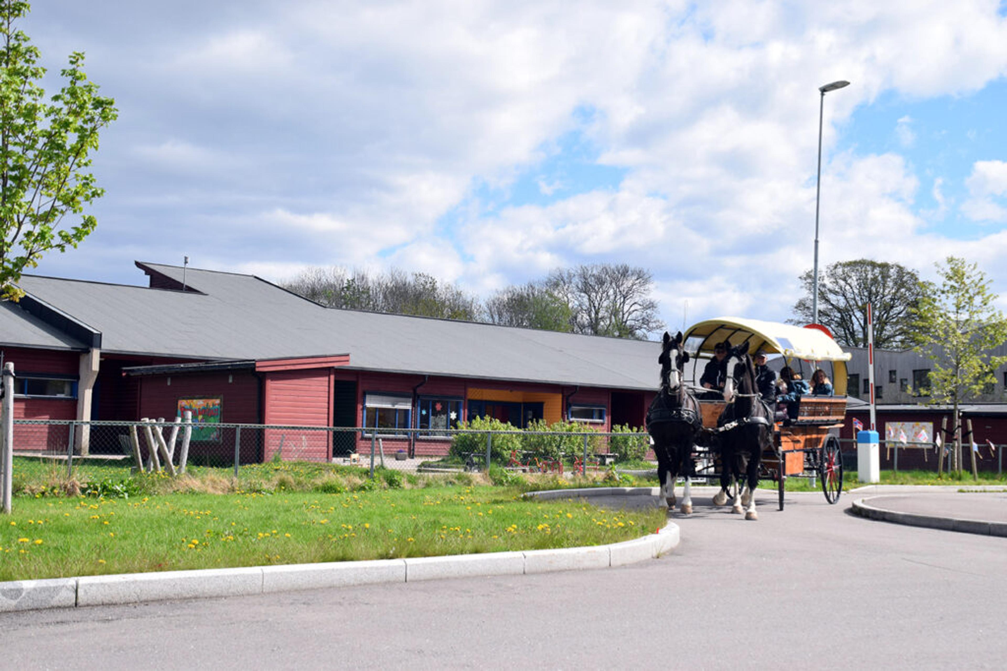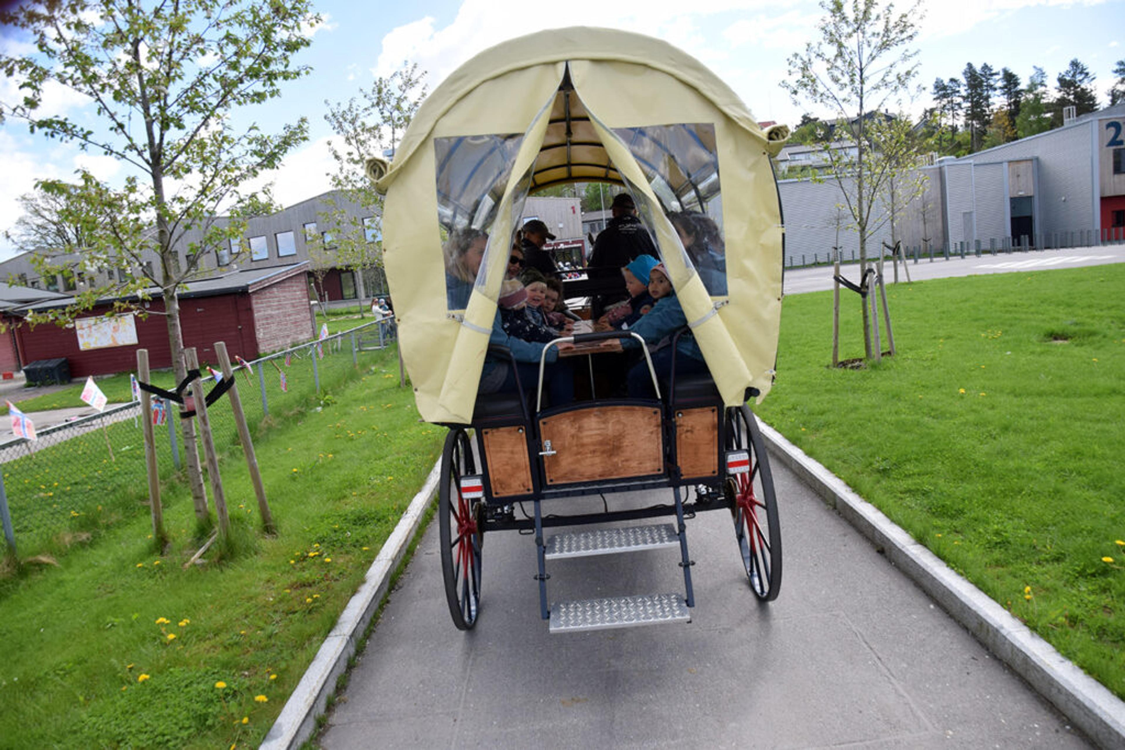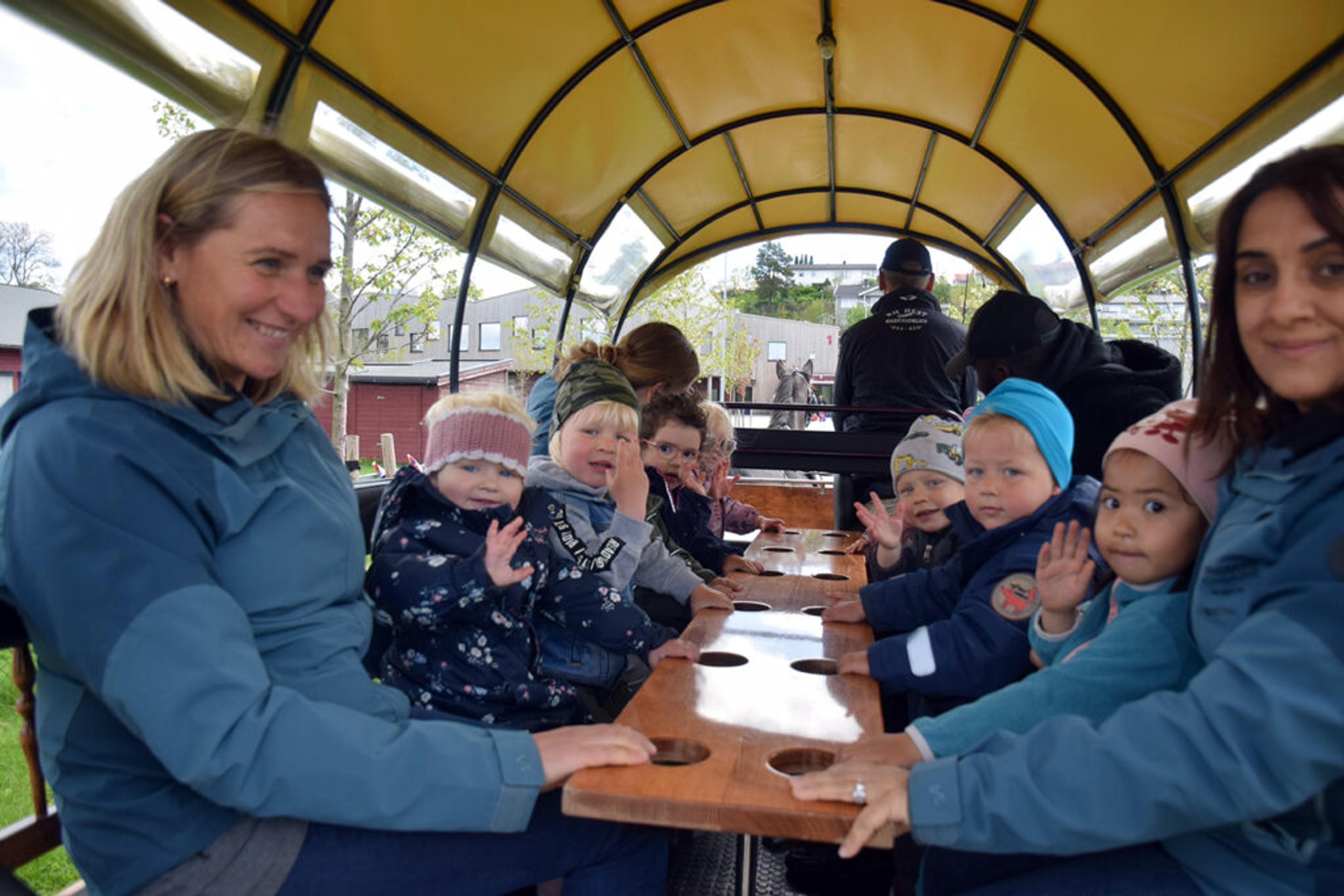 Så vinker barnehagebarna til lokalavisas utsendte, før ni glis titter over lemmene på hestevogna der det staselige følget tusler av gårde.