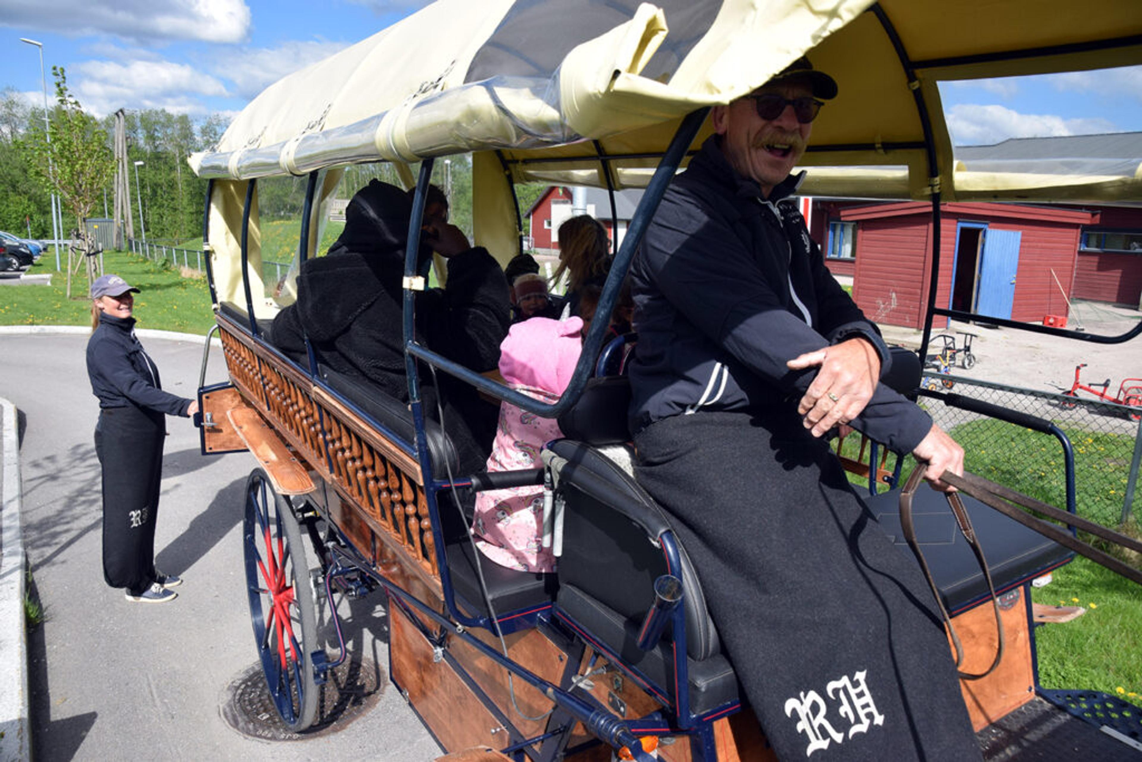 ALT KLART FOR AVGANG: Ni barn trygt plassert, sammen med noen heldige ansatte. Og Roger og Jeanette bak tøylene. Foto: Stian Ormestad.