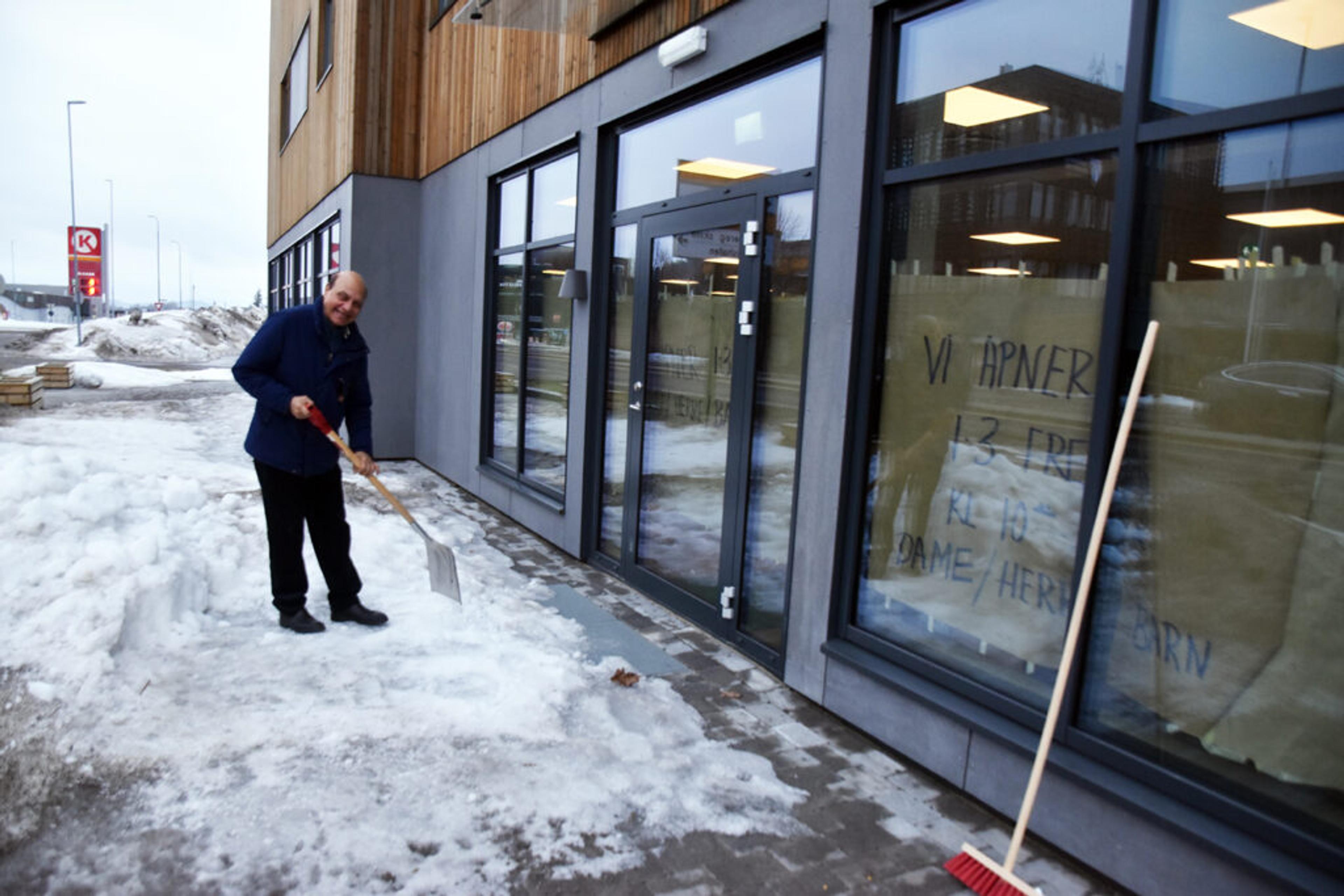 SKUFFER VEI: Surinder Paul (67) står ikke bak kassa, men hjelper til med alt annet. Som å måke vekk snøen fra inngangspartiet før første åpningsdag fredag 1. mars 2024. Foto: Stian Ormestad, ReAvisa.