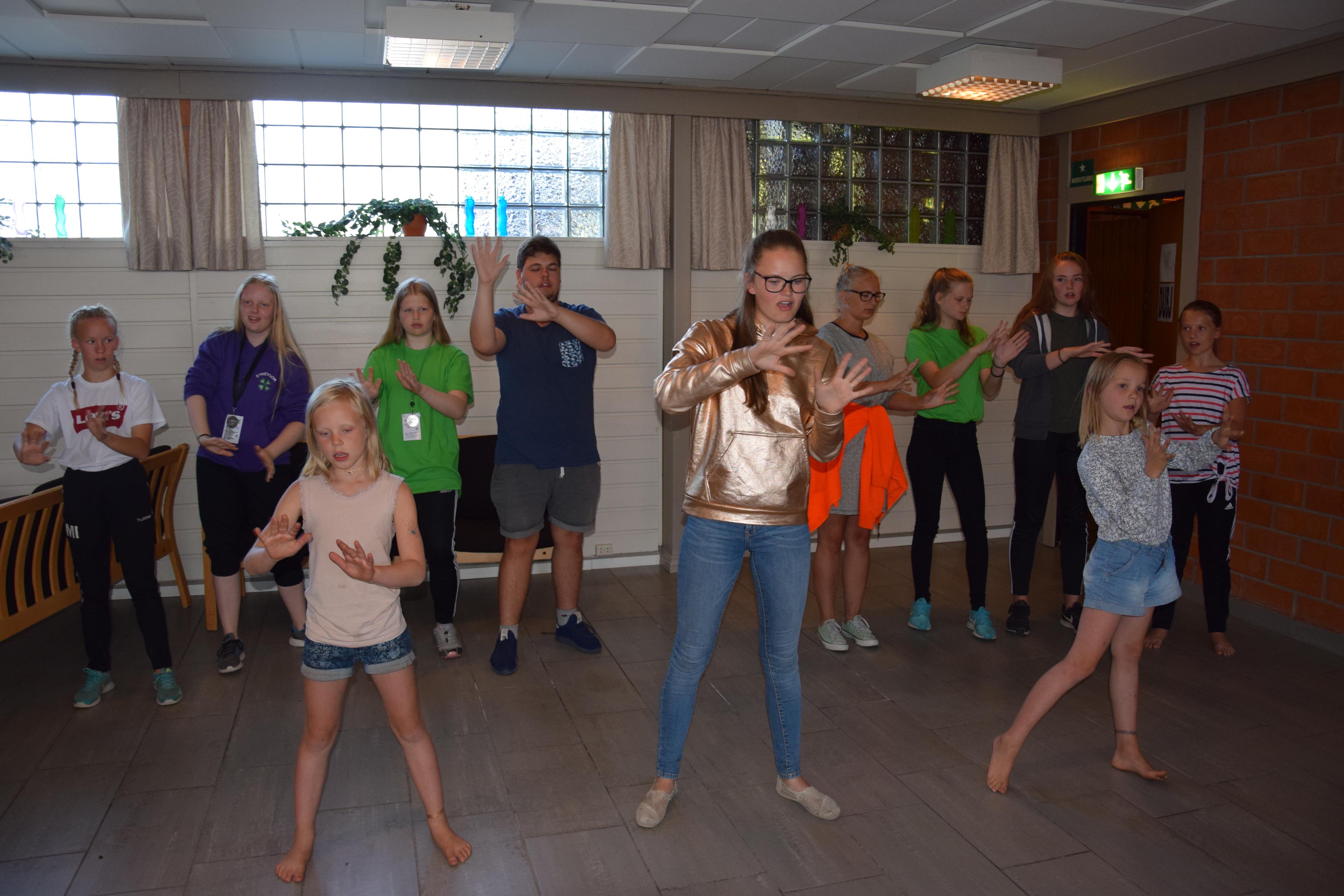 TEGNSPRÅK: Her tolker tegnspråkgruppa til en sang. Foran fra venstre: Tyri Jensen Aarøe, Vilde Viie fra ”Norske talenter” og Solveig Akerholt. Bak: Martine Haugkjem, Flittig 4H, Sandra Staff Vik, Strevsom 4H, Anbjørg Skaret Skoe, Ørn 4H, Joakim Løveseter Pettersen, Aktiv 4H, Eilèn Wolden, Rapp 4H, Stine Braaten, Ørn 4H, Sandra Flittig Jacobsen, Ørn 4H og Elly Johanne Gram, Konvallen 4H. . Foto: Håkon Westby.