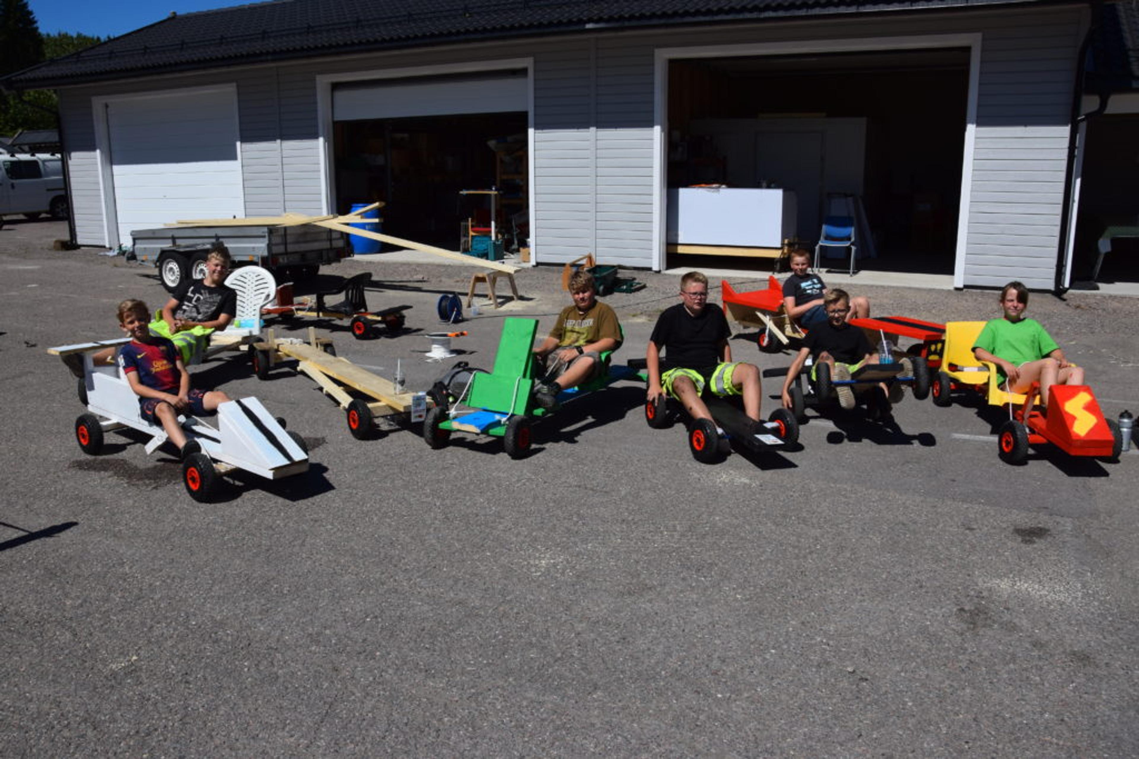 OLABILER: Snekra på leiren og klare for ”Olabilløp”, foran fra venstre: Oliver Utklev Landa, Konvallen ¤H, Alexander Nærum, Nærum 4H, Hans Martin Nærum, Nærum 4H, Didrik Mørken, Villig 4H, Karsten Låhne Skrøtting, Villig 4H og Erica Emilie Løseth, Djerv 4H. Bak: Markus Larsen , Beitemarken 4H og Martin Brattekvern Bakke, Strevsom 4H. Foto Håkon Westby.