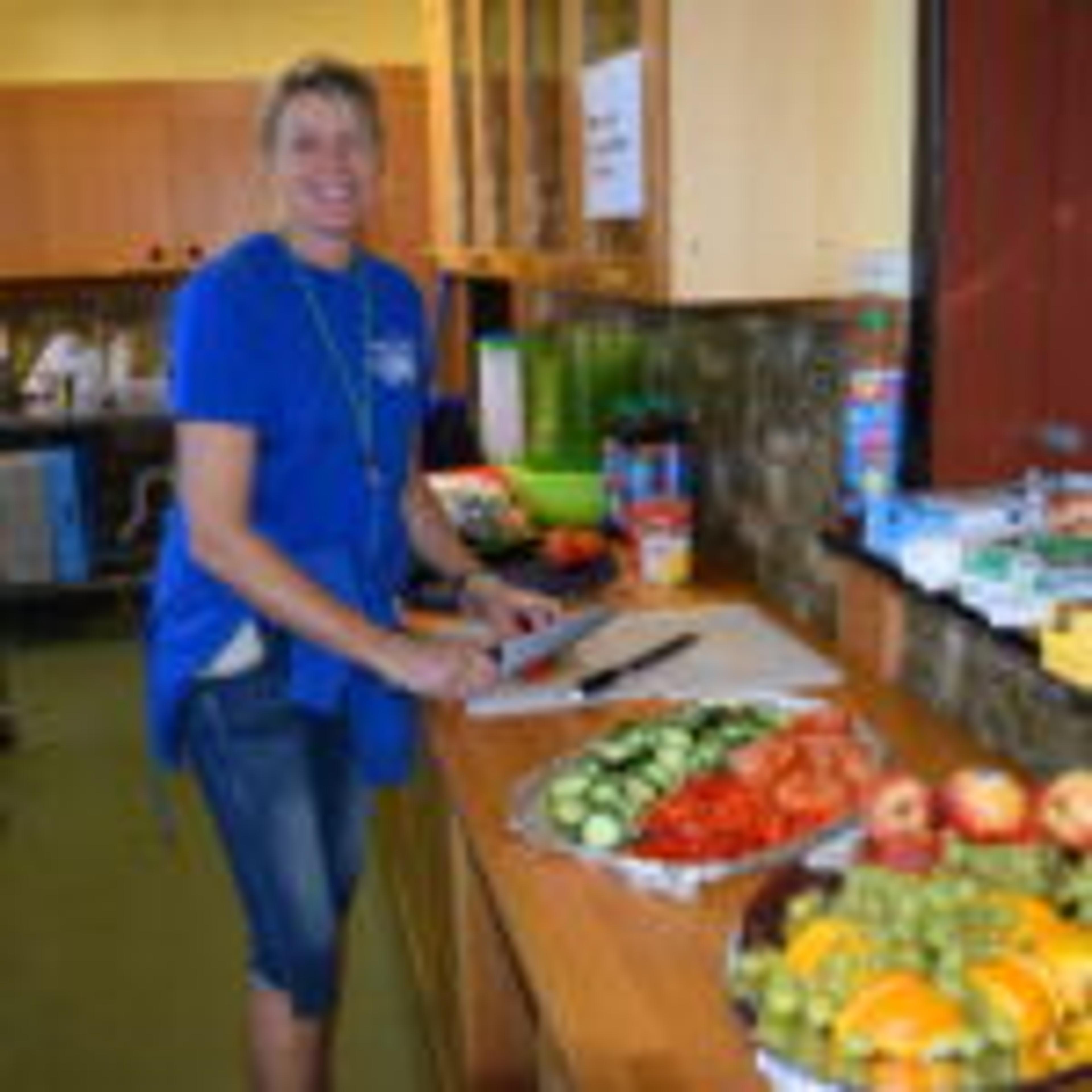 MATSJEFEN: Hanne Sjue fra Sjue gård i Vassås sørger her for frisk frukt og grønnsaker til deltakere. Foto: Håkon Westby.