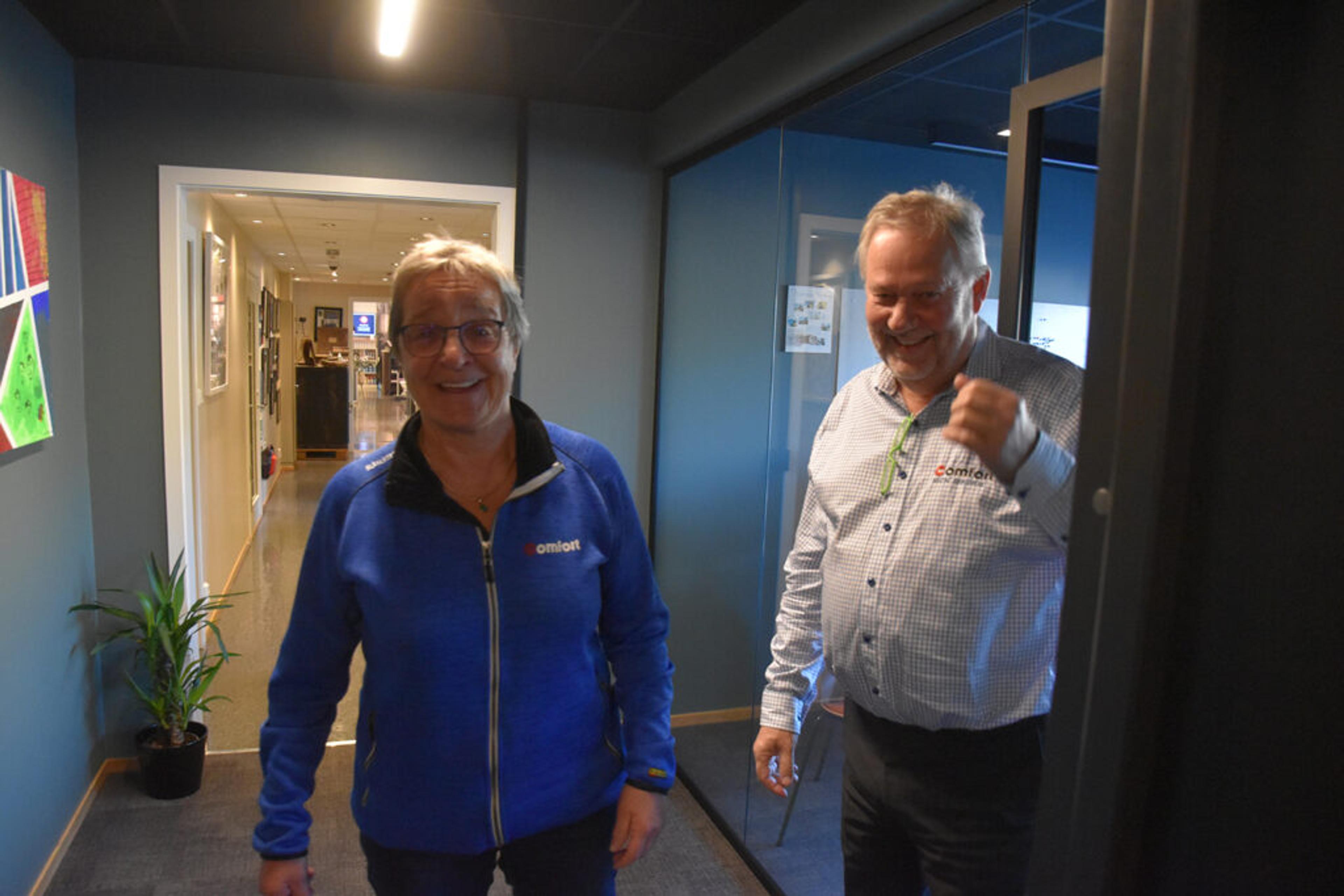 «LITT» PENSJONIST: Målet er å trappe ned såpass at grunderne kan gå rundt og være rådgivere og sparringspartnere, men de vil ikke slutte helt å jobbe, forteller ekteparet Bergljot Woll og Georg Gran. Nedtrappinga er godt i gang, med rekruttering av mange flinke folk som overtar mer og mer. Foto: Stian Ormestad, ReAvisa.