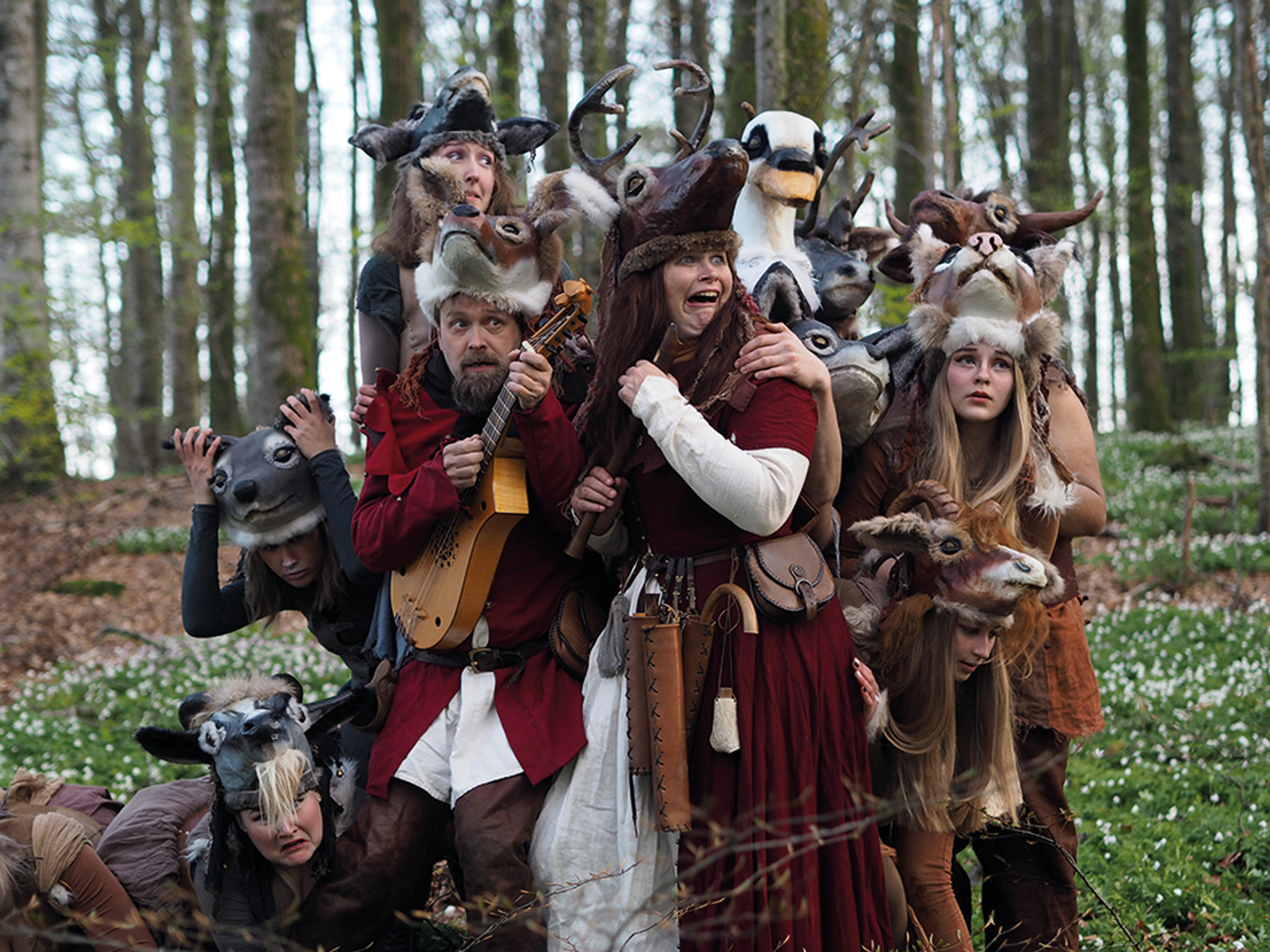KJENTE OG KJÆRE GJØGLERE: Familieforestilling med middelalderbandet Canardus Horribilis, som vi kjenner fra Re middelalderdager, og teatergruppa De Munnfulle. Dansere fra Extend står også på scenen. Foto: Pressemelding.