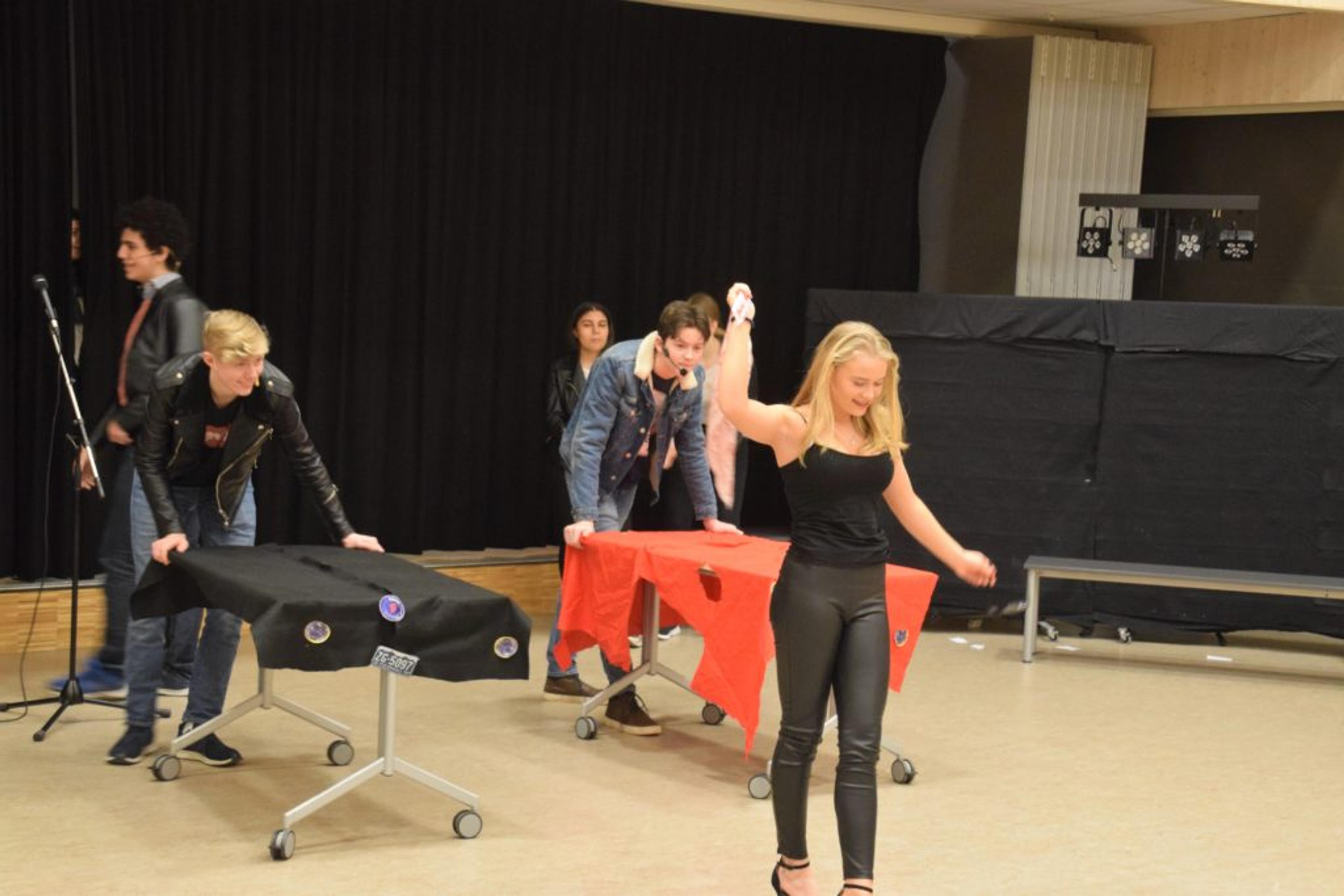 FLOTT FORESTILLING: Alt er skrivi om til lokale forhold. Selvfølgelig er handlingen lagt til Revetal ungdomsskole. Foto: Stian Ormestad.