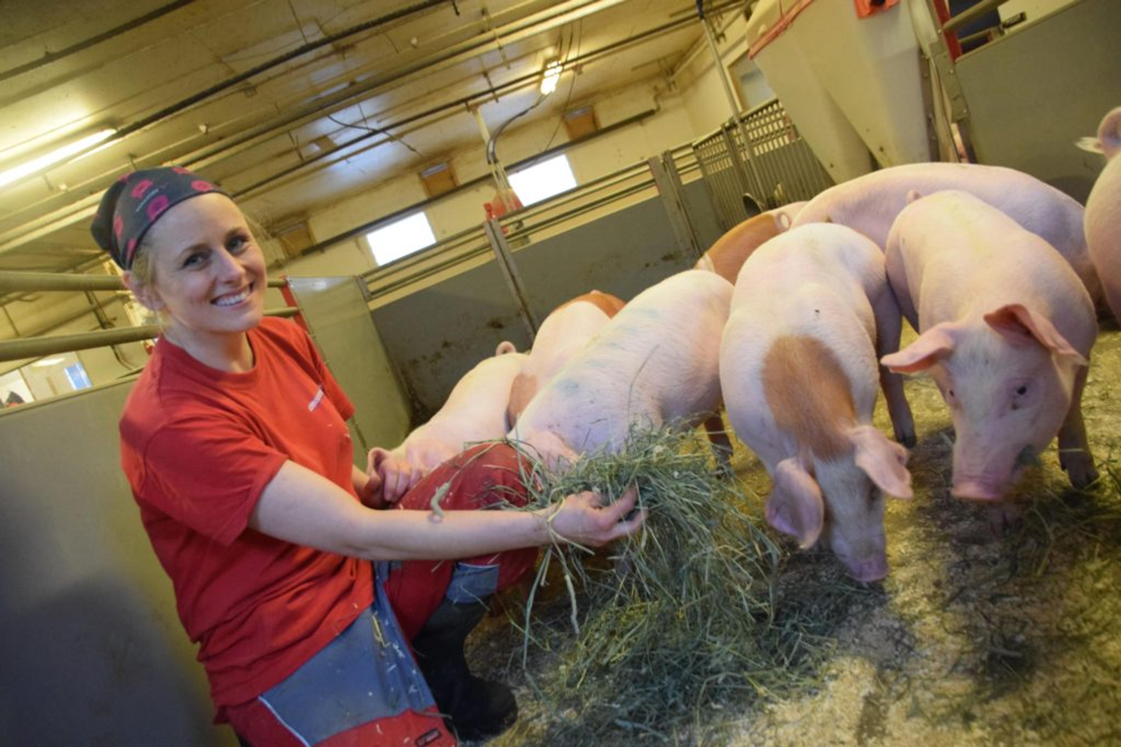 GLADE GRISER: Astrid Kristin Holm (38) har med litt høy inn til grisene. Det sammen med flis og halmpellets – og god plass å boltre seg på – gjør at grisene kan rote rundt med snutene sine og være i aktivitet. Foto: Stian Ormestad.