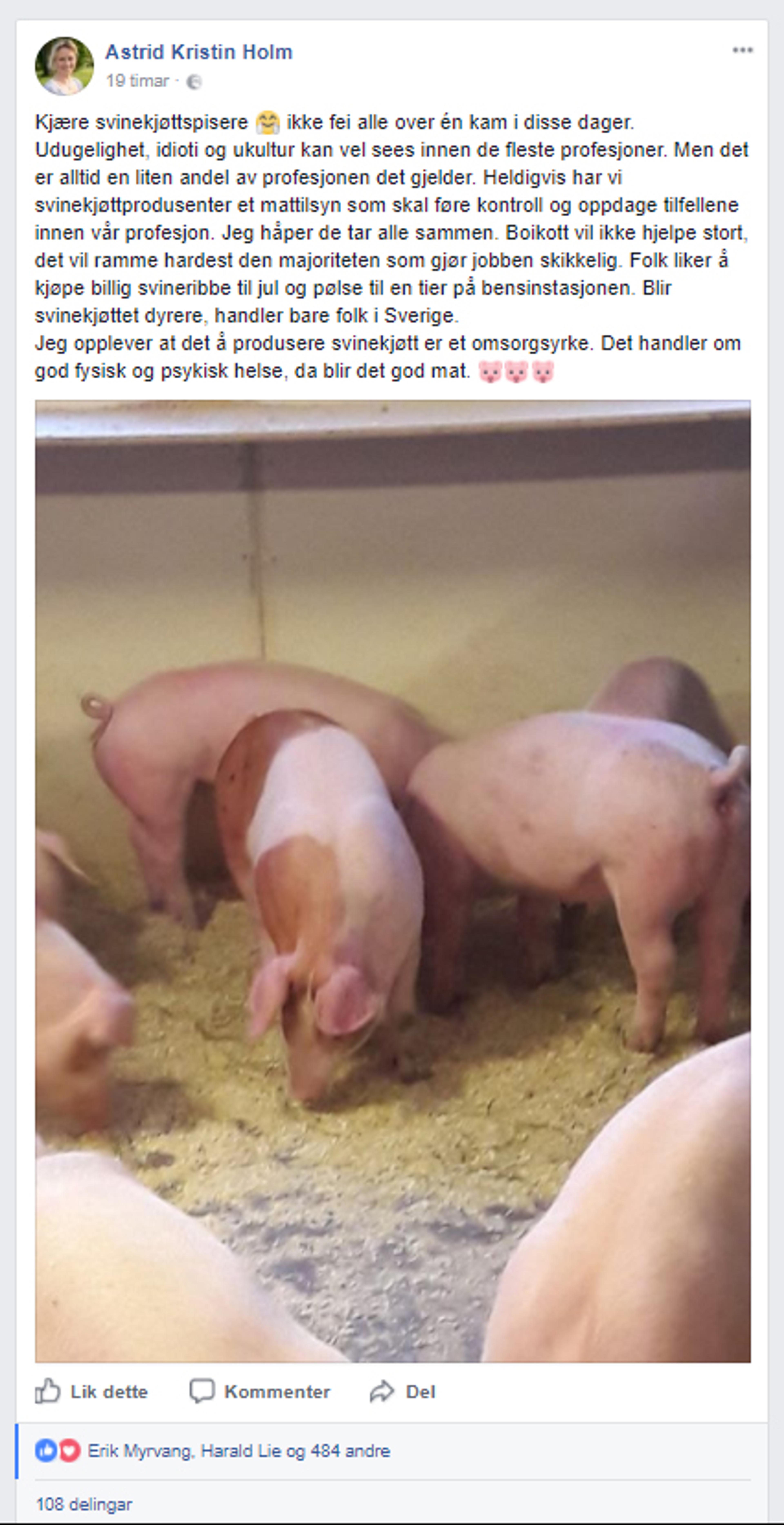 Det fikk Astrid Kristin til å svare med en engasjert tekst sammen med et bilde av glade og friske griser.