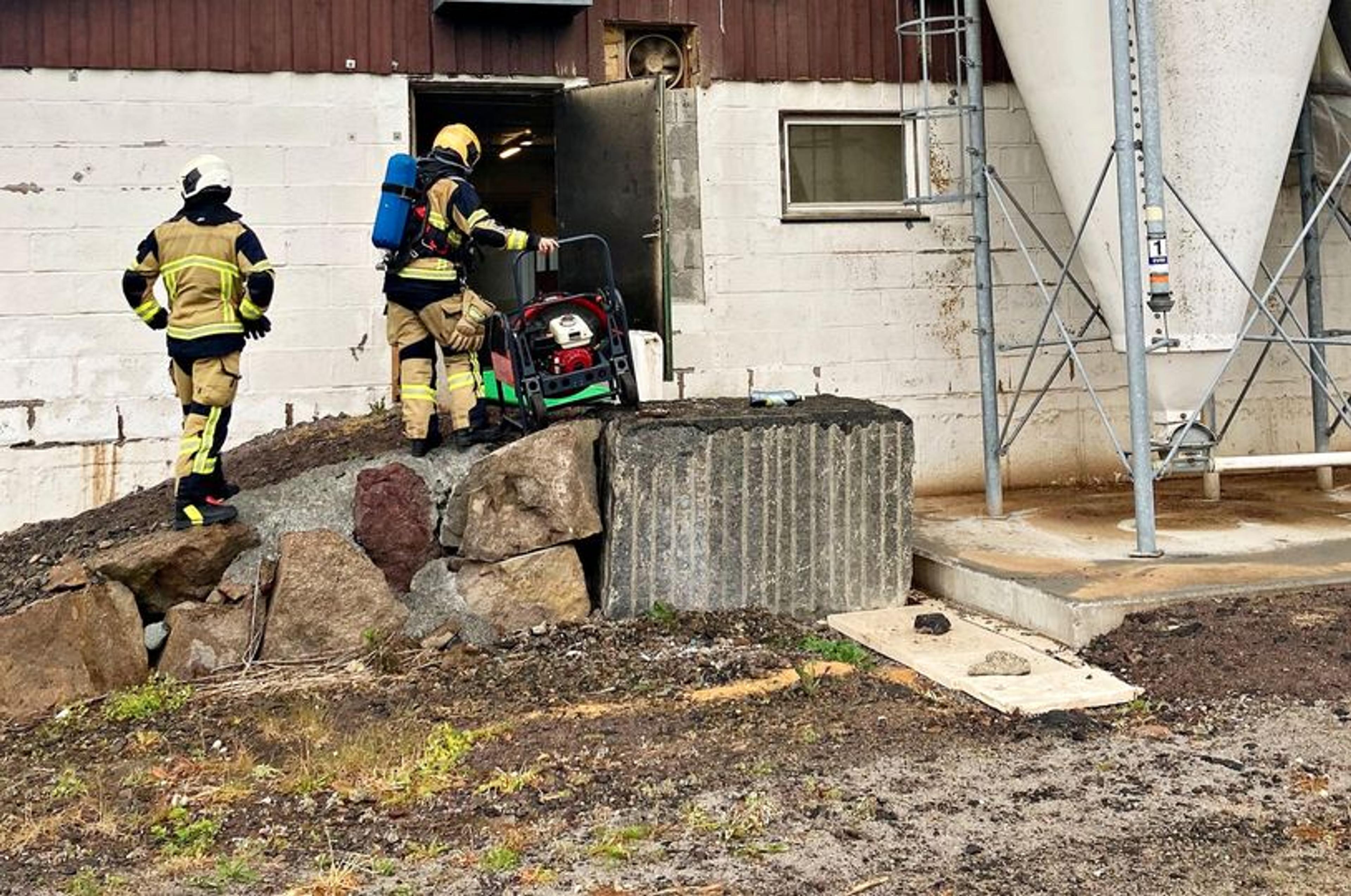 – Vi lufter ut gassen fra grisehuset med en stor bensindrevet vifte, forteller brannmesteren på Vestfold Interkommunale Brannvesens sosiale medier.