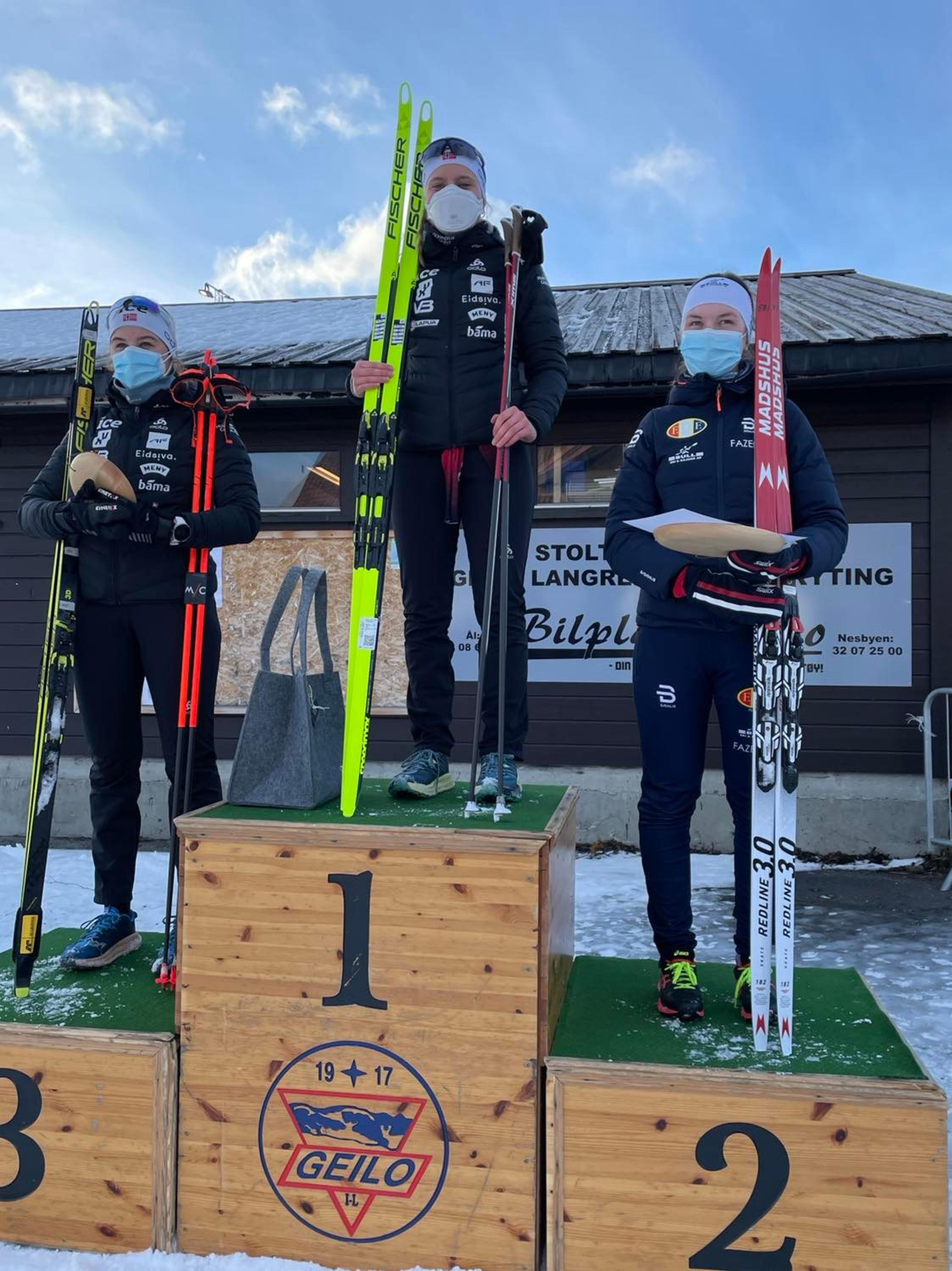 PÅ TOPPEN AV PALLEN – IGJEN: IL Ivrig-jenta Gro Njølstad Randby har i en årrekke vært i norgestoppen i aldersbestemte klasser og de siste åra i juniorklassen. Her står hun på toppen av seierspallen i dagens sprint på Geilo. Foto: Privat.