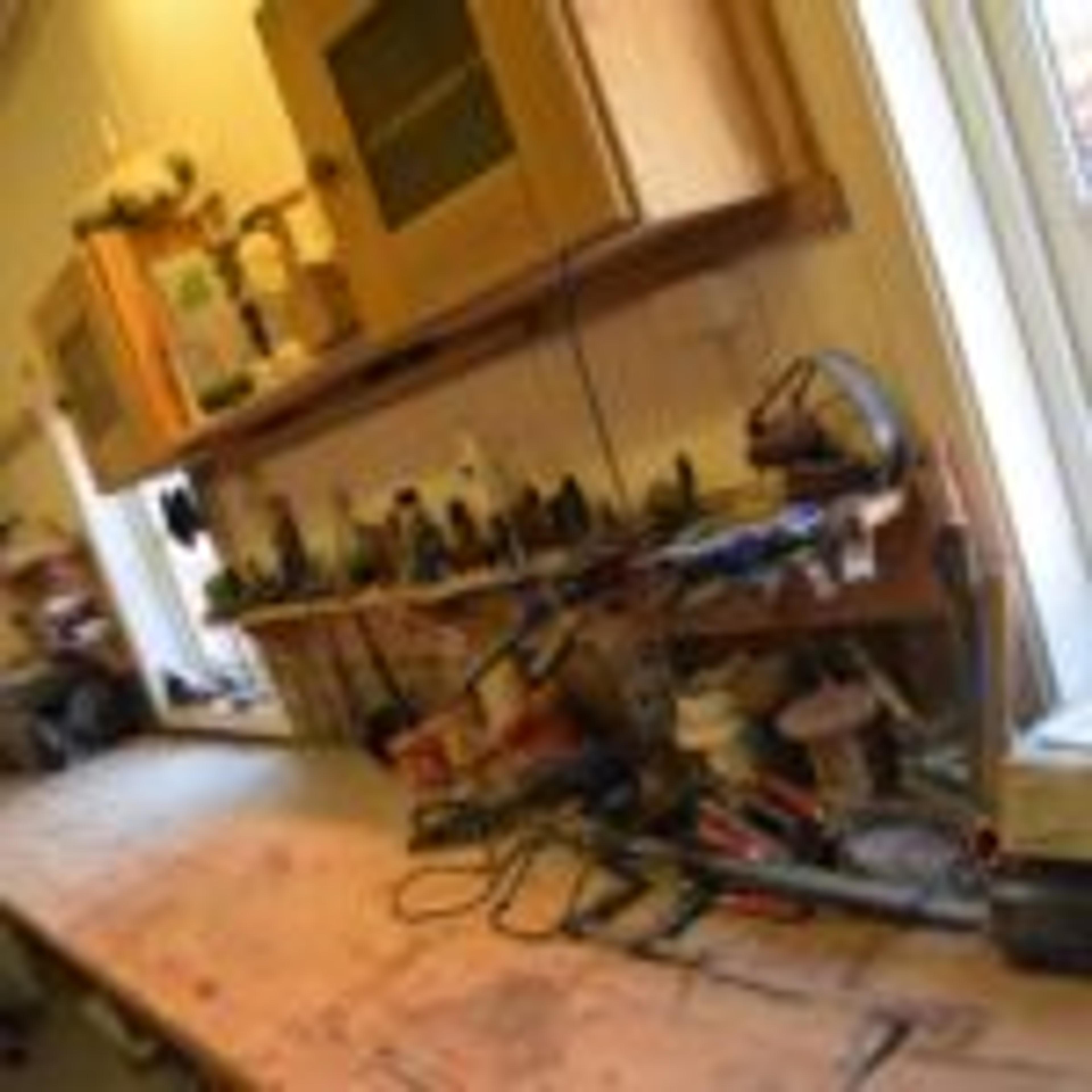 SNEKKERVERKSTED: Det lukter av nylig produksjon i det lille snekkerverkstedet på gården. Foto: Stian Ormestad.