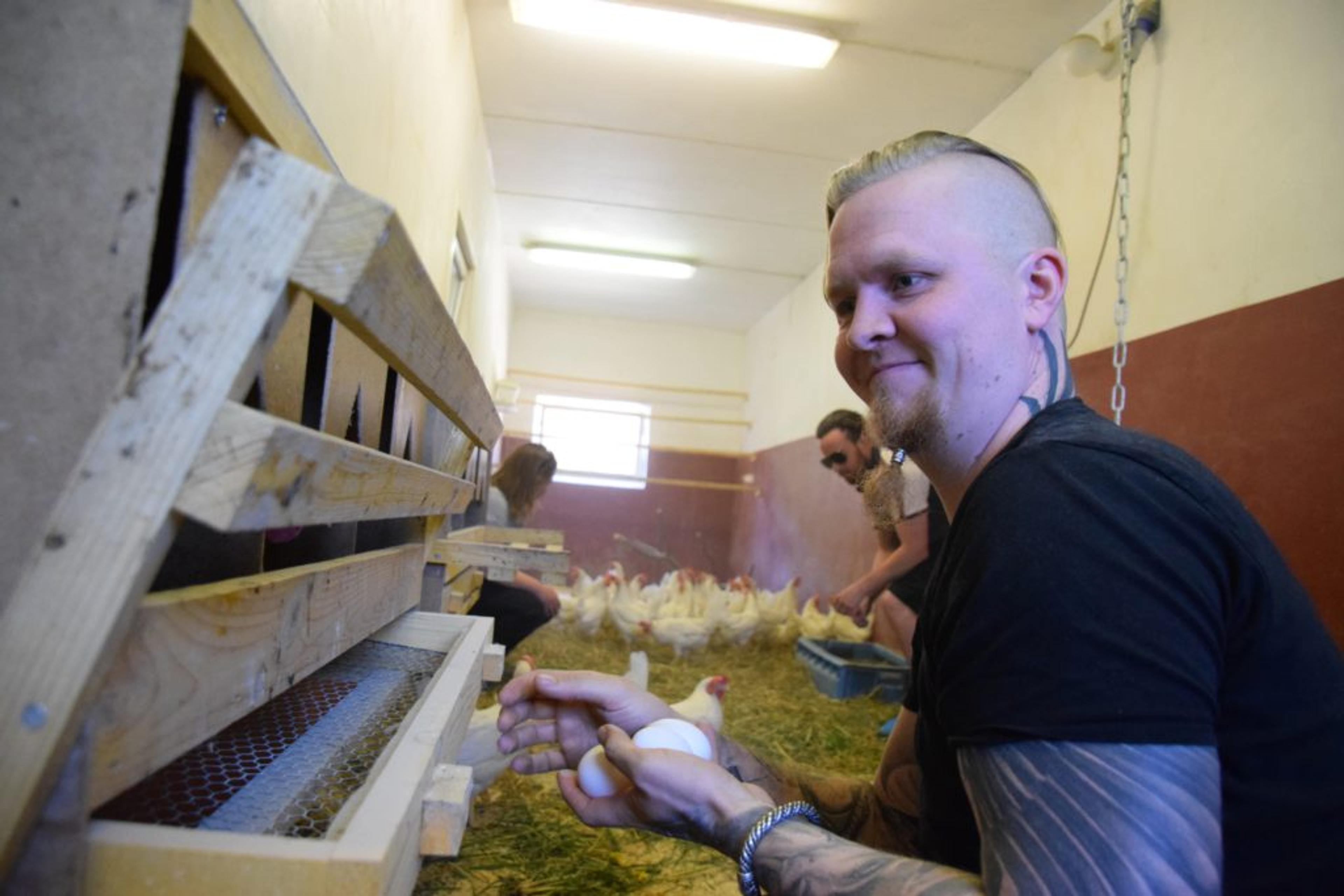 I sommersola fyres grillen opp på Dal gård langs Bjuneveien. Her skal det grilles pølser, etter ei økt med innsamling av egg i hønsehuset. ReAvisa møter fire glade unge voksne, som «ellers hadde sitti og stirra i veggen».