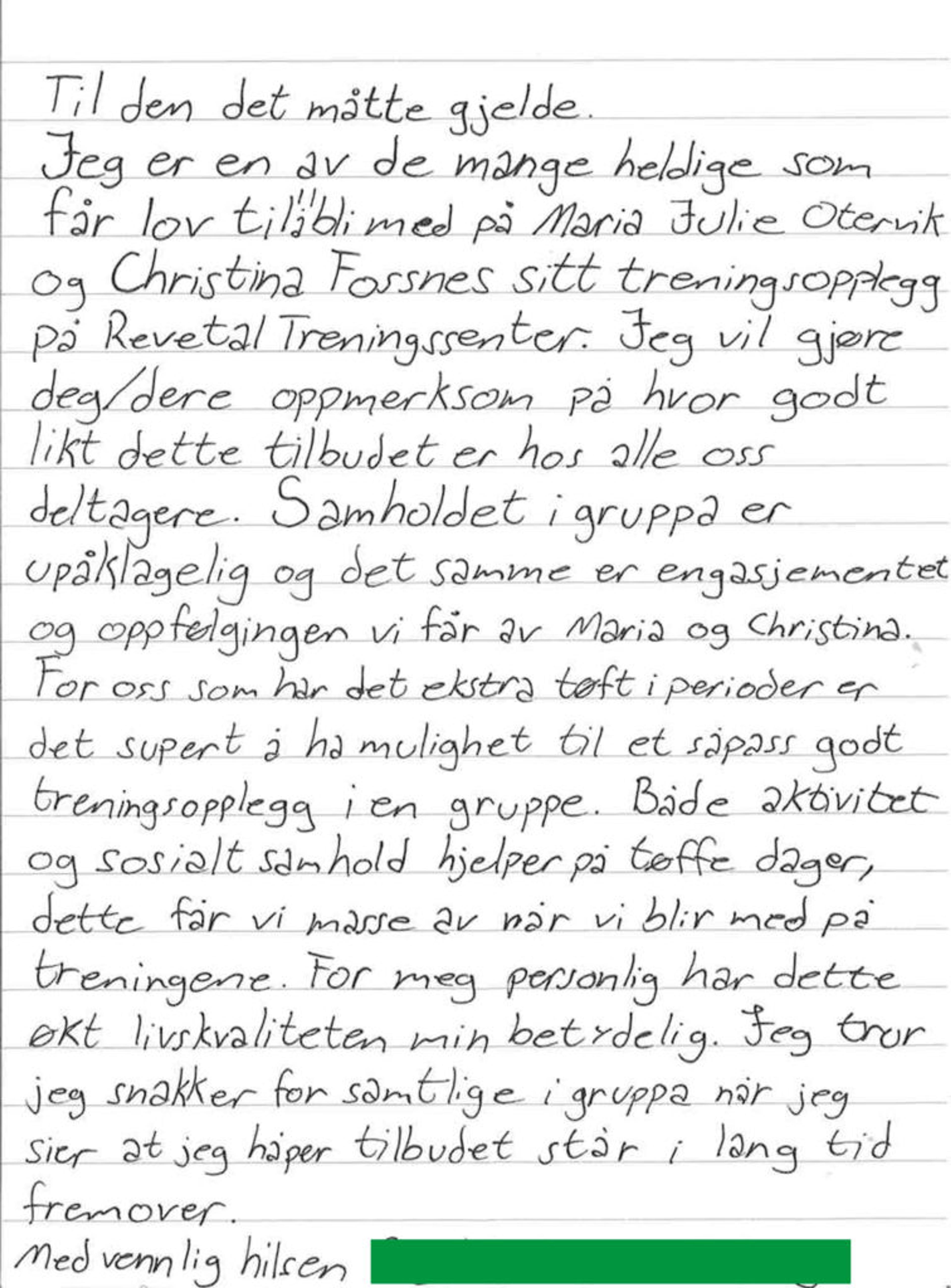 Det forteller Hæge Stenstrøm, Re kommune-ansatt spesialsjukepleier som primært er på Dal gård. Hun har med seg Maria Otervik, som også har starta opp et treningstilbud sammen med Christina Fossnes. Da møtes deltakerne på Revetal treningssenter for ei treningsøkt.