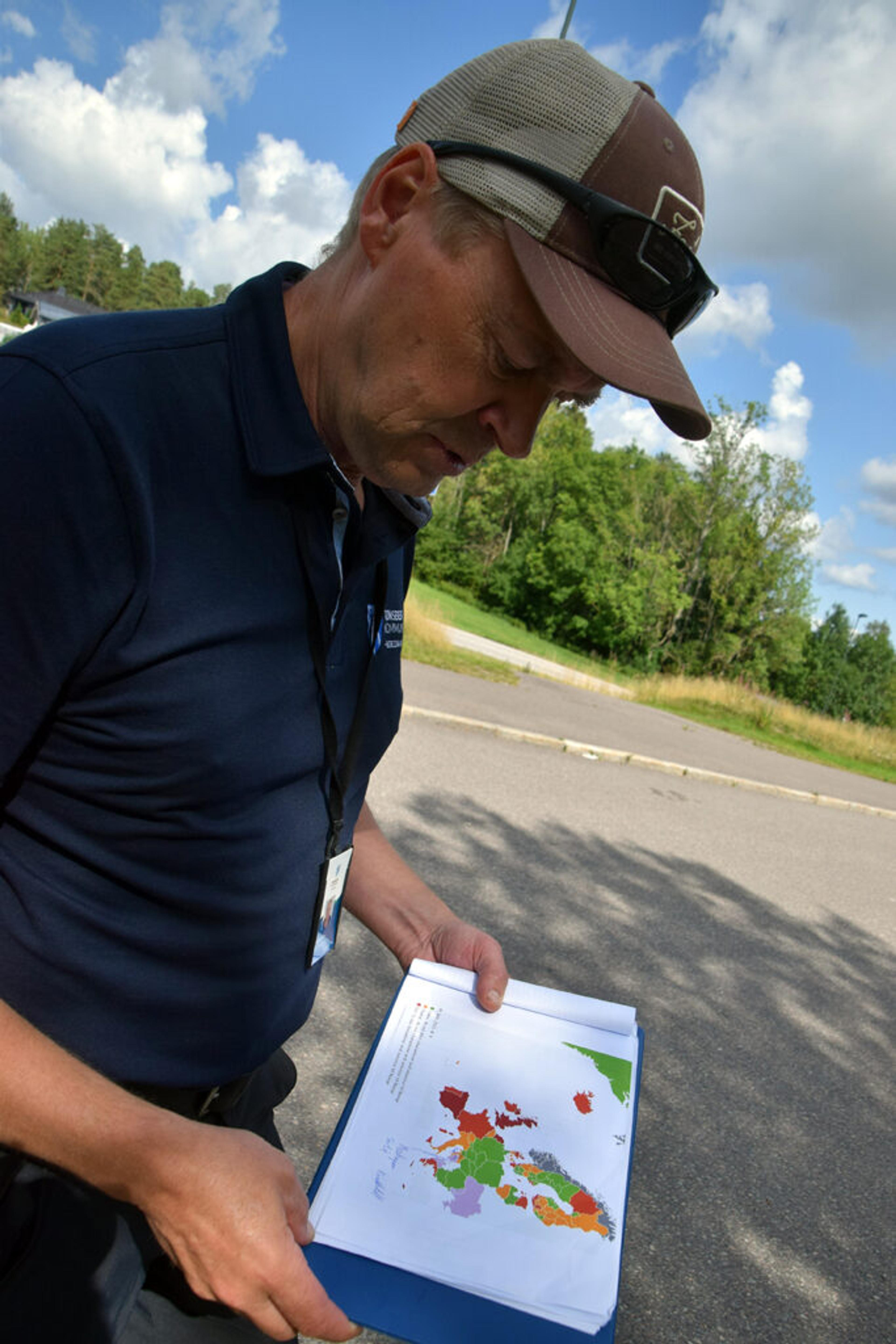 FARGEKART: Hans Petter Gulliksen skal ha oversikt over forskrifter og ikke minst det til enhver tid gjeldende fargekartet som oppdateres hver mandag. Da teller det hvor og når man har reist, og om man er vaksinert eller ikke. Foto: Stian Ormestad.