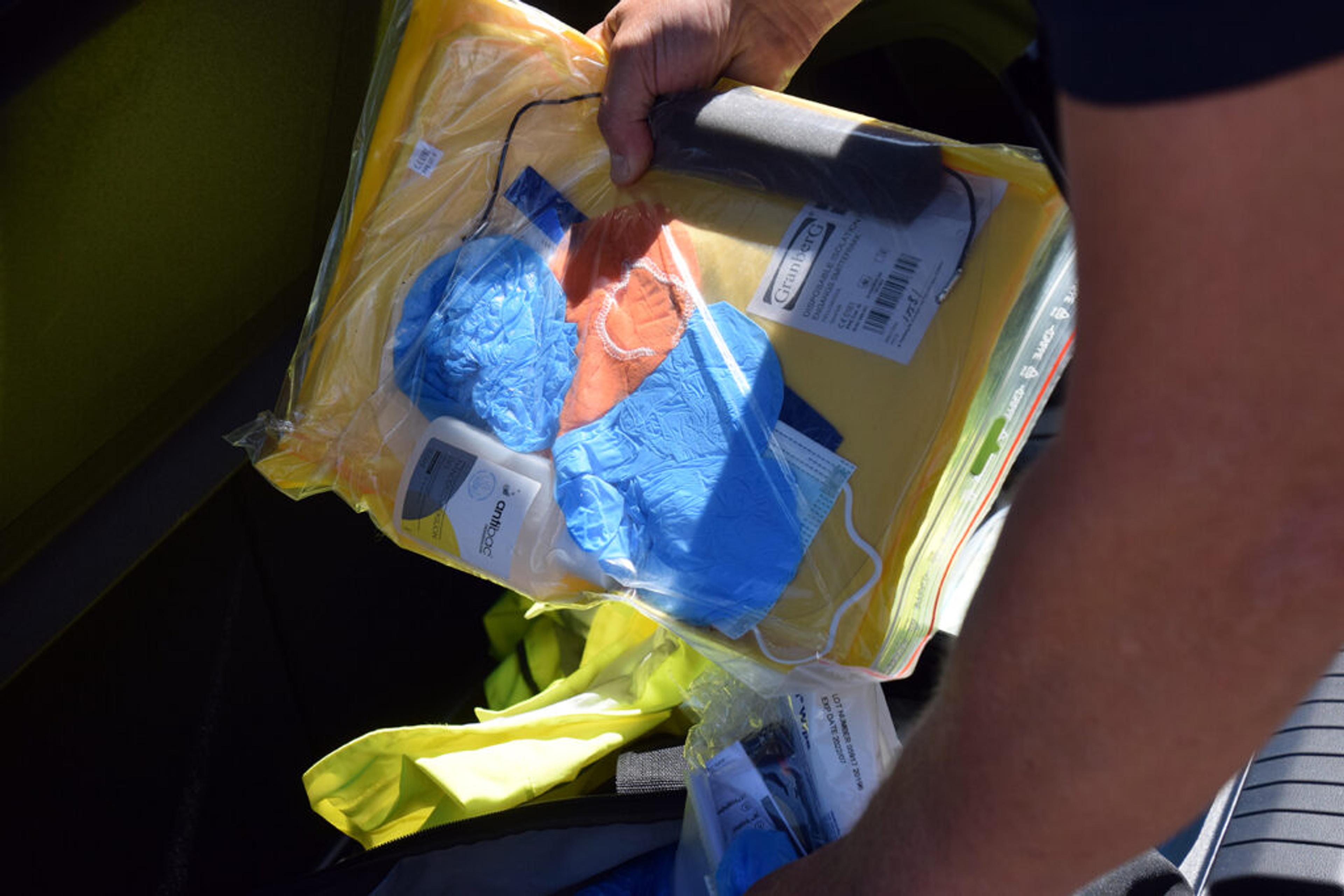 SMITTEVERNUTSTYR: Bilen er lasta med smittevernutstyr, alt fra munnbind til heldekkende «ebola-drakt». Oppgaven er å sjekke at folk er der de har oppgitt at de skal være. Og at de skjønner hva karantene betyr. Og at de veit hva som gjelder for testing og avslutting av karantene. Foto: Stian Ormestad.