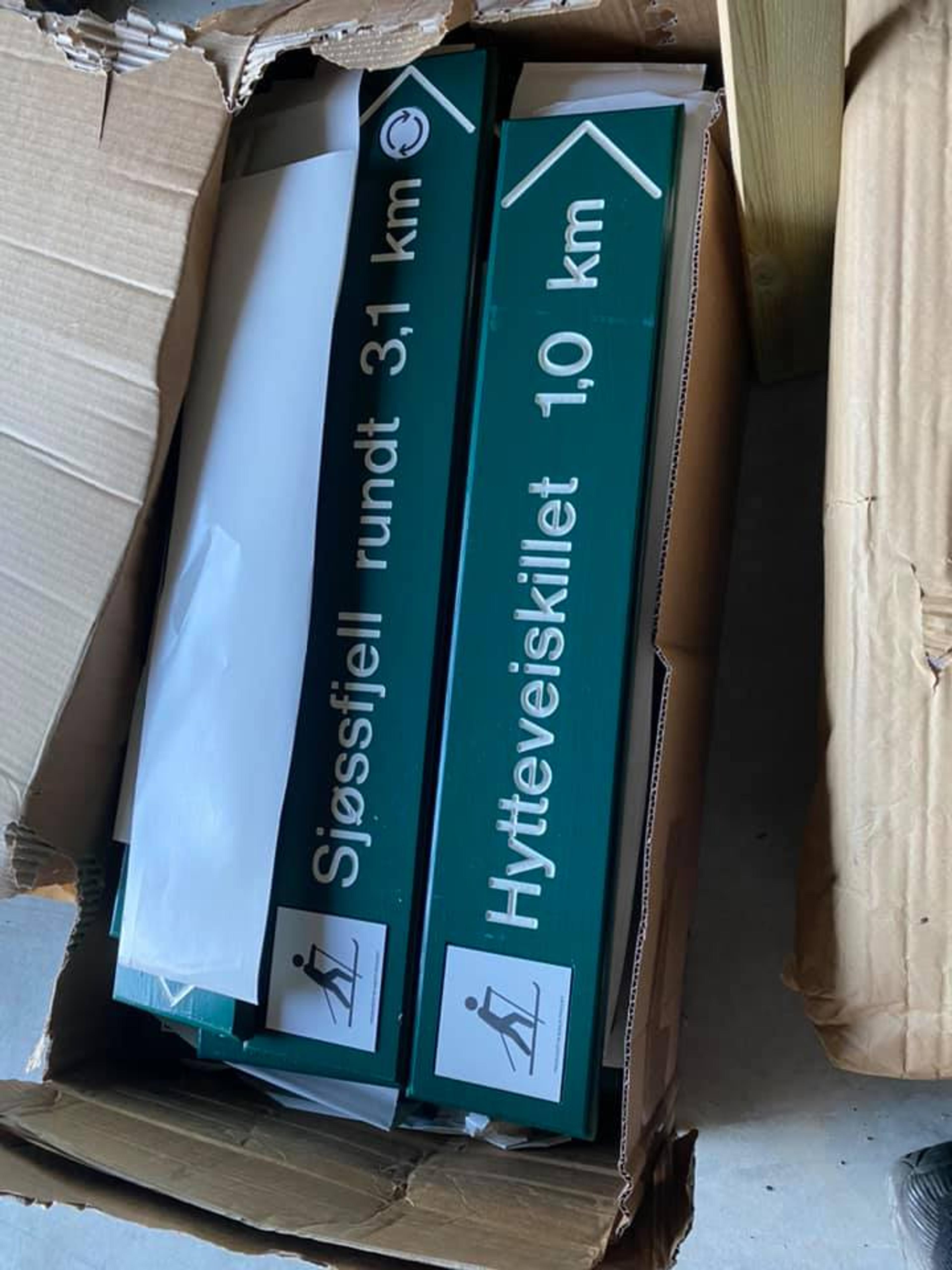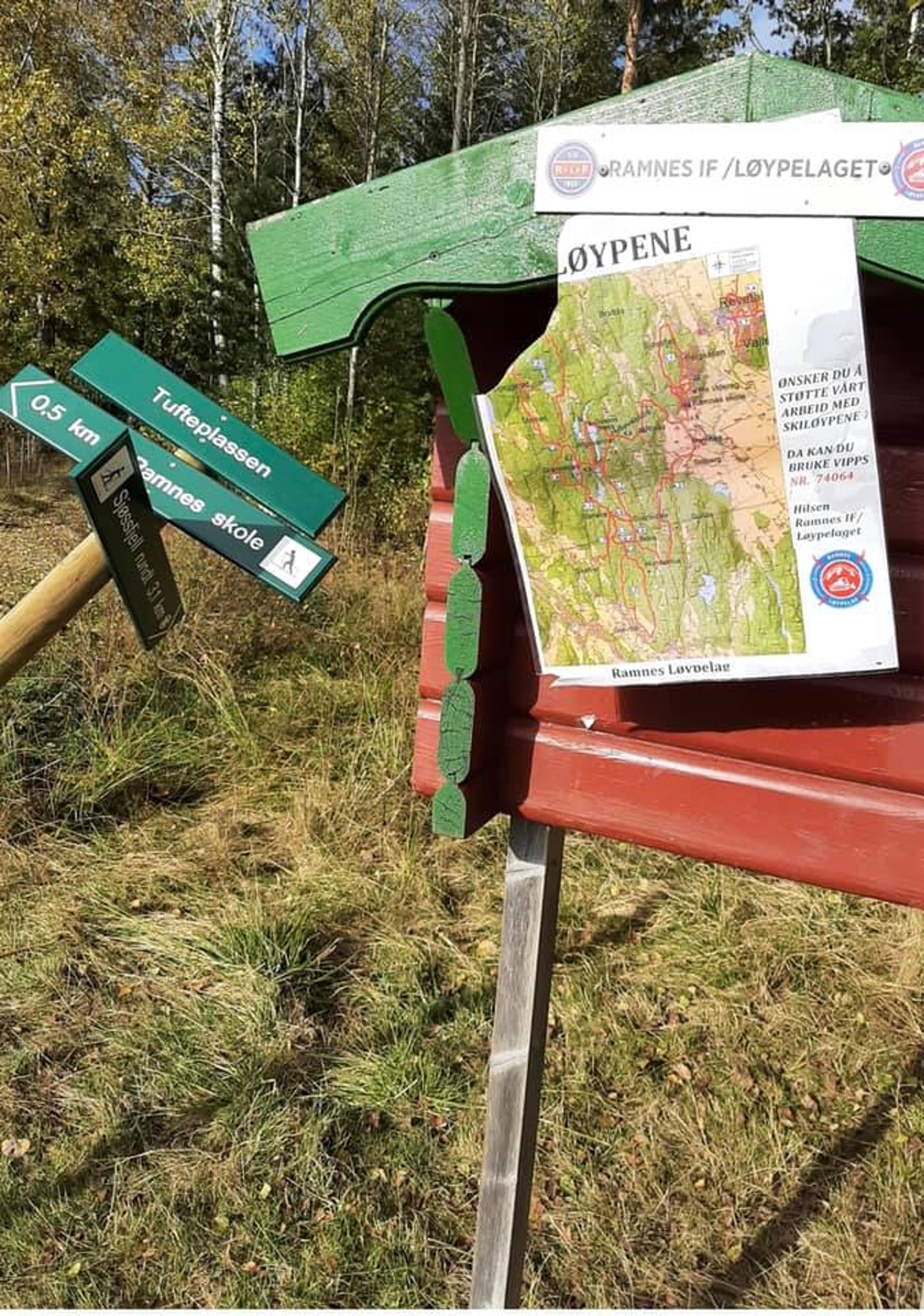 TILSKUDD: Ramnes IF fikk i år 30.000 kroner fra kommunen som er blant annet blitt brukt på nye skilt i Re-løypene. Dugnadsfolk i Ramnes løypelag har montert skiltene i løpet av denne høsten. Foto: Privat.