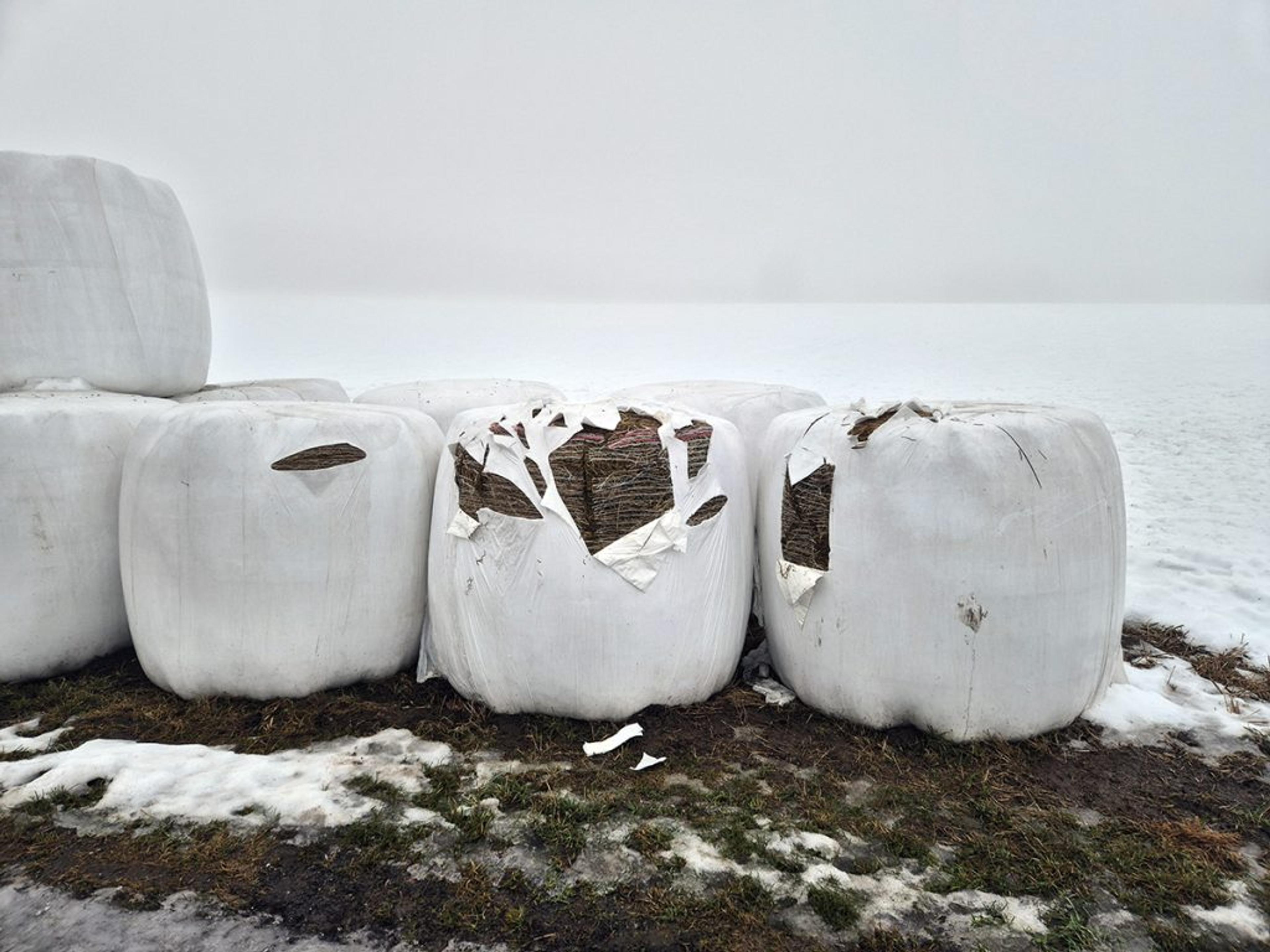 KJEDELIG: Plastikken rundt rundballene er kutta opp. Nå har bonden henta dem inn for at innholdet ikke skal bli ødelagt. Foto: Privat.