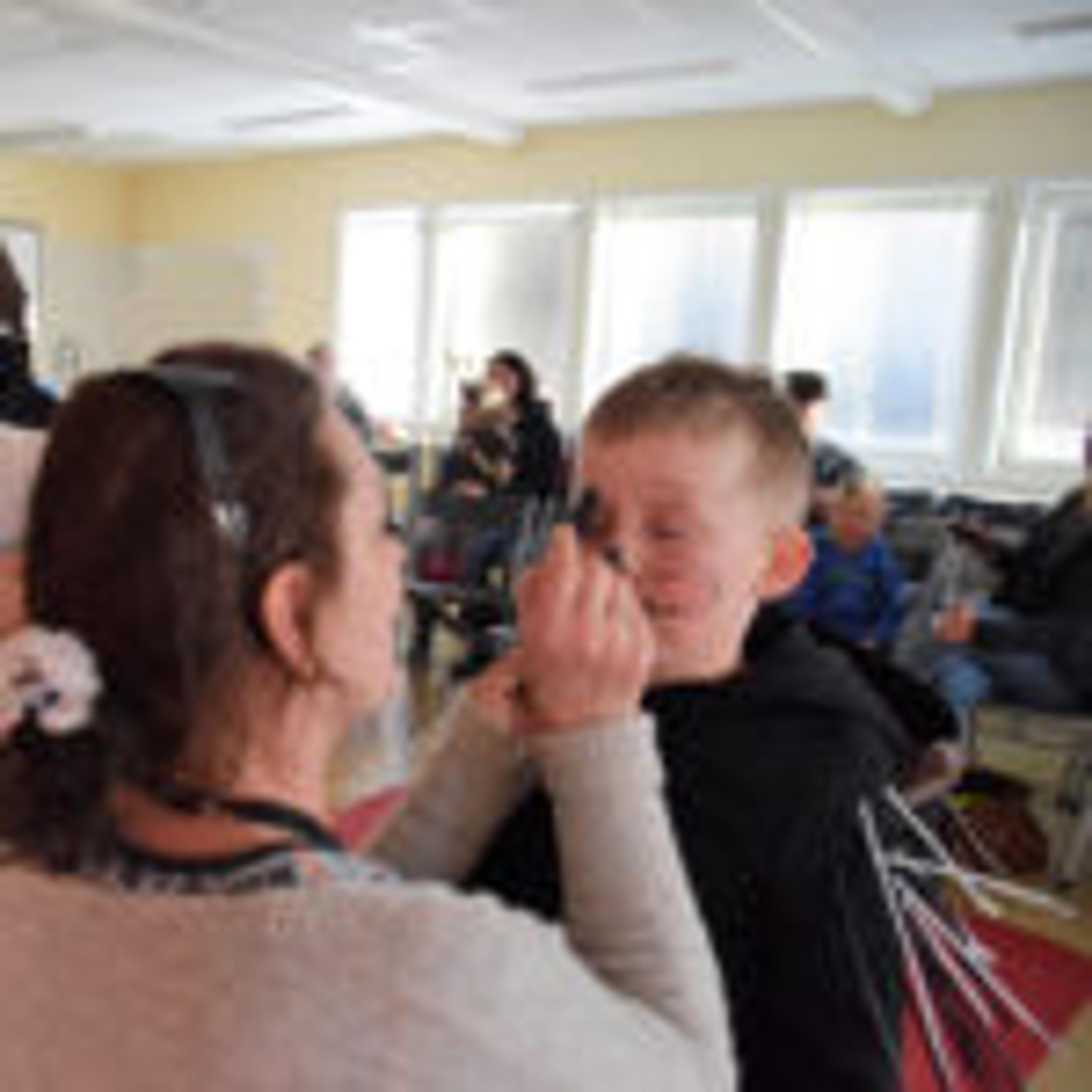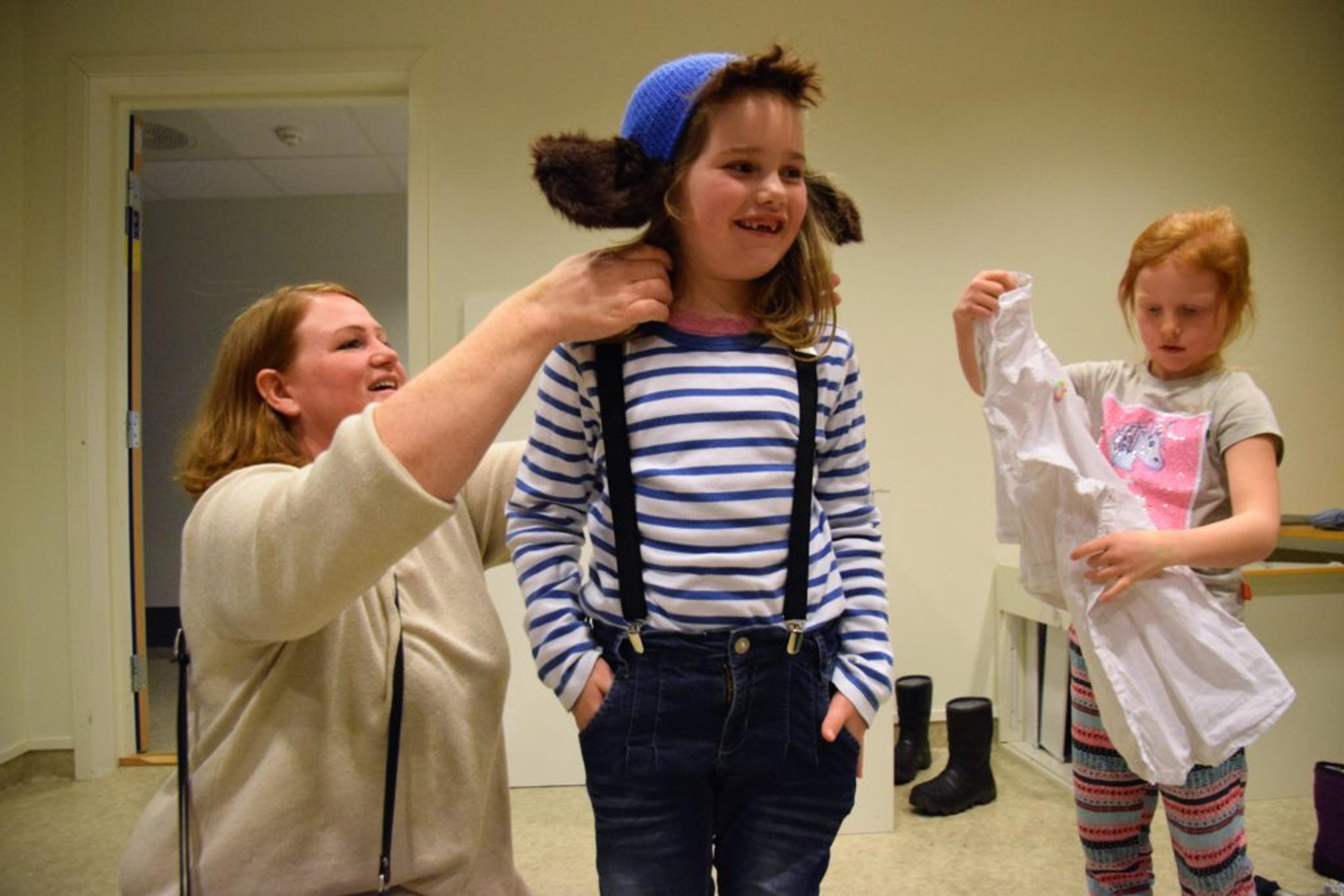 Emrik Silbodal (6) fra Grettebygd skal spille pinnsvin. Lærer Mone Karin Wohl legger et lite lag med mørk sminke før teppet skal gå opp. – Men jeg skal IKKE ha masse skjegg!, sier en bestemt 6-åring.