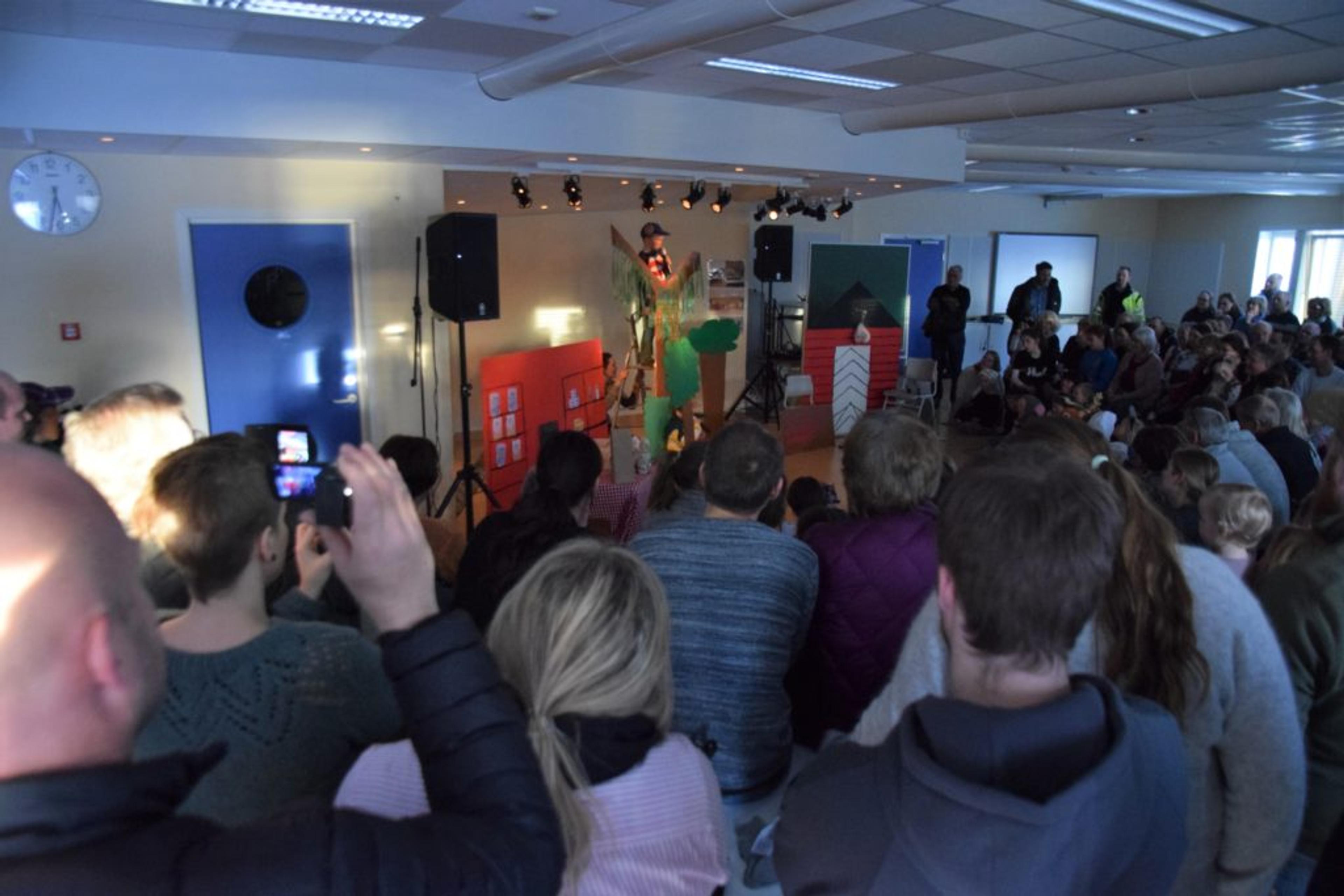Det fyller seg med folk før forestillingen skal starte. Så mange kommer, at lærer Irene Vivestad Aske sammen med noen foreldre må løpe og hente mange flere stoler. En god del måtte likevel stå.