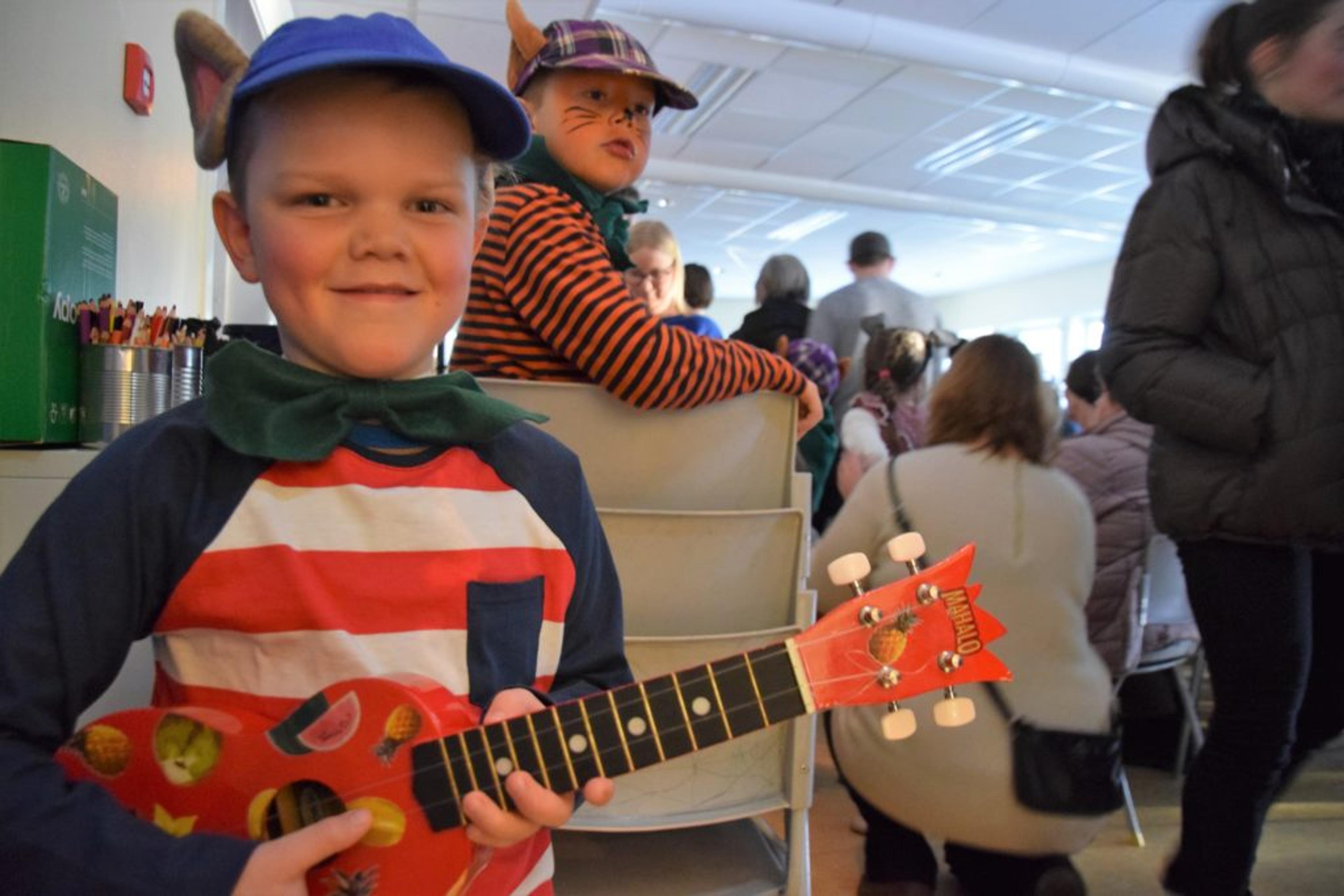 KLATREMUS: Olav Prosvik Aarvåg (6) viser stolt fram den flotte gitaren til klatremus. Musenesa kom på plass rett før teppet gikk opp. Foto: Stian Ormestad.
