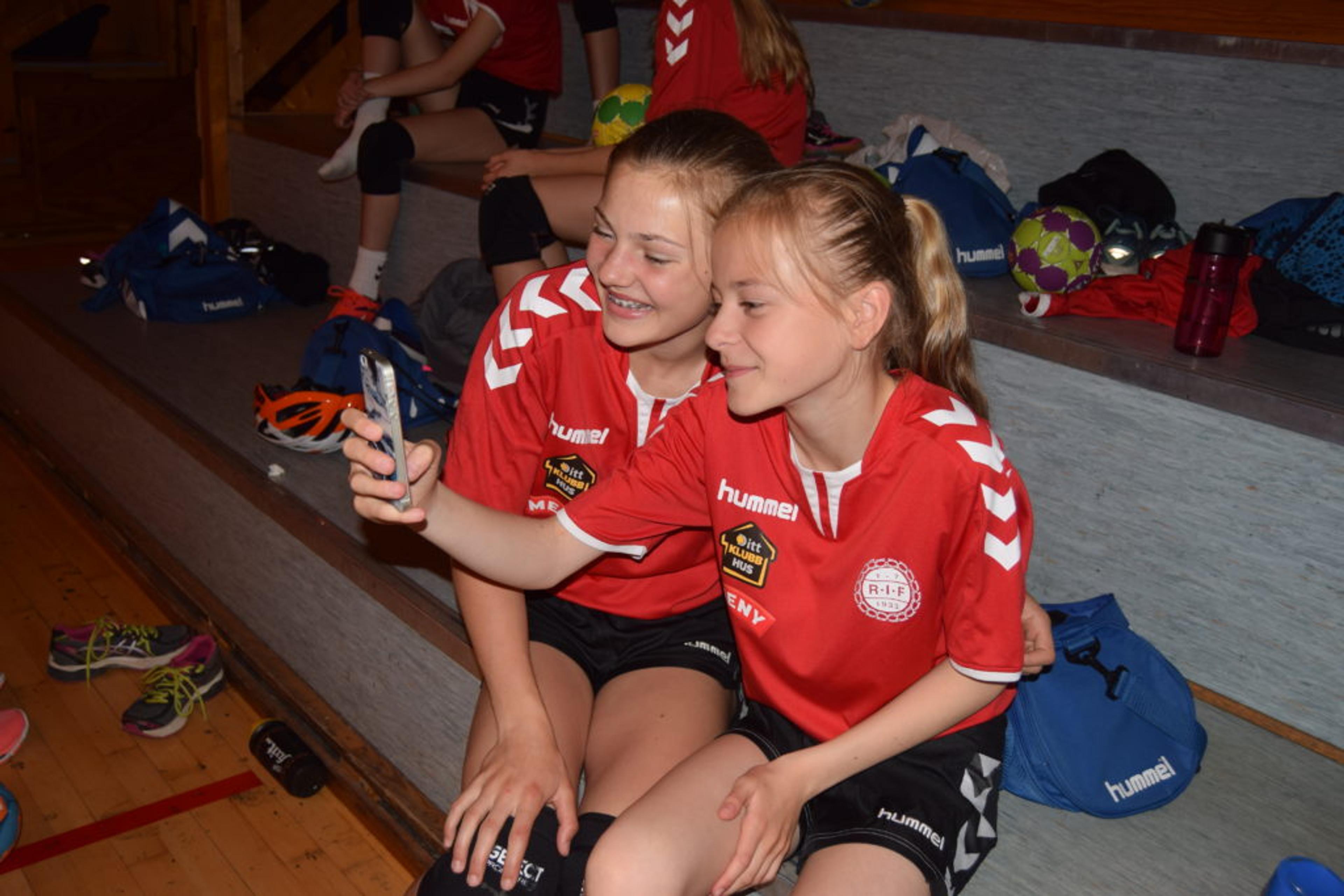 HÅNDBALLSKOLE-SELFIE: Lykke Amalie Amundsen og Silje Myhre tar her et bilde som minne fra årets håndballskole i Ramneshallen. Foto: Håkon Westby.