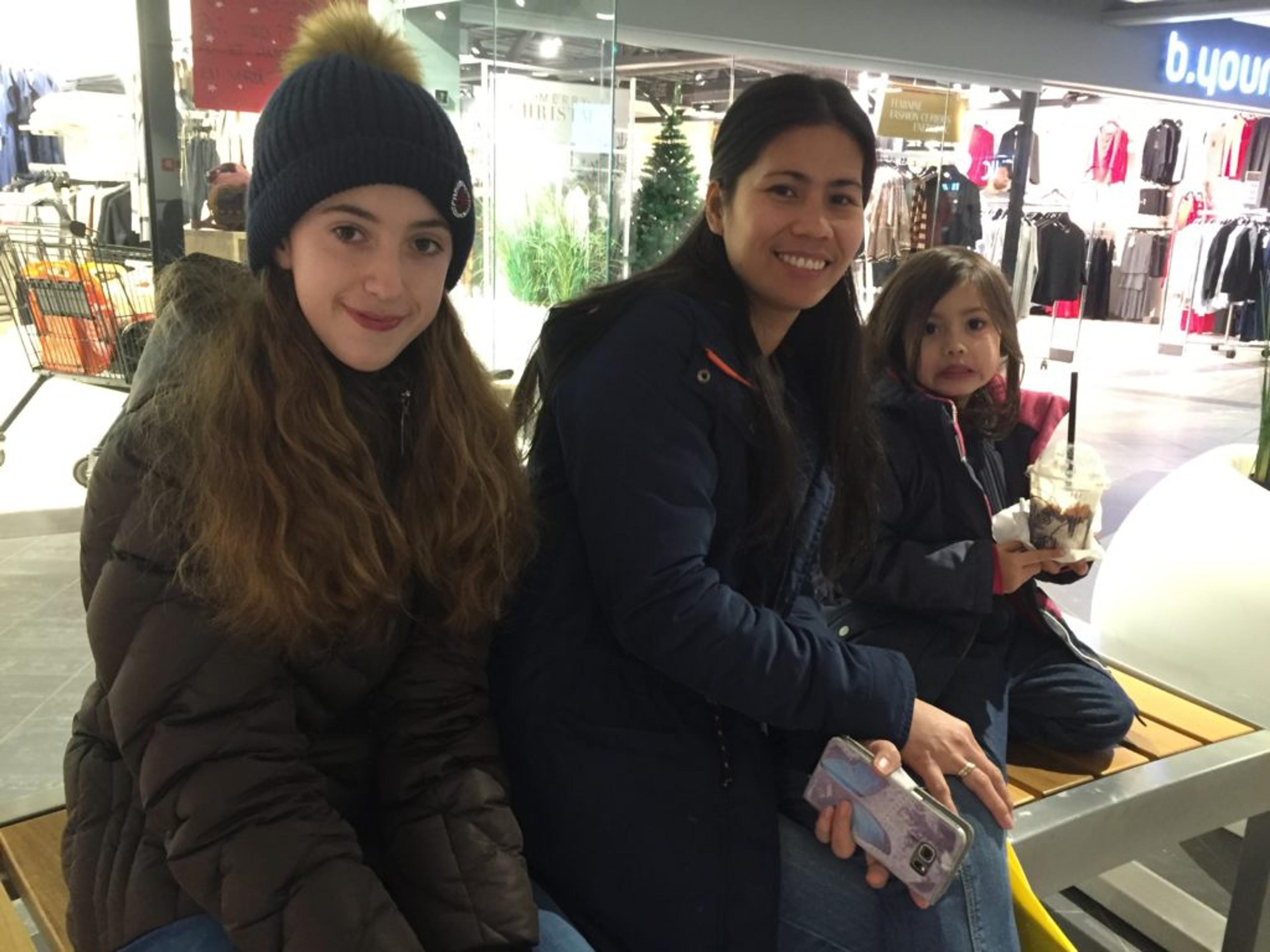 KOSER SEG PÅ RE-TORVET: Maryjann fra Våle stresser ned med flotte toner fra flygelet i 2. etasje på Re-torvet sammen med døtrene og Kristina (11) og Katelyn (5). Foto: Stian Ormestad.