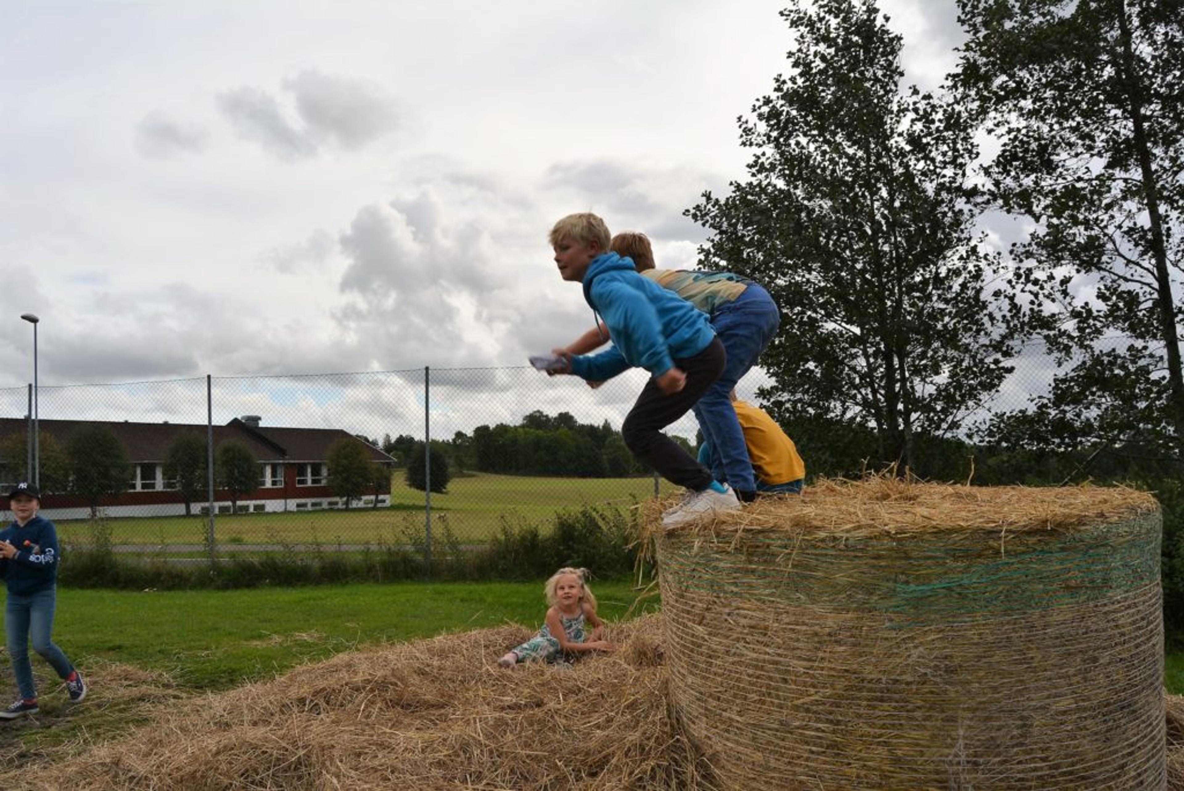Gutta som hopper fra halmballen er helt enig med søskenparet: – Hoppeslottet er det morsomste!