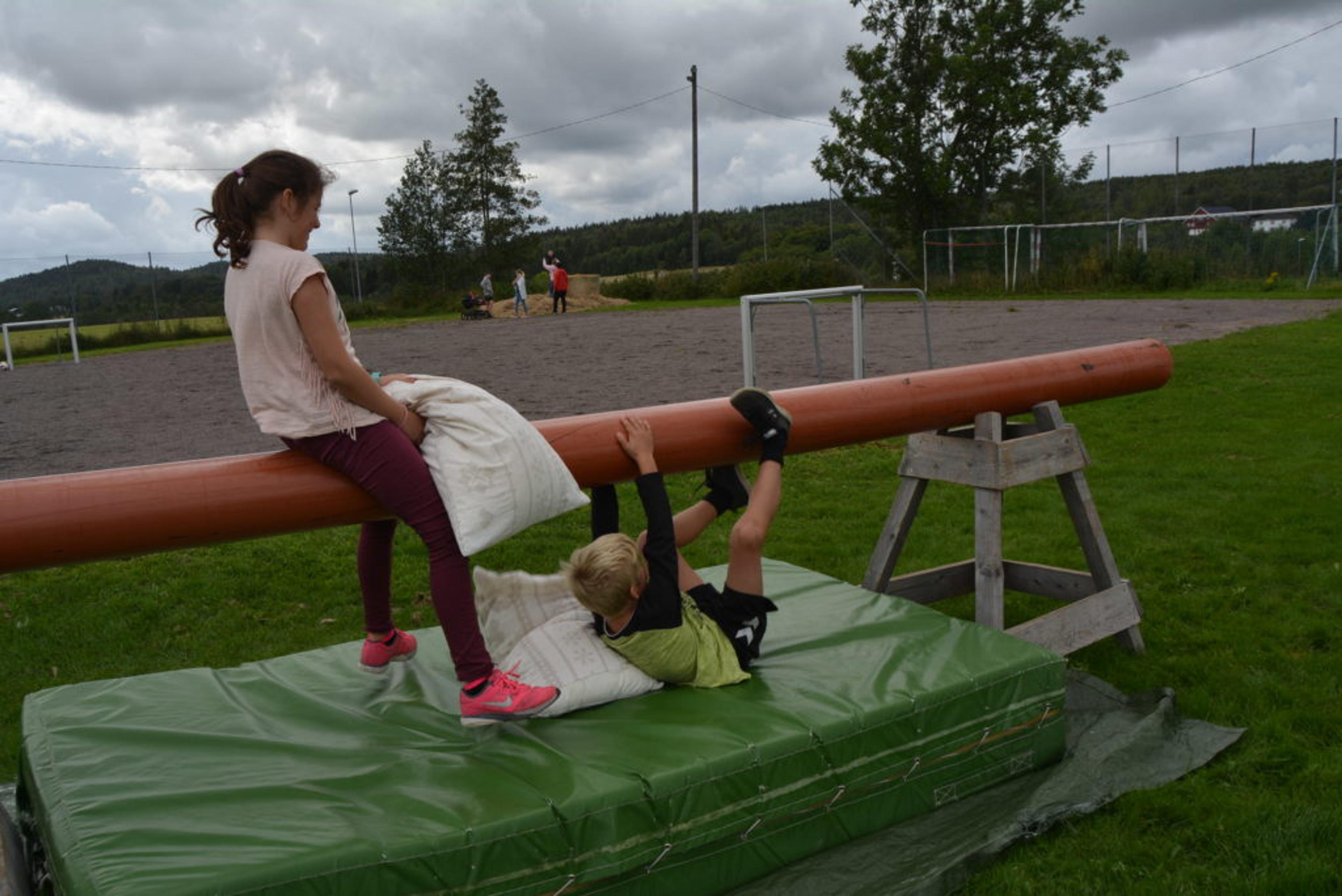 Julie Tveiten (11) og lillebror Jens Tveiten (7) prøvde seg på bommen med putekrig, men de syntes at hoppeslottet var morsomt – og det var de ikke alene om: