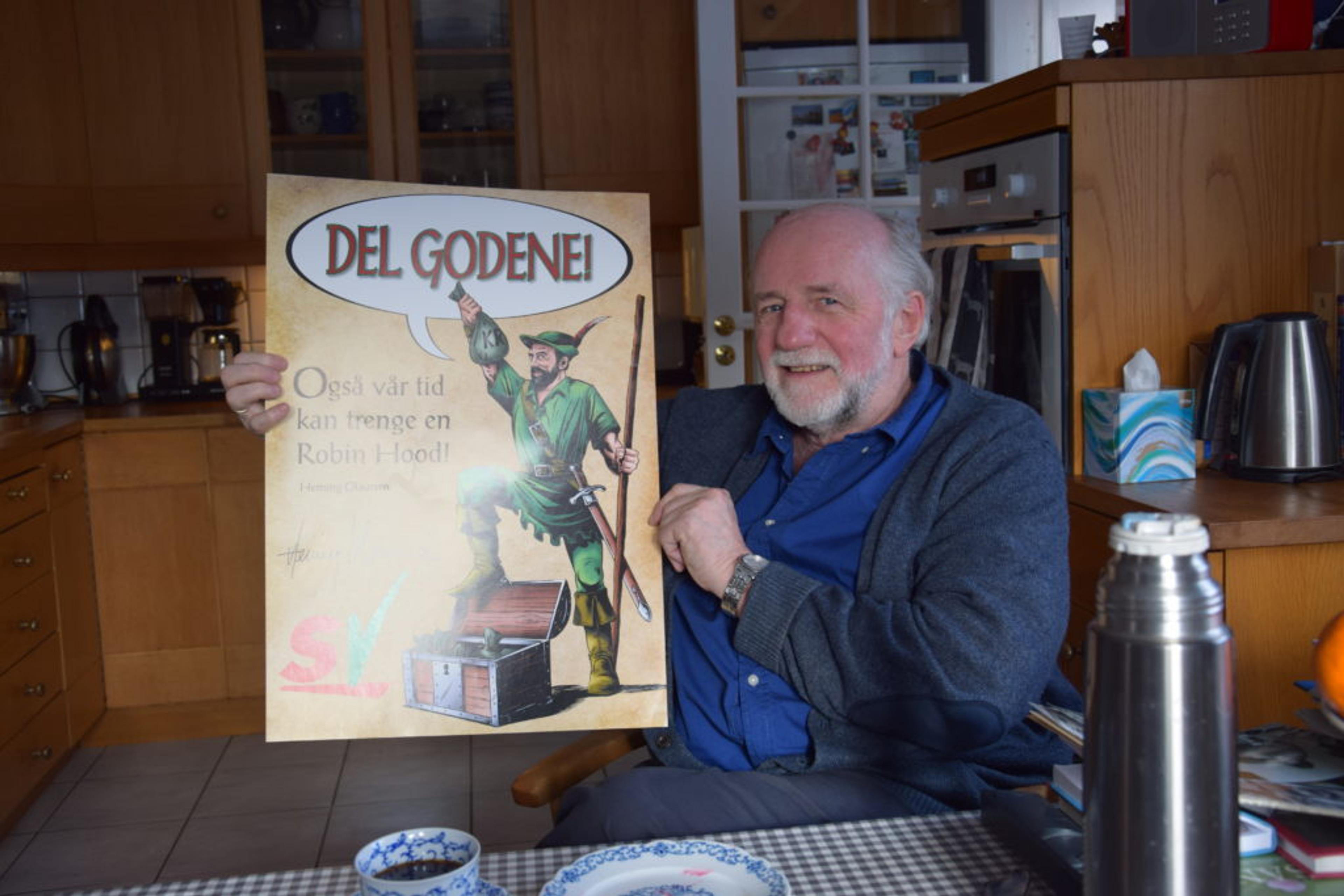 SVs ROBIN HOOD: Tegneren Sven Nyhus’ valgkampplakat til stortingsvalget i 1997, med Heming Olaussen som Robin Hood. Foto: Håkon Westby.