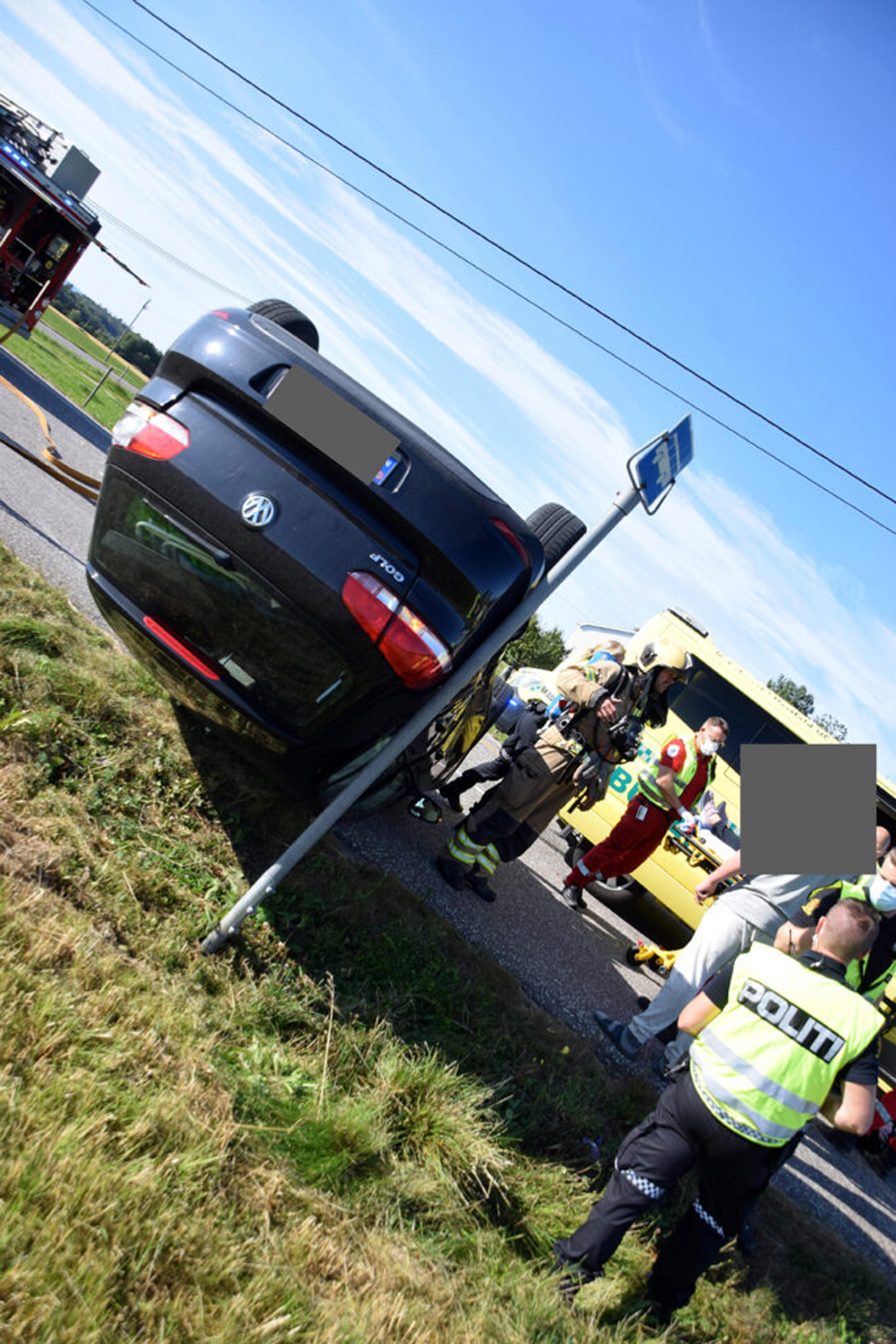DRAMATISK: Den ene bilen gikk kast i kast på taket og havna inne på busslomma. Foto: Stian Ormestad.