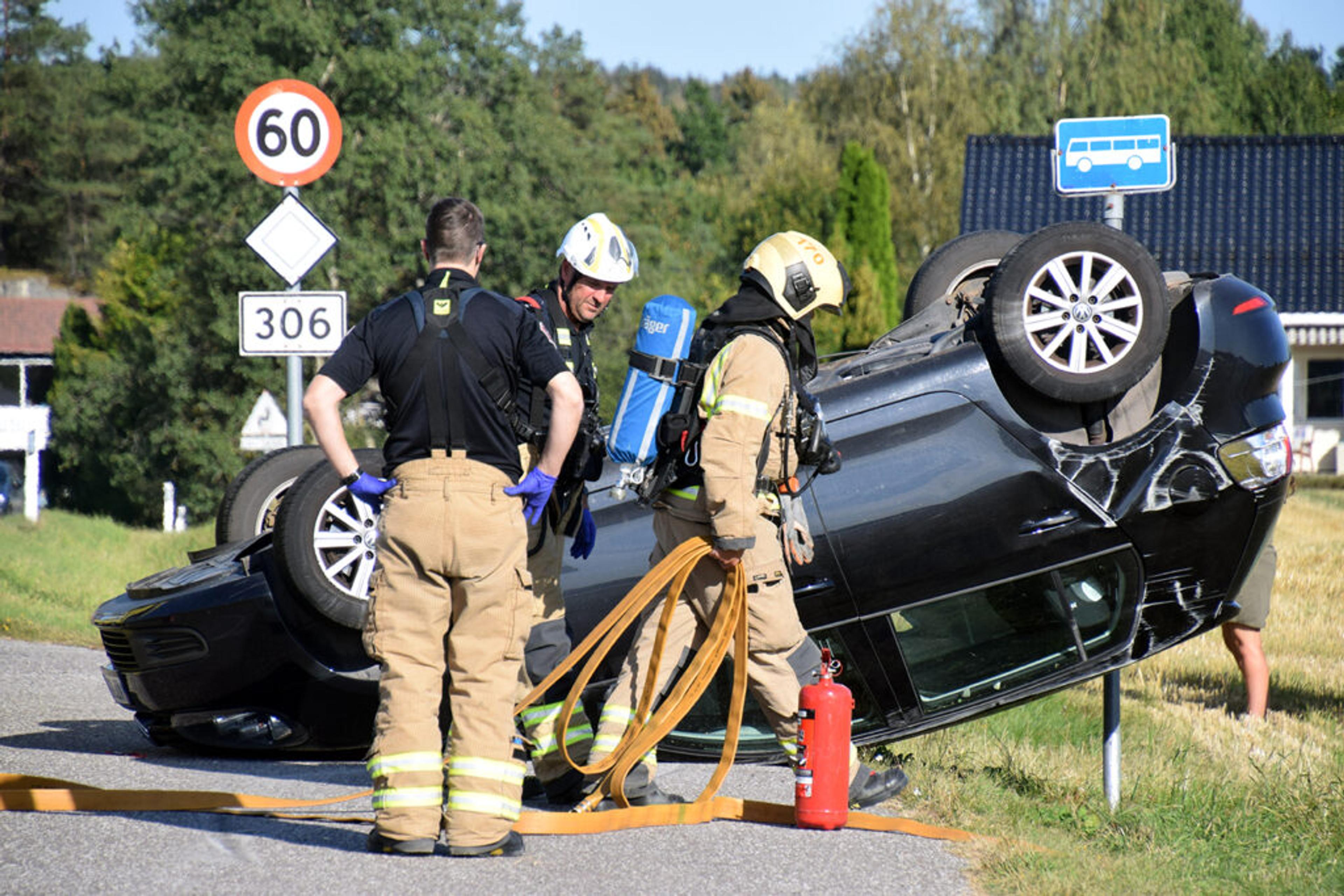 BRANNMANNSKAP RYDDER OPP: Bilen vippes på hjula igjen ved hjelp av stropper og en brannbil. Foto: Stian Ormestad.