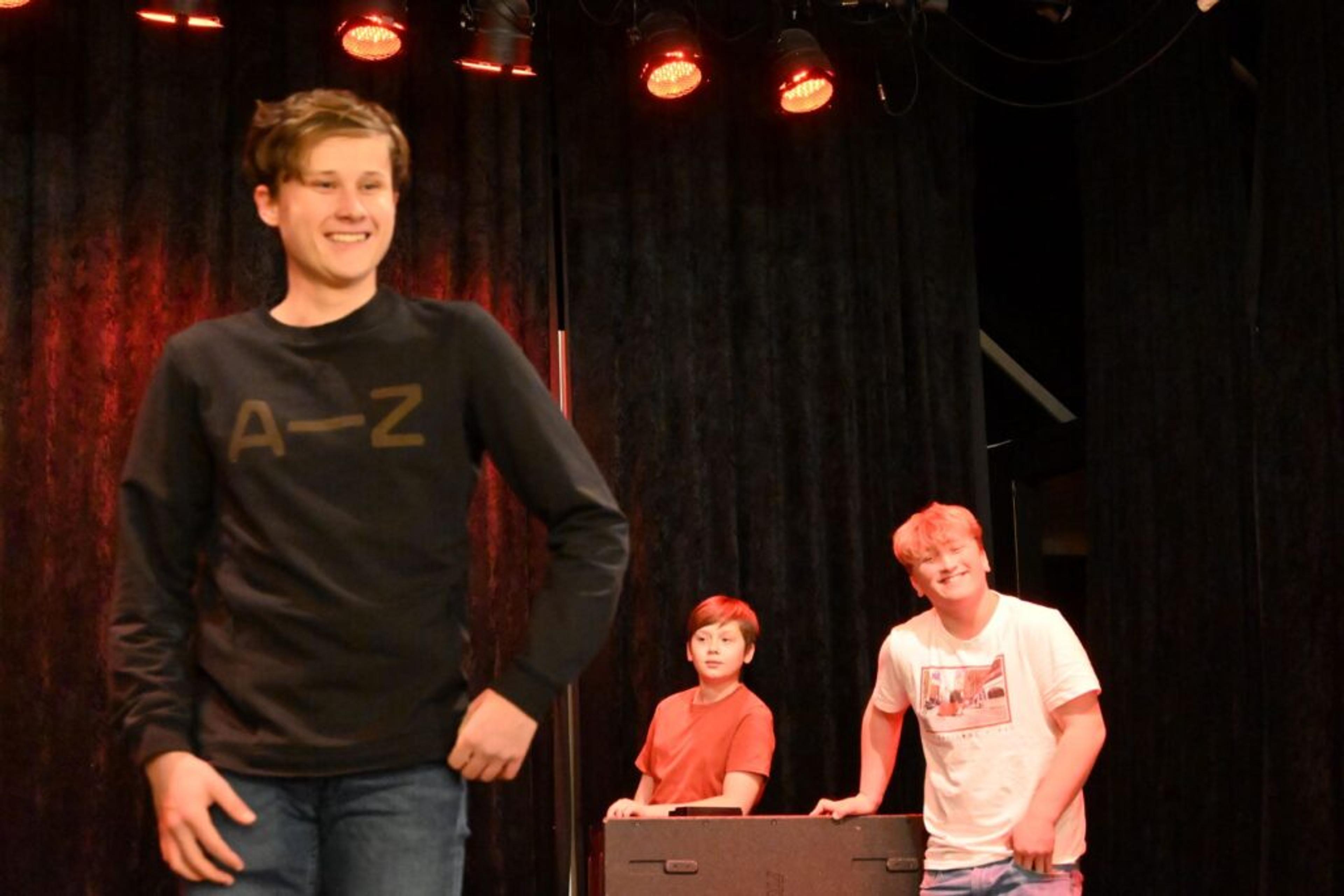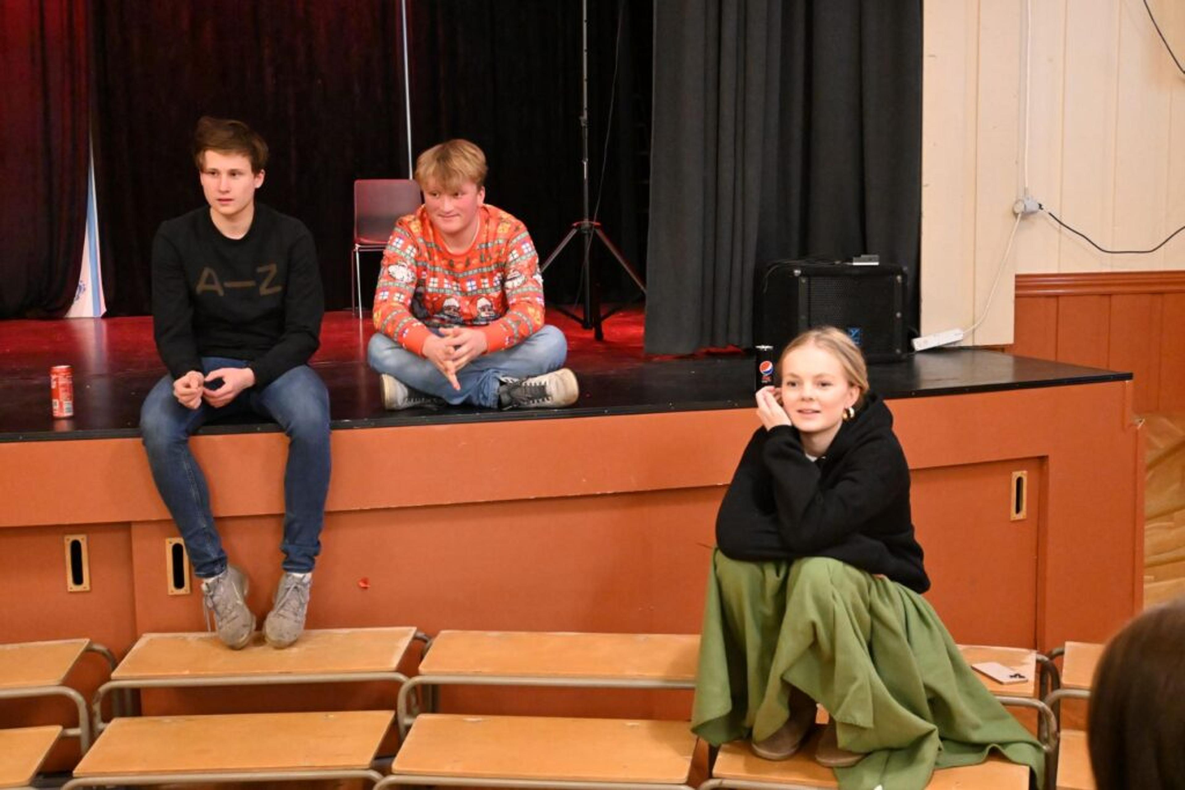 SHOWER: Manuset må jo prøves ut på scenen! Kornelius Christiansen, Armandas Kazokas og Ask Grønli tester materialet til latter fra resten av gjengen. Foto: Emma Sofie Gulbrandsen, ReAvisa.