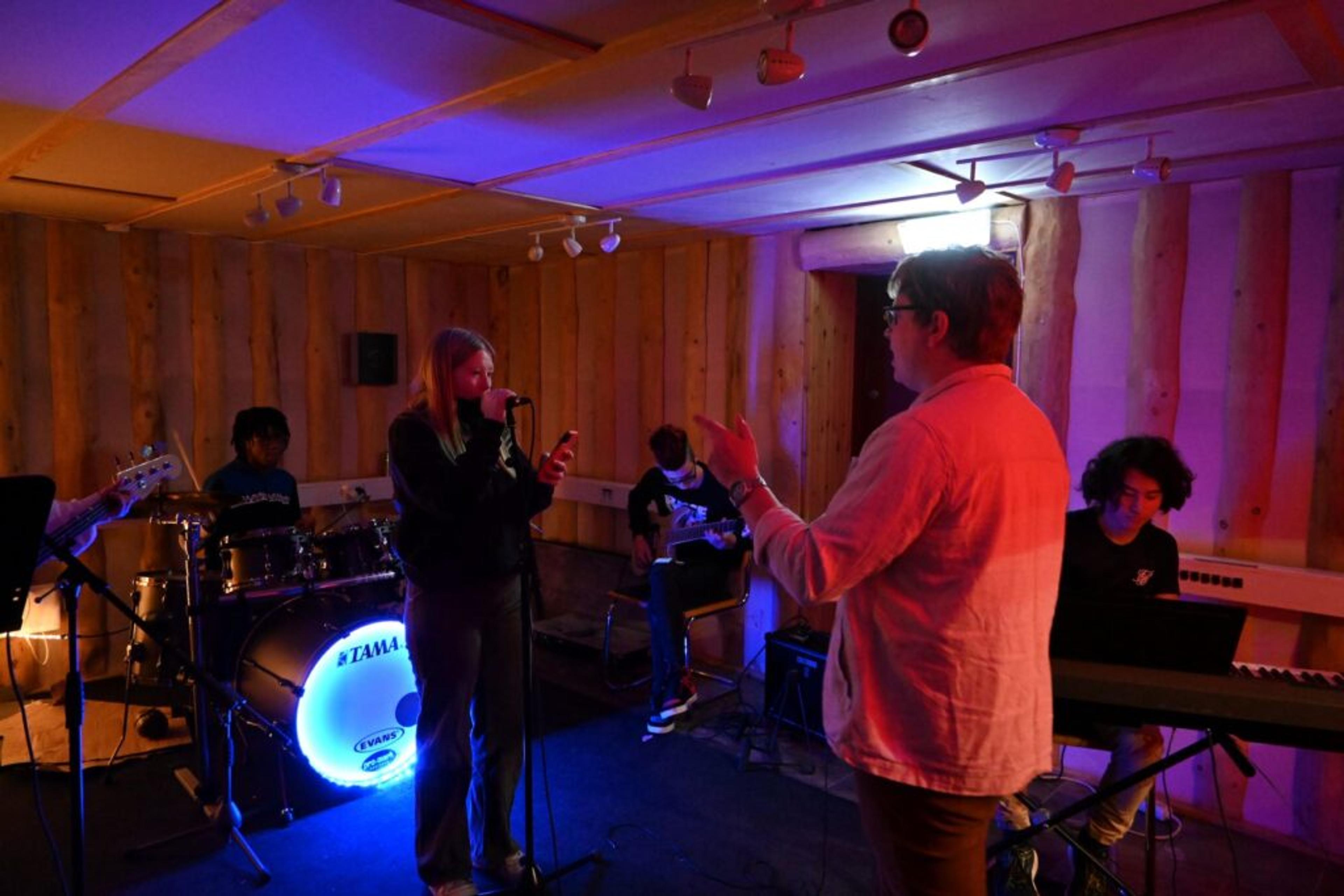 SKIKKELIG TRØKK! Revybandet med Alissa Mahinay Coco på bass, Miguel Edu på trommer, Marit Holtung på sang, Mikkel Bergli på gitar, Truls Tiger Ekeborg på keyboard, og Sindre Gade Johnsen kommer med gode tips og vink. Foto: Emma Sofie Gulbrandsen, ReAvisa.