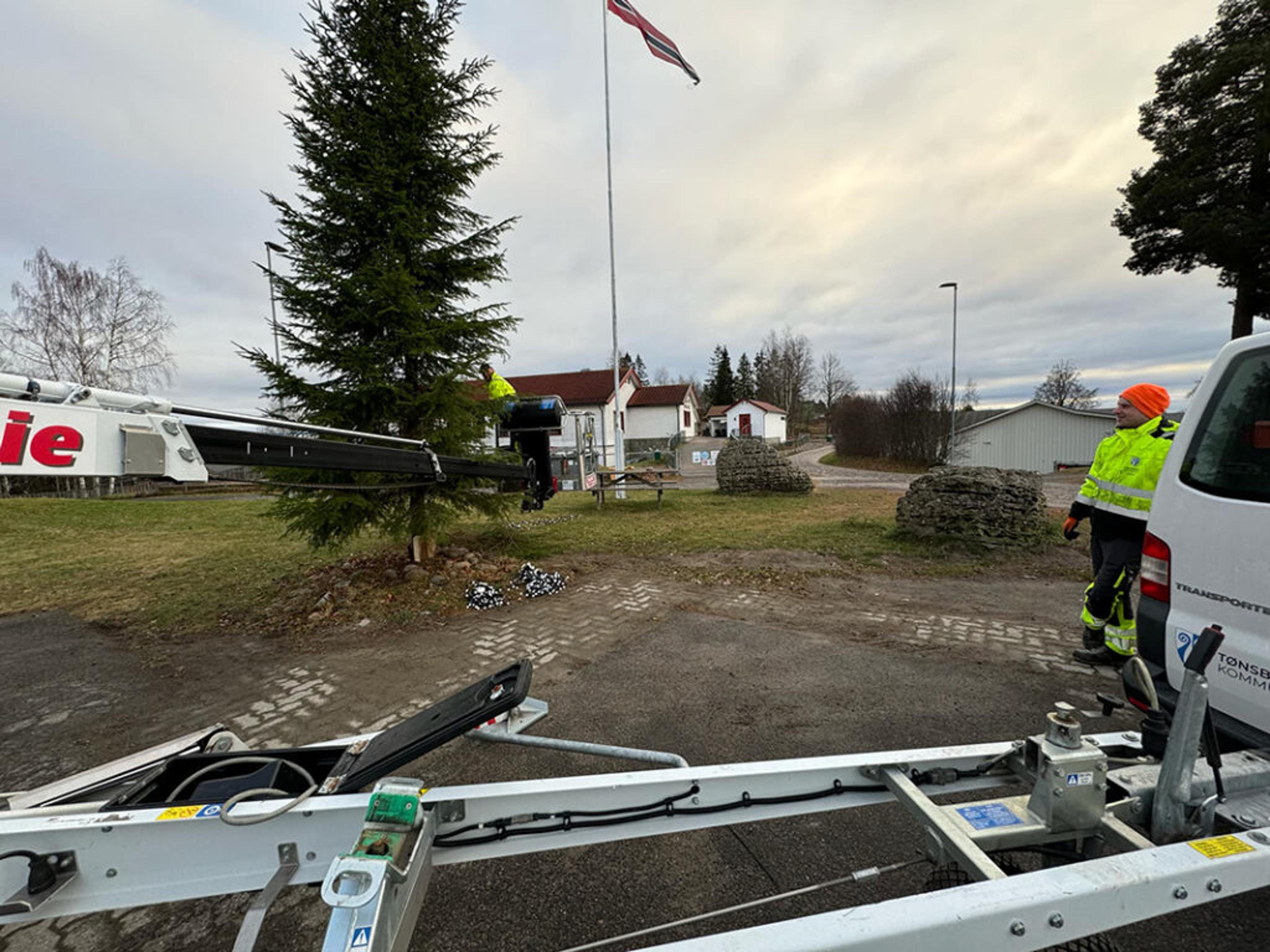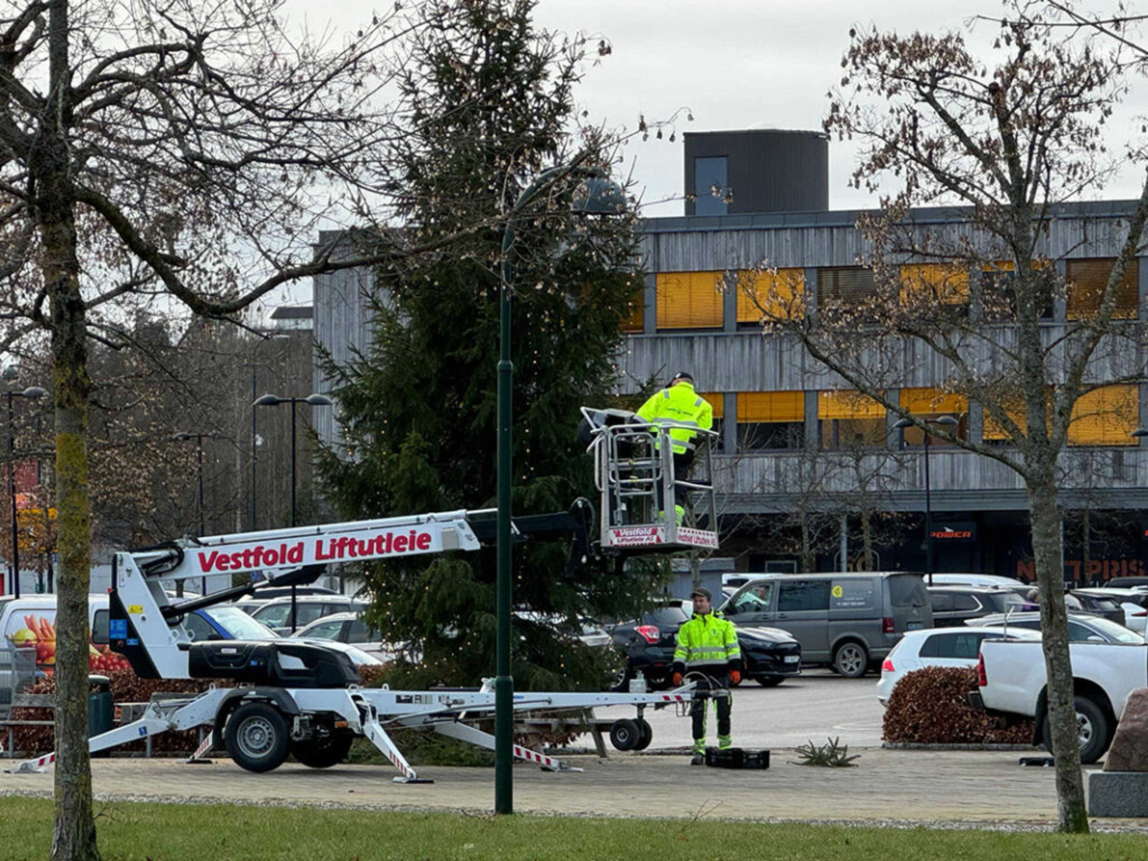 SISTE HÅND PÅ VERKET: Julegrana utafor Våle samfunnshus er klar for å tennes den første søndagen i advent, søndag 1. desember 2024. Det sørger to fra kommunens vaktmesterstab for. Foto: Stian Ormestad, ReAvisa.