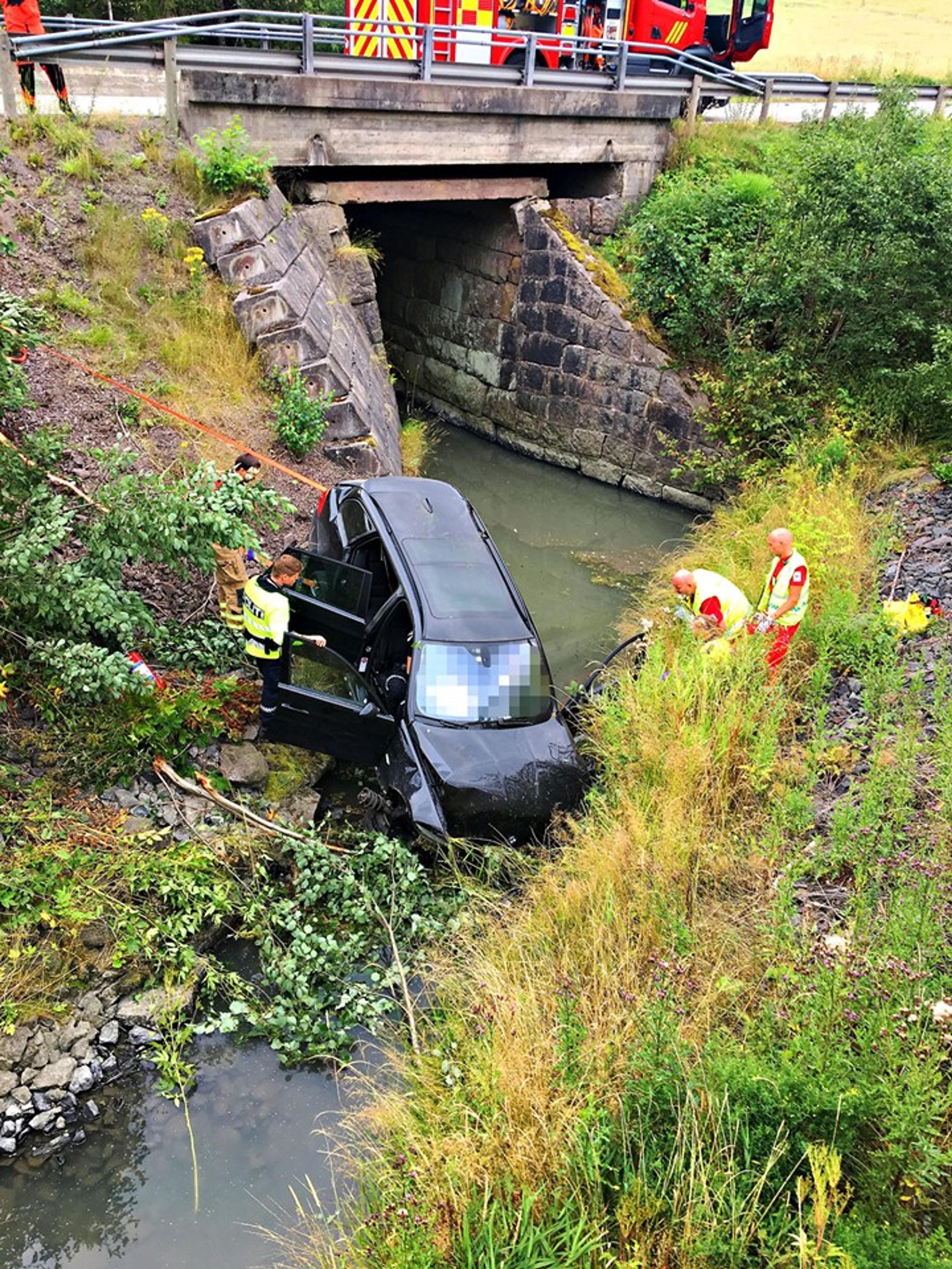 BERGNING ER I GANG: Bilen må heises opp fra elva. Knudstadveien er stengt i mens bergningsjobben pågår. Foto: VIB.