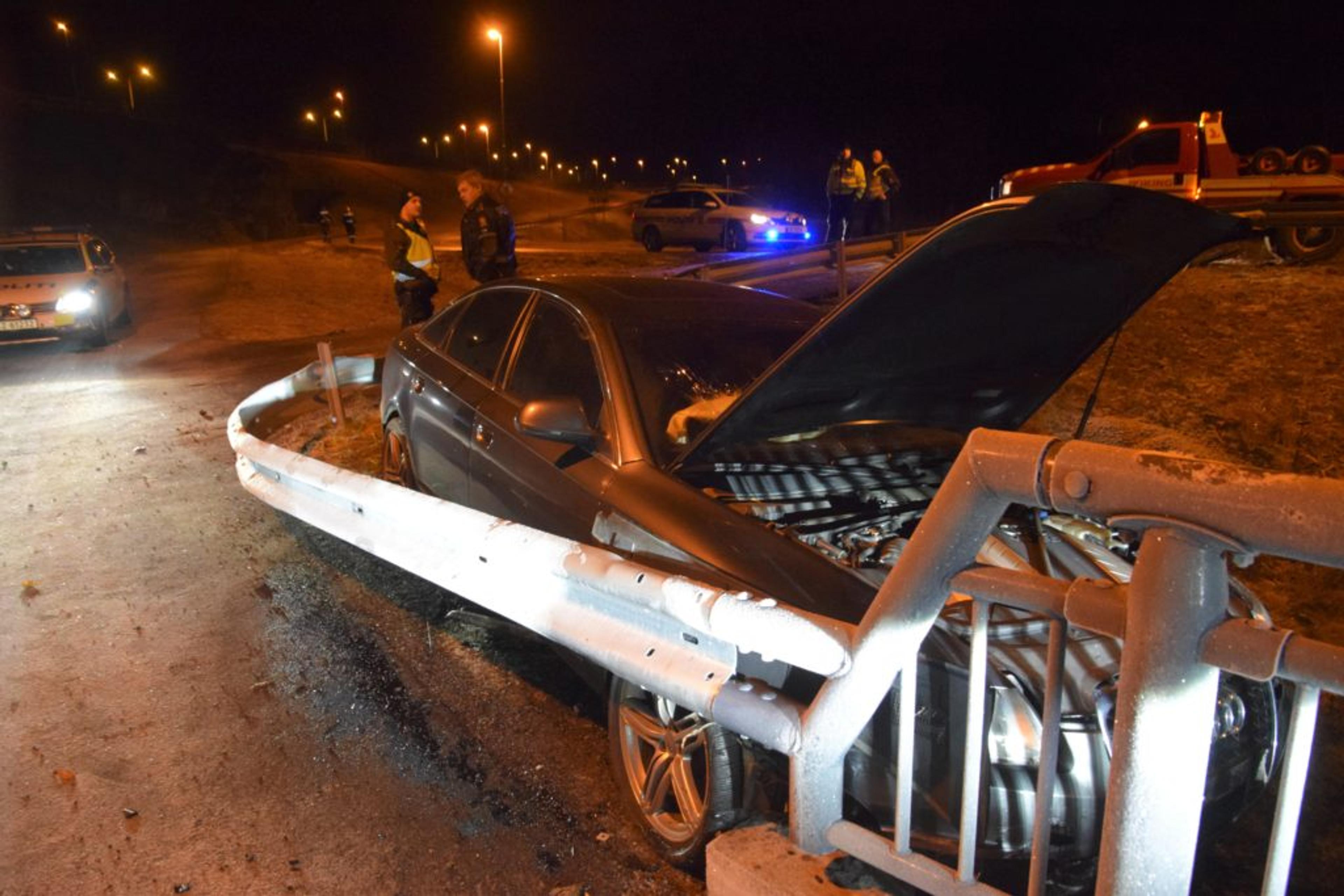 FØRSTE ULYKKE: En bil havna på feil side av autovernet i venstresvingen etter avkjøringa fra E18. Foto: Stian Ormestad.