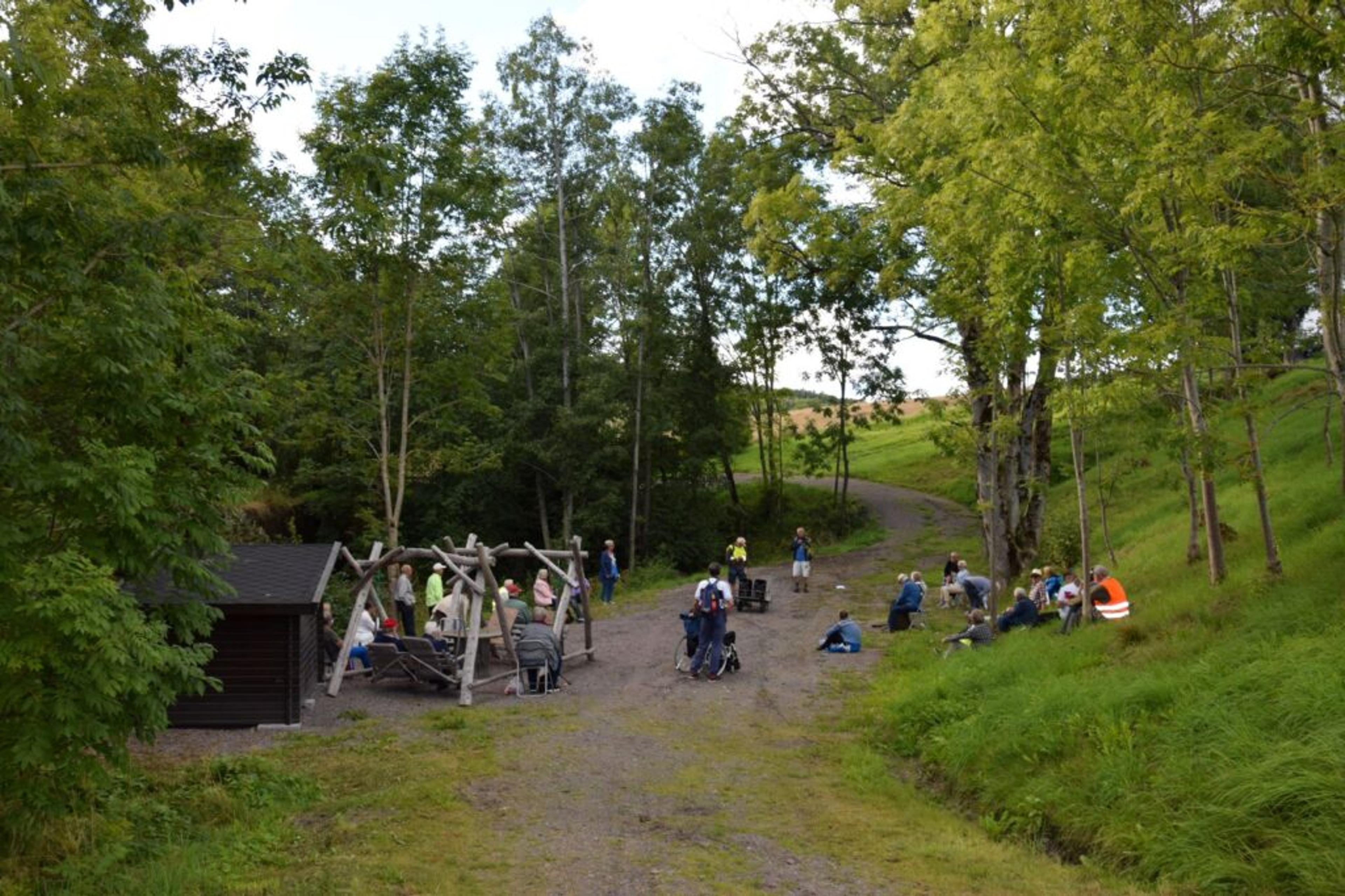 VED MØLLEDAMMEN: Rast og orientering om rassikring og historene om sag og møller på stedet. Foto: Håkon Westby.