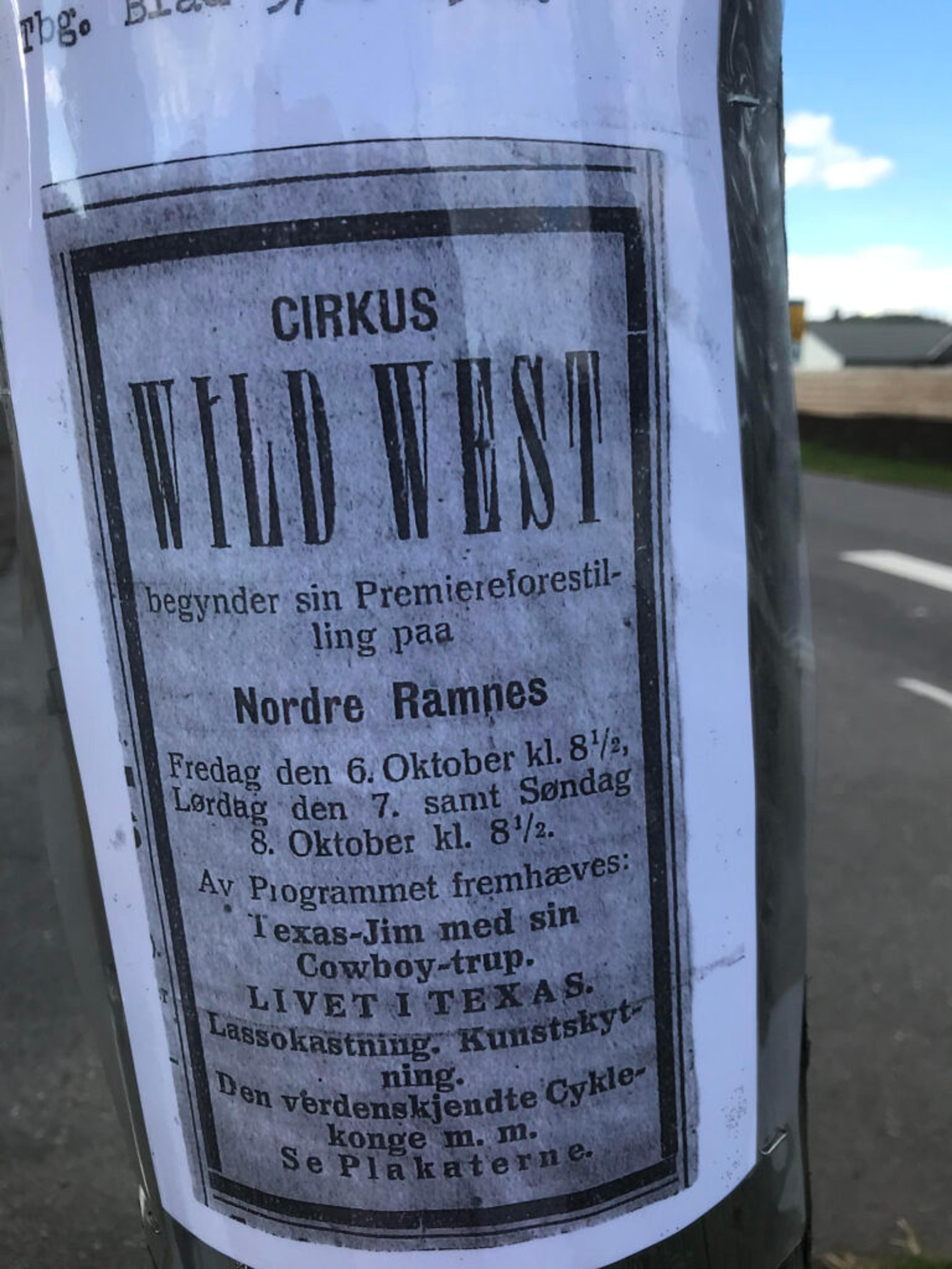 CIRKUS WILD WEST: En kopi av plakaten som innviterte til sirkusforestilling på Nordre Ramnes i 1917 var hengt opp. Foto: Håkon Westby.