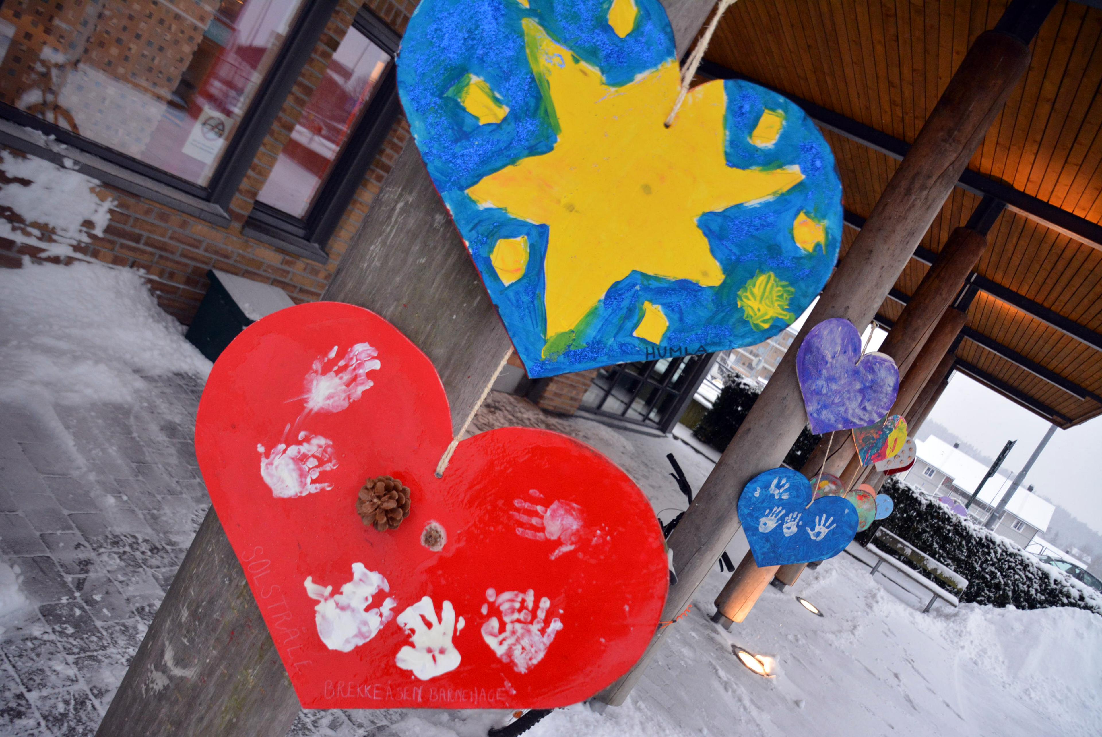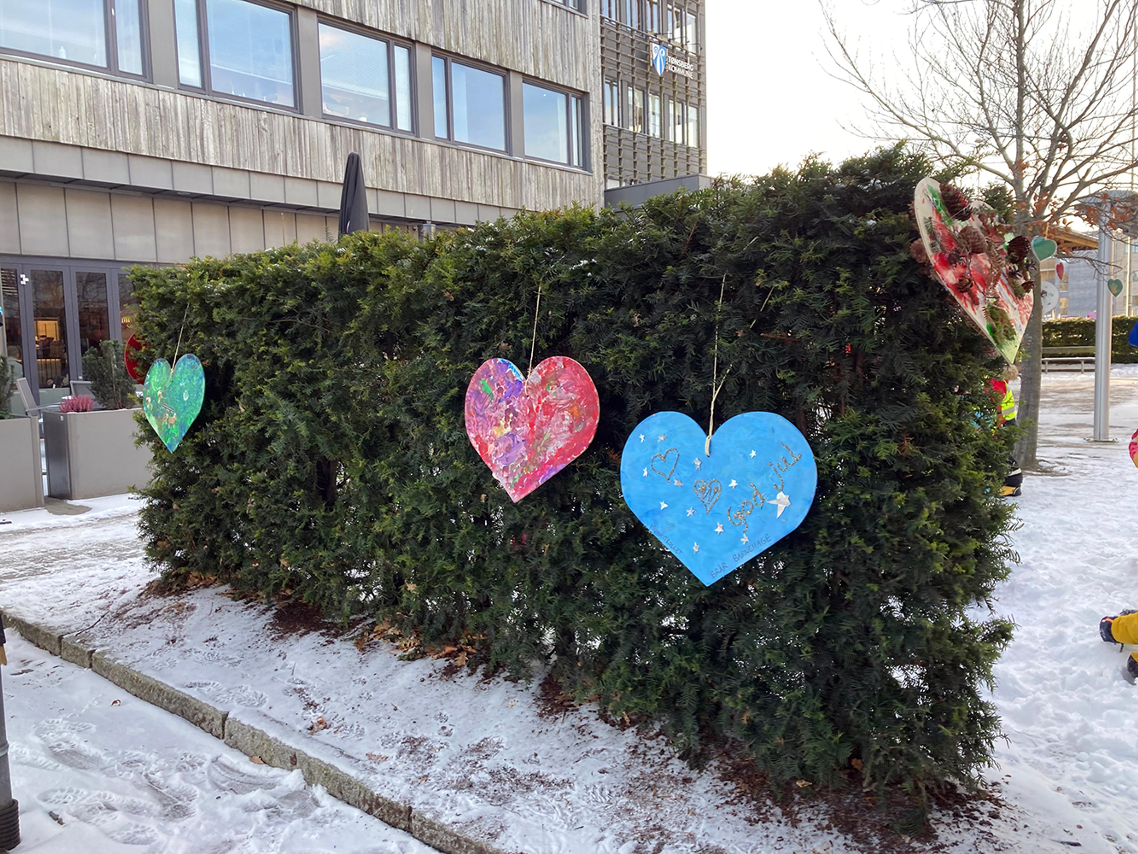 JOBB OG LEK: Mandag denne uka sørga de eldste barna i Brår barnehage for å henge opp den hjertelige julepynten. Alle barnehagene i Re har vært med på å lage de flotte, kreative og fargerike hjertene. Foto: Stian Ormestad / Brår barnehage.