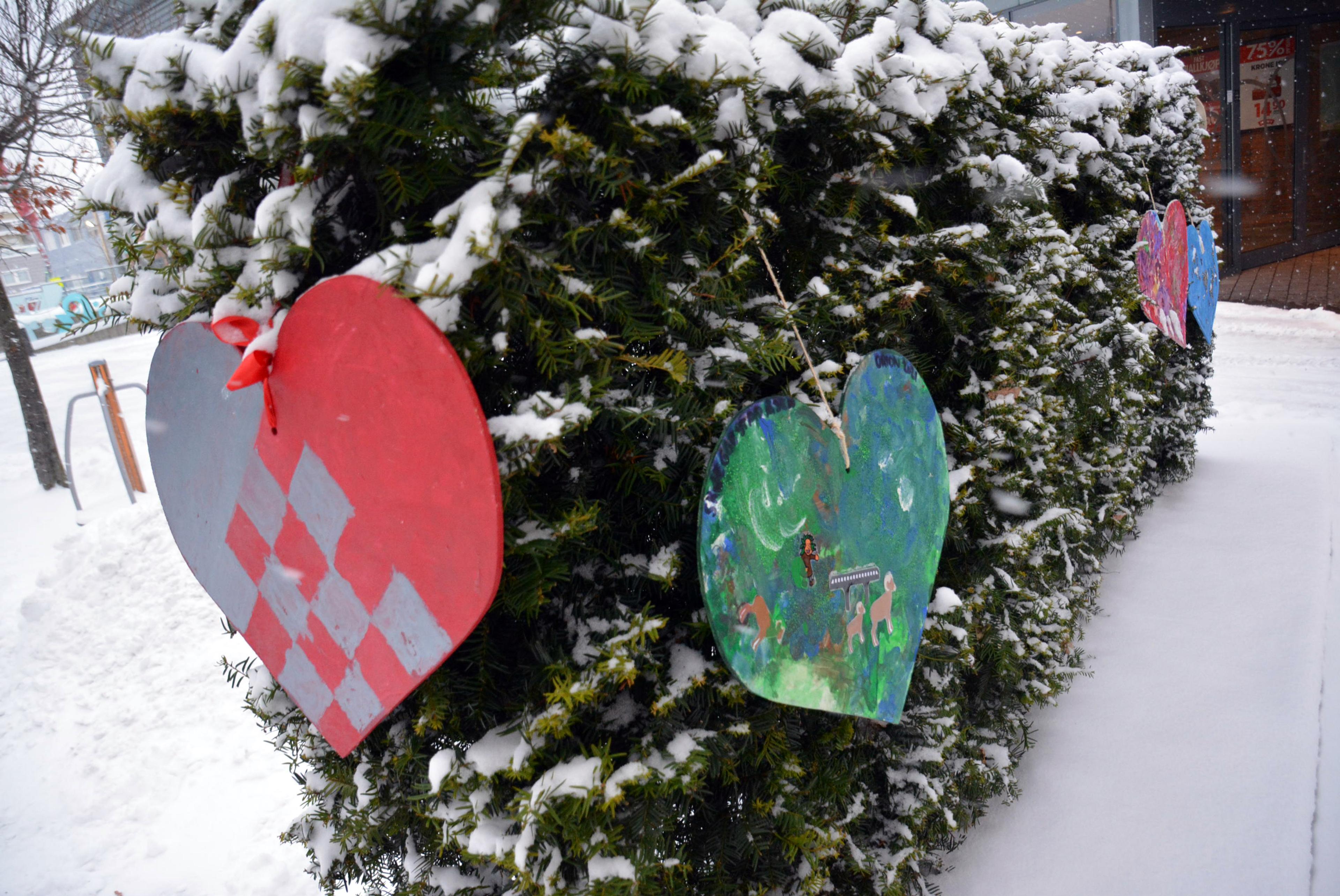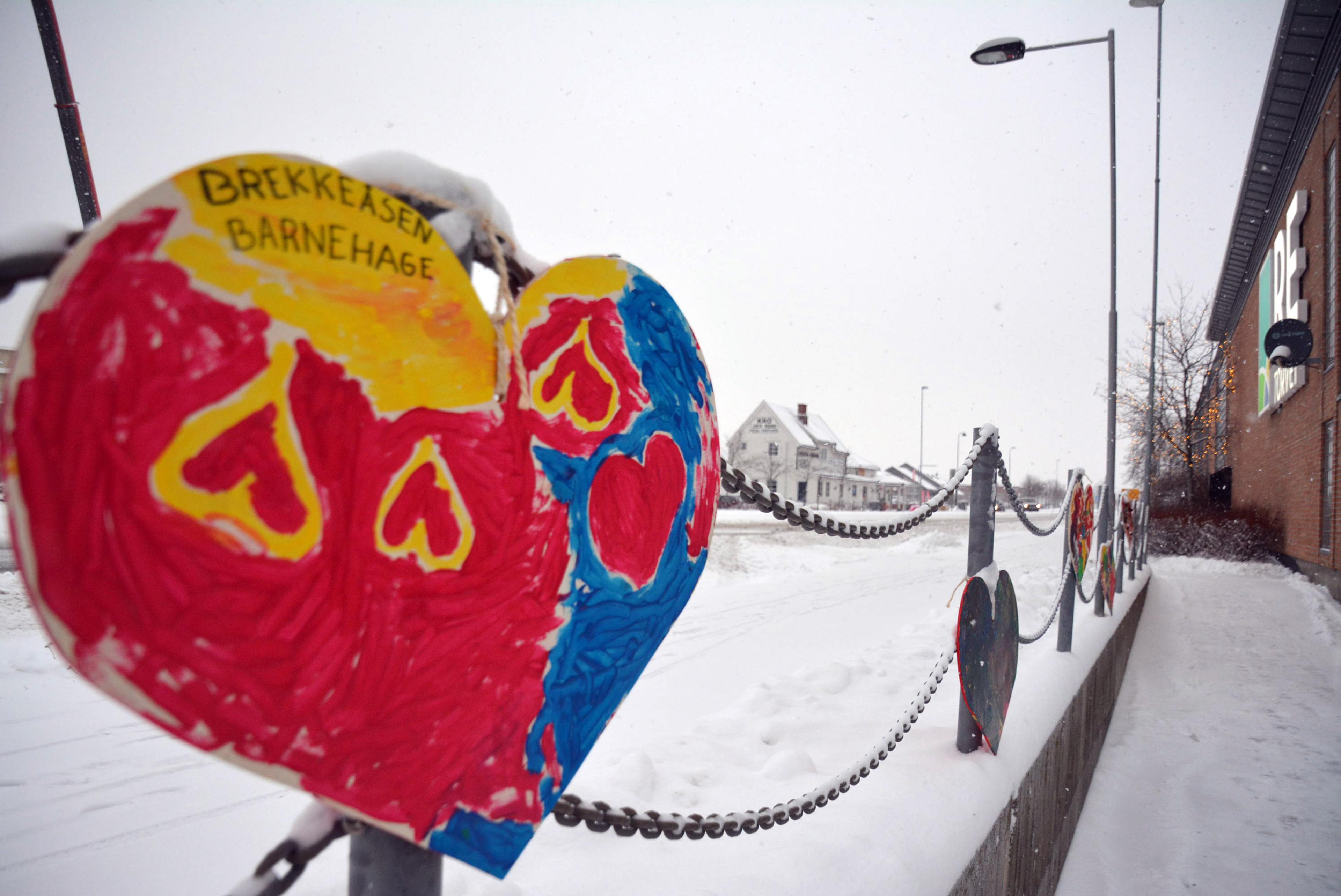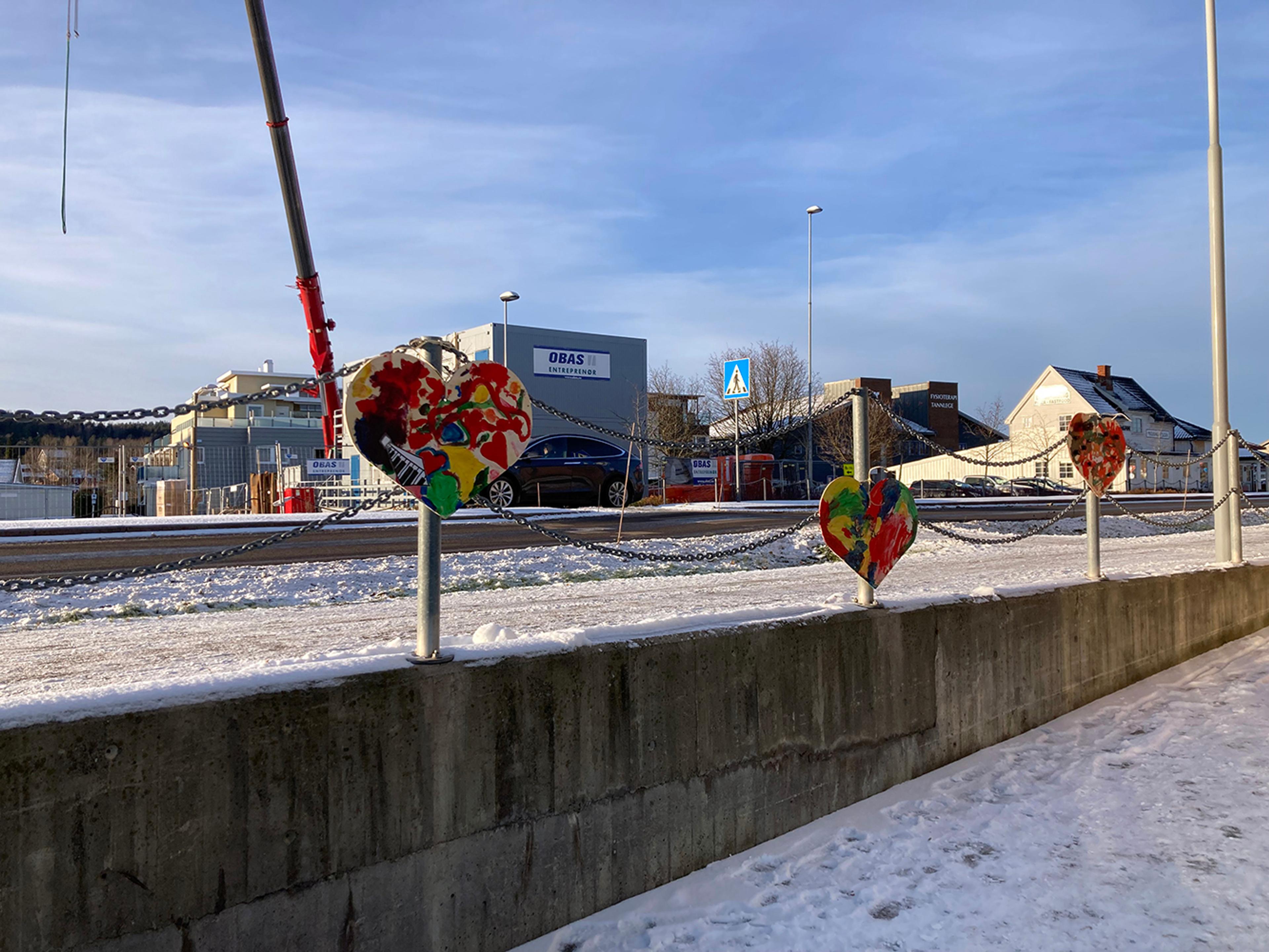 Du vil se de kreative og fargerike hjertene rundt omkring mellom kommunehuset og Re-torvet.