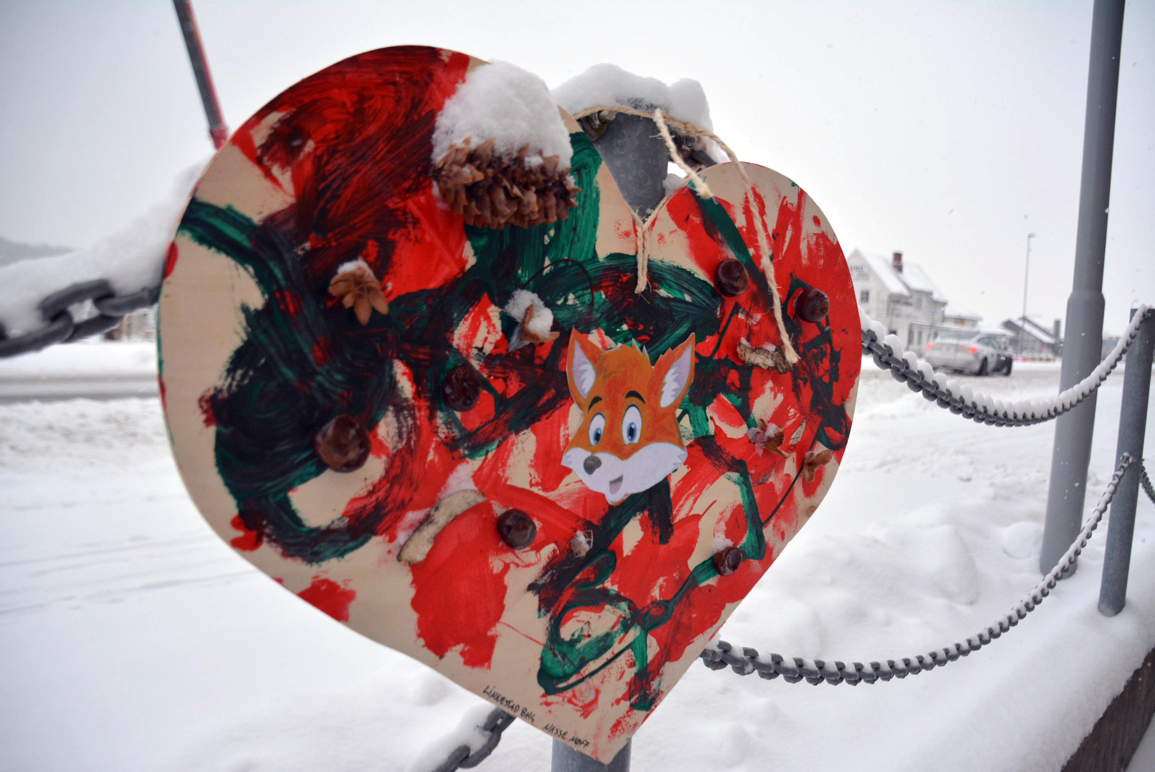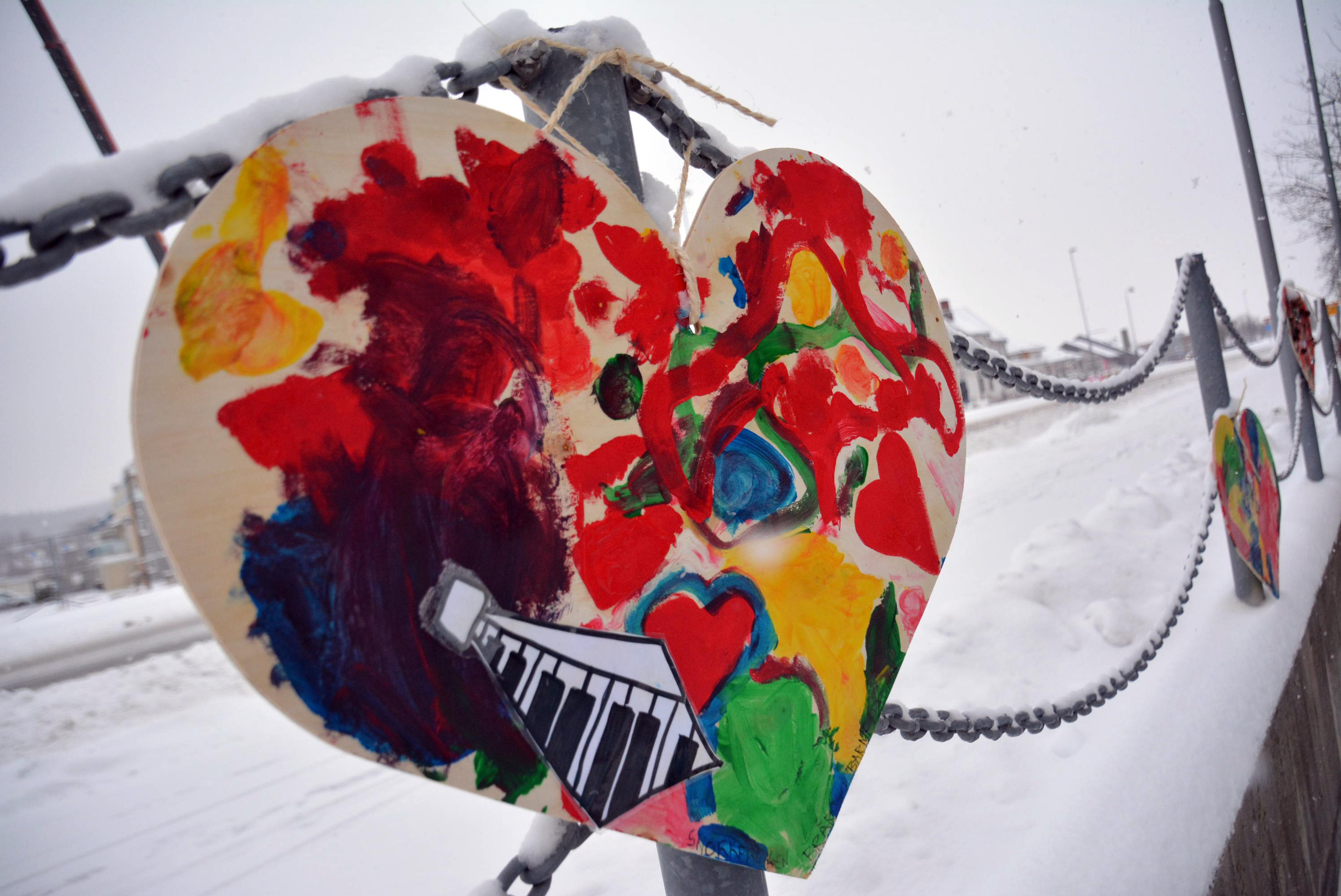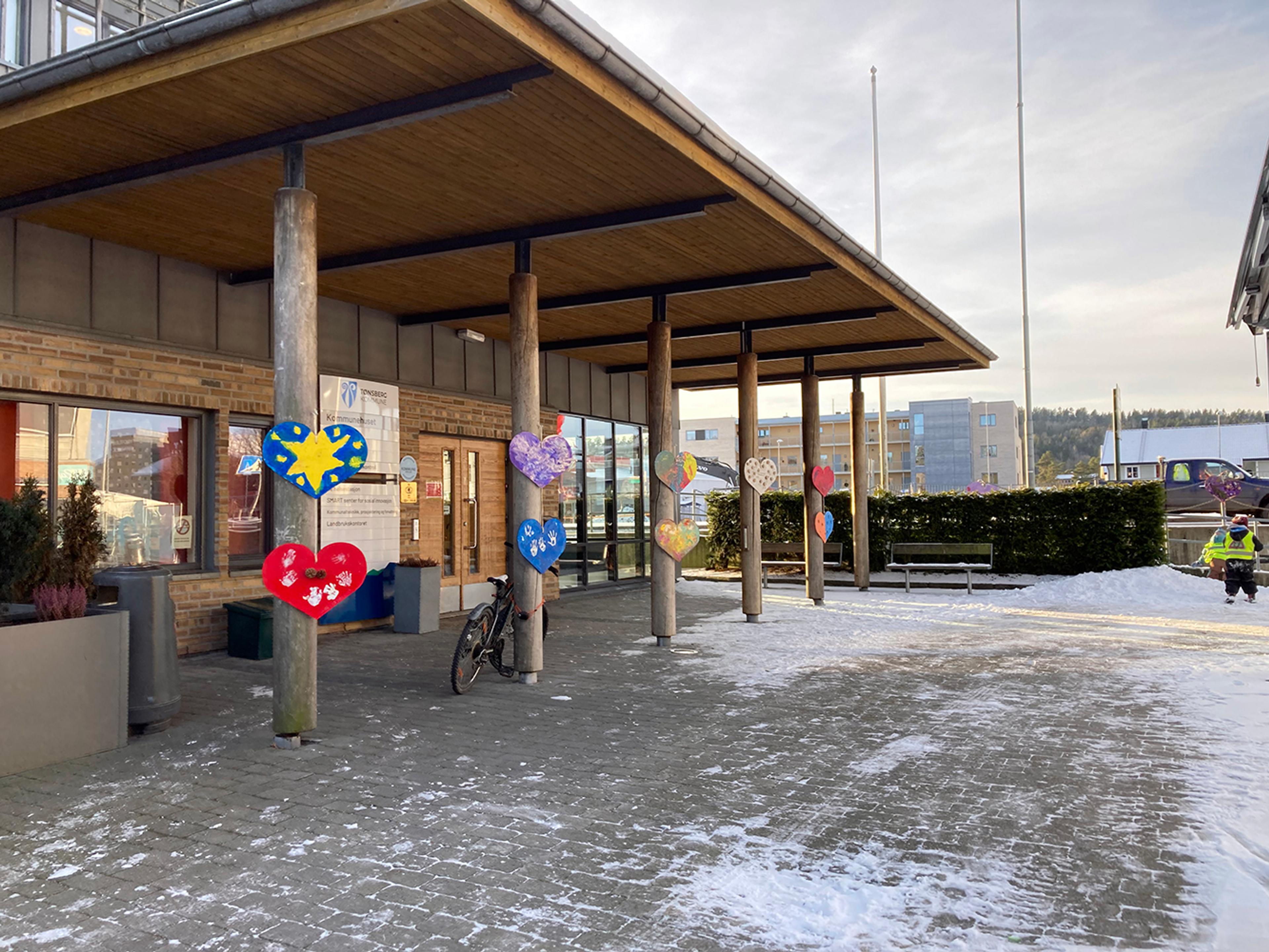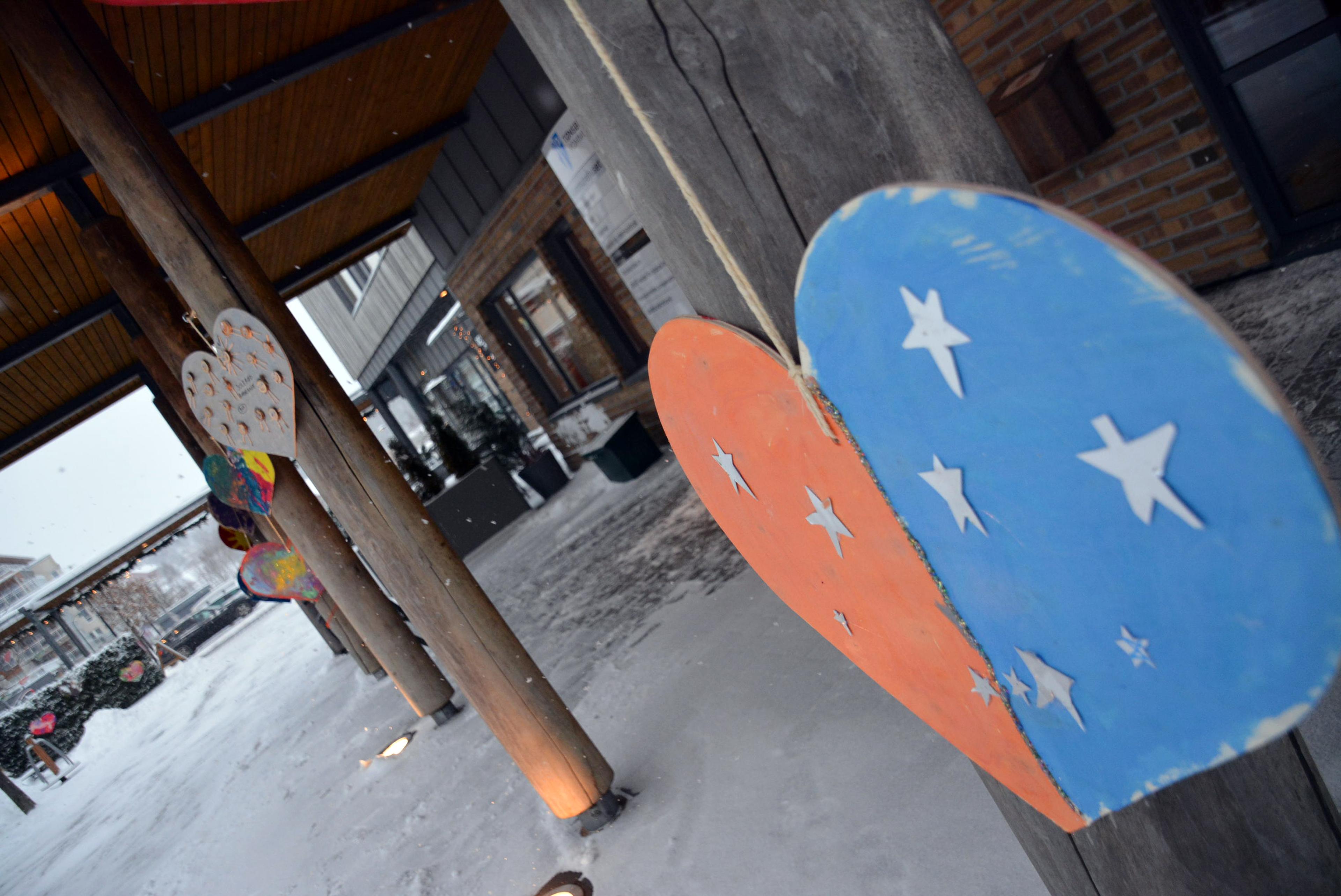 Du vil se de kreative og fargerike hjertene rundt omkring mellom kommunehuset og Re-torvet.