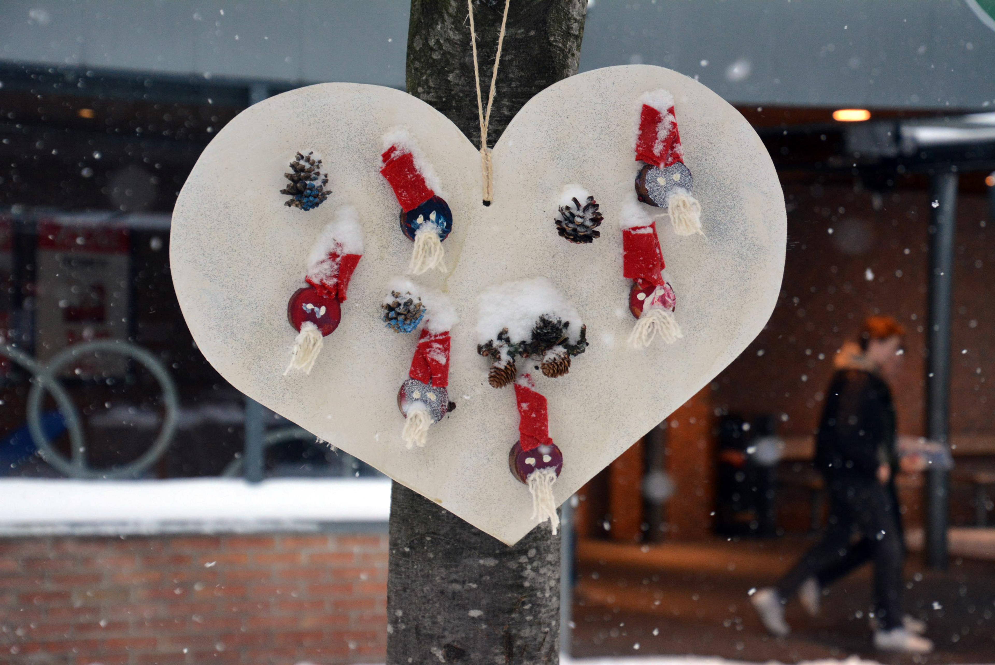 JULESTEMNING: Samtidig som julehjertene ble montert, kom snøen – skikkelig julestemning! Foto: Stian Ormestad / Brår barnehage.