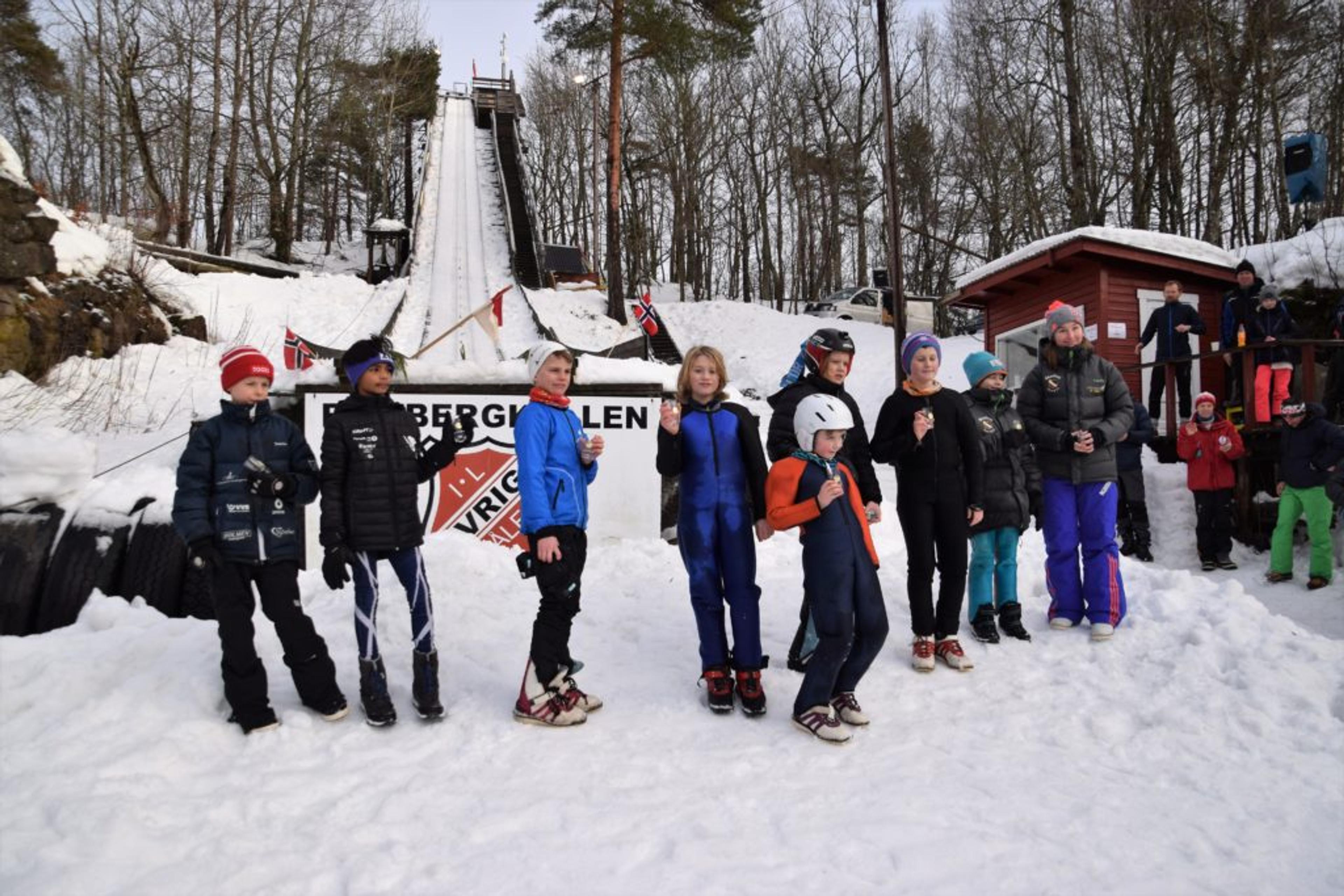 PREMIEUTDELING: Premie til alle deltakerne, og her har vi de yngste deltakerne samla. Noen av dem hoppa i flere bakker. Foto: Stian Ormestad.