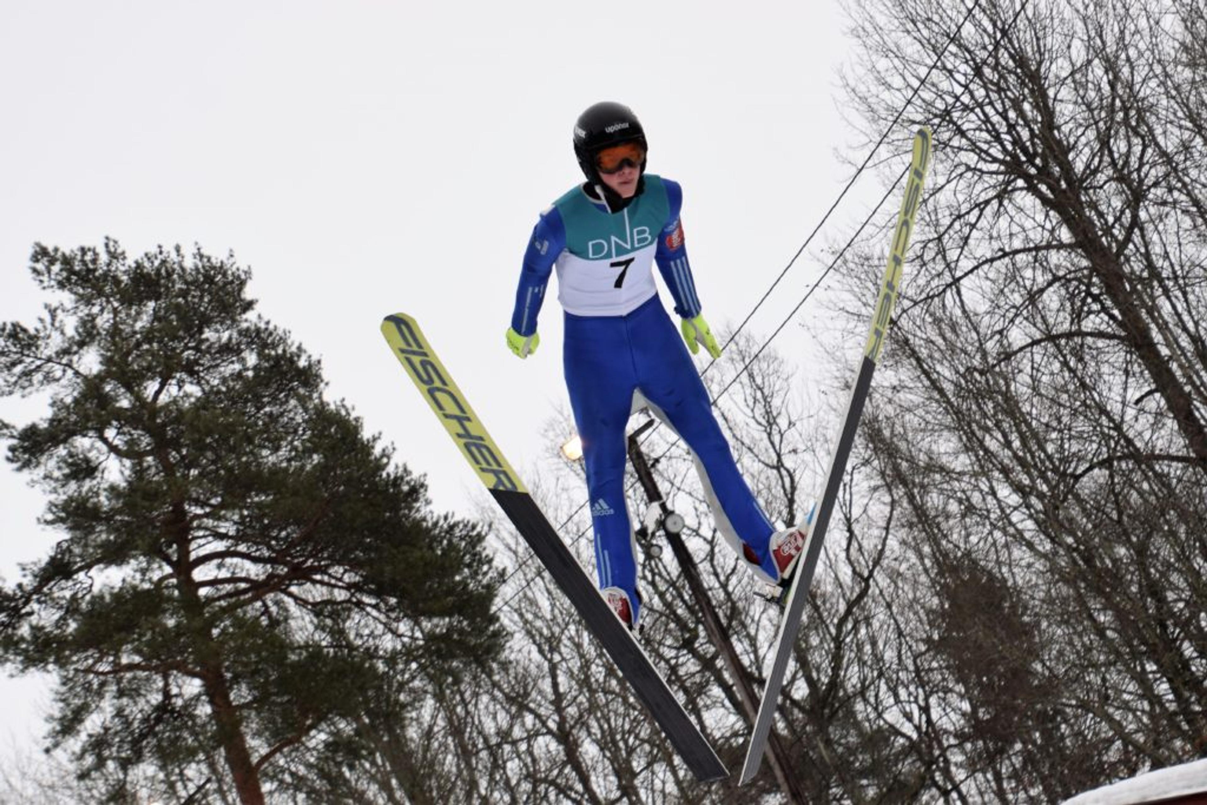 DAGENS LENGSTE: Kristian Høines fra Pors IF Allianse Ski i Gutter 14 år-klassen svever lengst med sine 47,5 meter. Foto: Stian Ormestad.