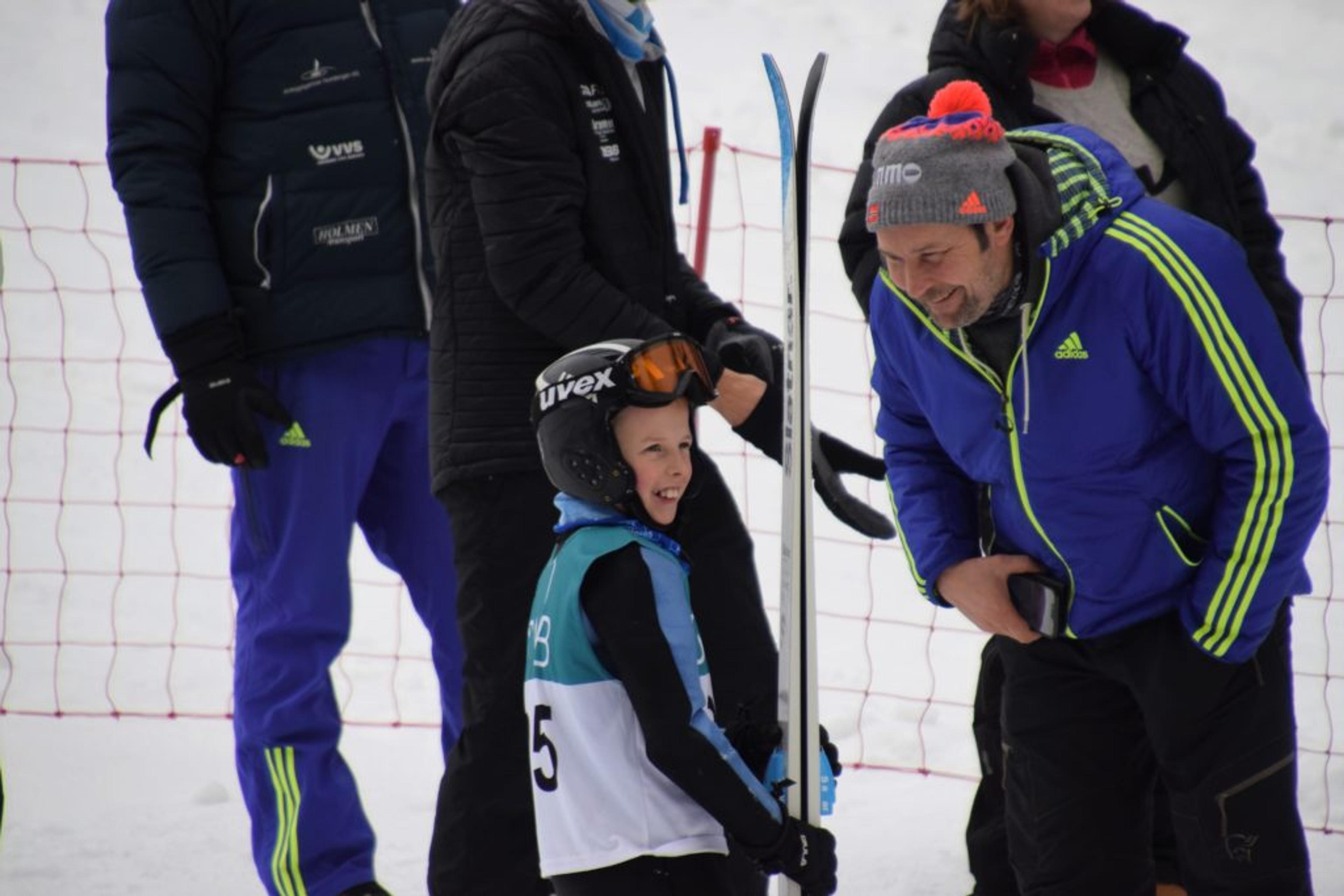 10-åringen starter med 3,5 meter i prøveomgangen, legger på til 4 meter i 1. omgangen, og øker enda mer til solide 4,5 meter i sistehoppet. – Meget bra hopp, forteller en informativ og god speaker i bakken.