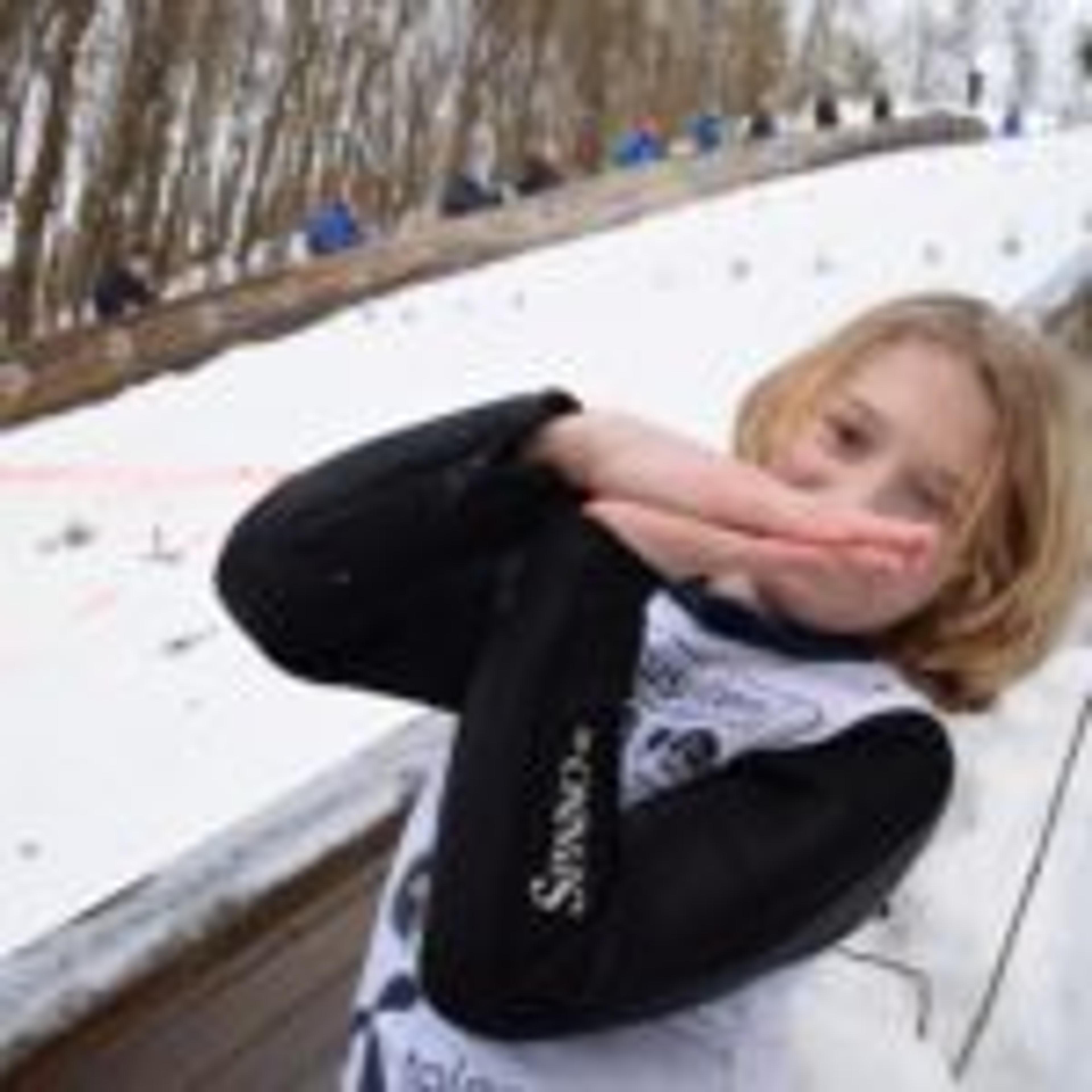 GOD STEMNING I BAKKEN: Denne unge hopperen endte på baken i bakken, men var like hel og like blid. Foto: Stian Ormestad.
