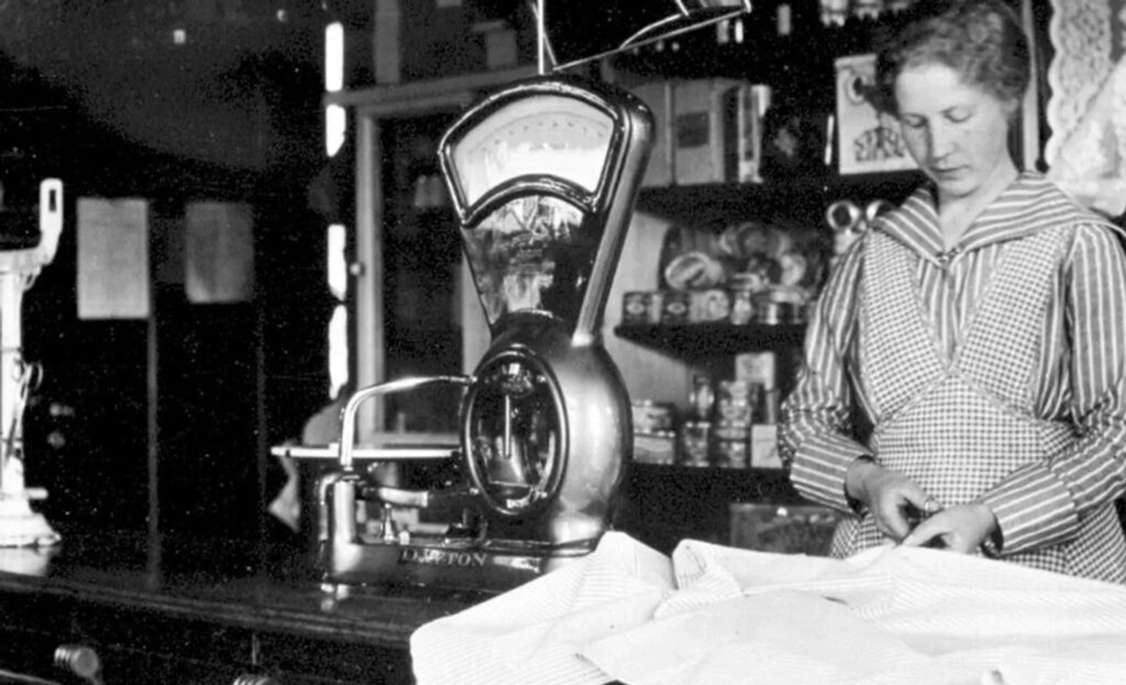 SENTRUM I GAMLEDAGER: Mange lar seg nok overraske over hvor mange butikker det var, overalt i Re, i gamledager. Og rundt mange av disse vokste små lokalsentre fram, som er lagt ned for lengst. Foto: Våle historielag.