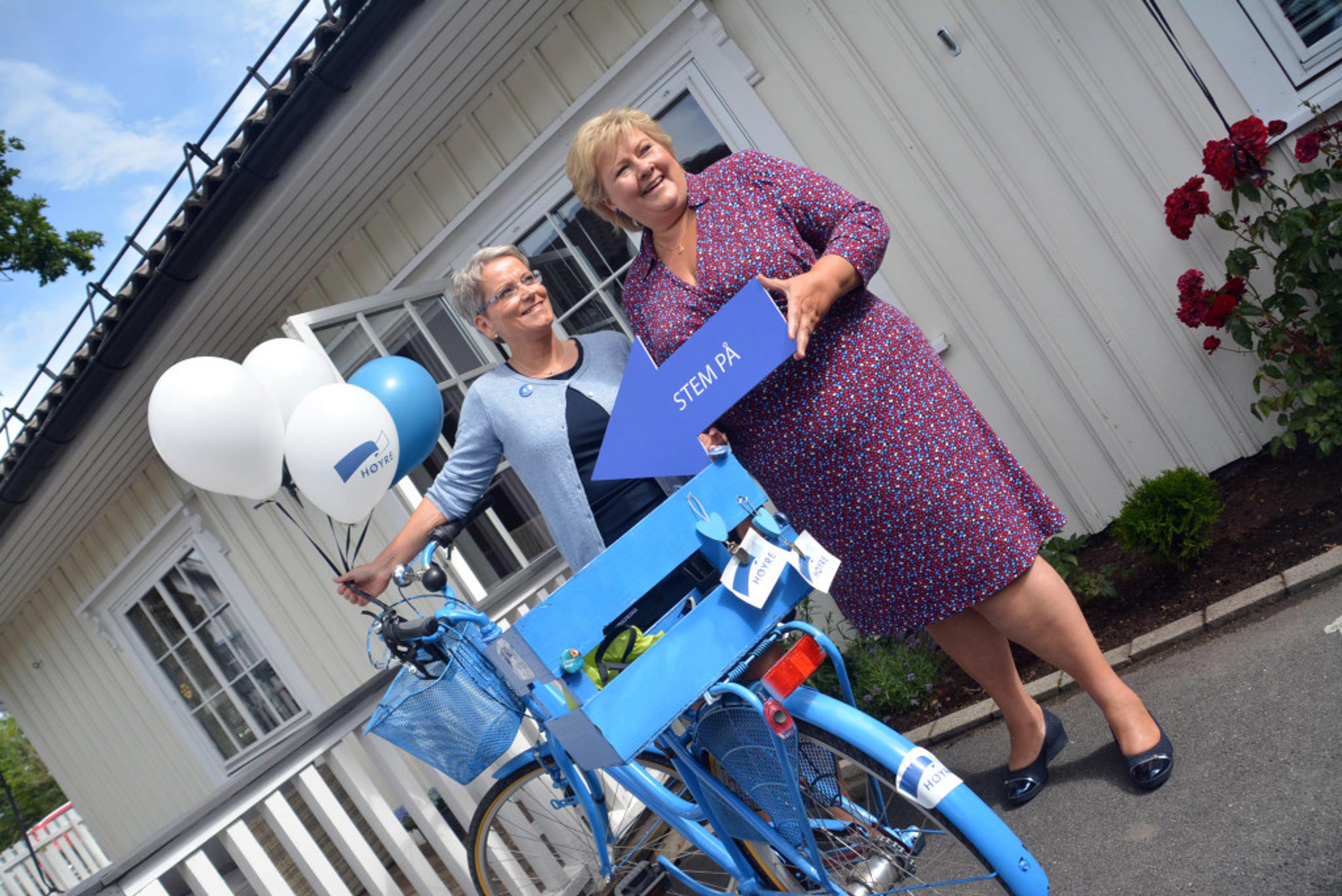 GODT KJENT: Erna Solberg (H) har vært mye i Re, som her da hun besøkte ordførerkandidat i gamle Re kommune Tove Øygarden (H) hjemme i Ramnes for åtte år siden. Da starta snuoperasjonen fra et lokallag nede for telling til å bli det største partiet i samtlige sogn i Re i årets lokalvalg. Arkivfoto: Stian Ormestad, ReAvisa.