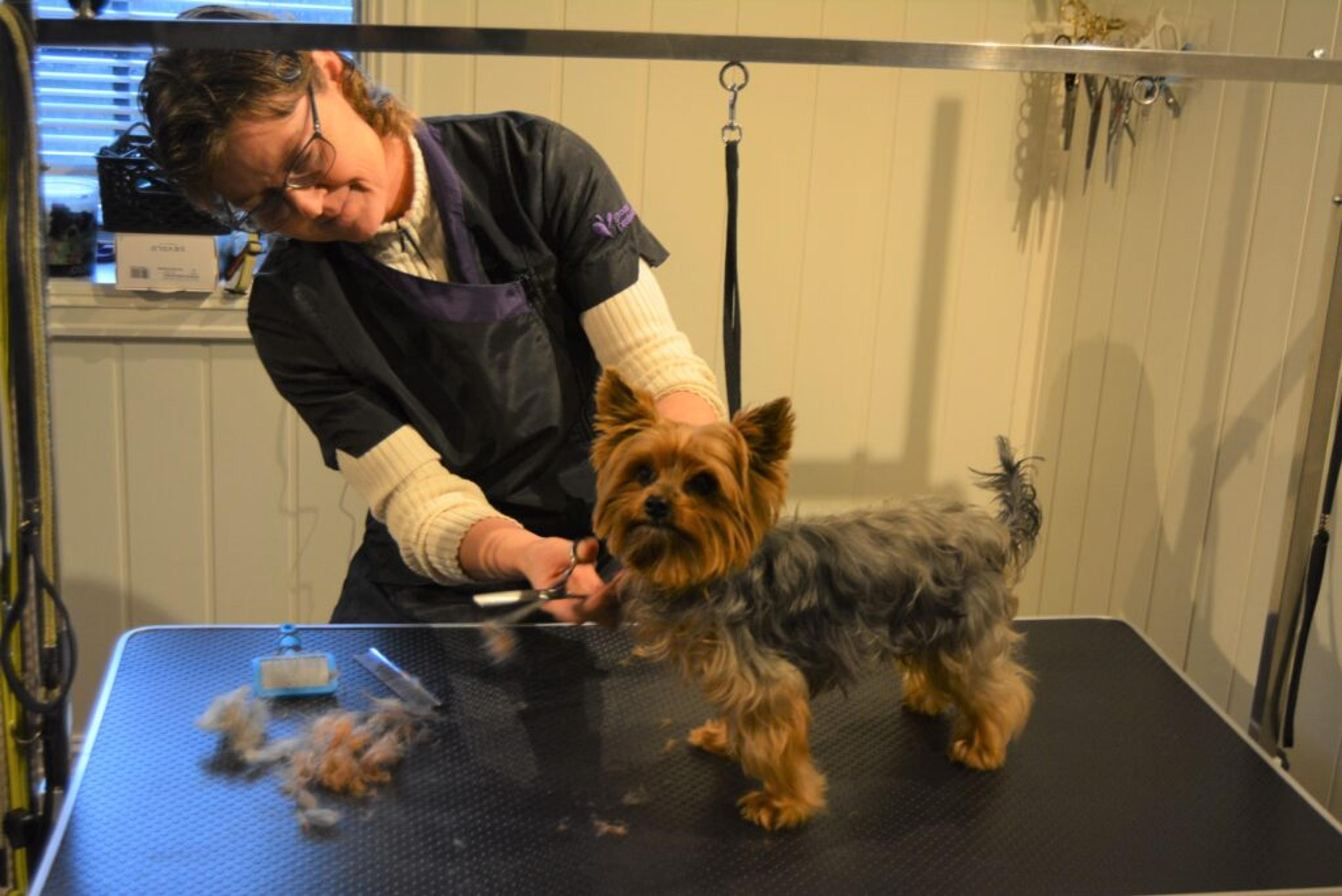 FRISØRSALONG FOR HUNDER: På Engell hundesenter kan hundene få egen klippetime. Pim (9) blir klipt og stelt av hundefrisør Kari Skjauff Kihle (49). Foto: Lovis Eggum Wallberg.