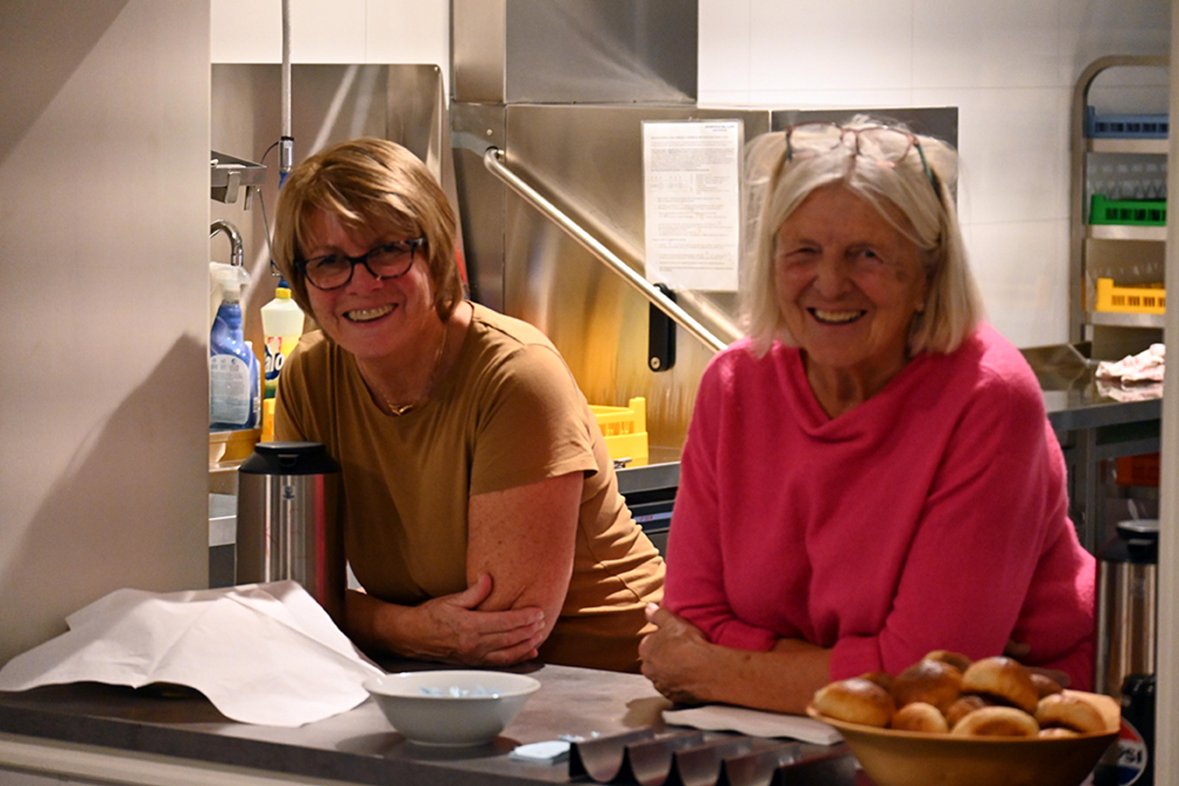 KIOSKDAMENE: Elisabeth Ektvedt og Ingegerd Holt Brattestå er to av veldig mange frivillige som sørger for at vi har flust av små og store møteplasser her i bygda vår. De sto i kiosken under Talentshowet på Kulturhuset Elverhøy forrige helg. Der fikk alle kjøpt det de ville ha med et smil på kjøpet. Foto: Stian Ormestad, ReAvisa.
