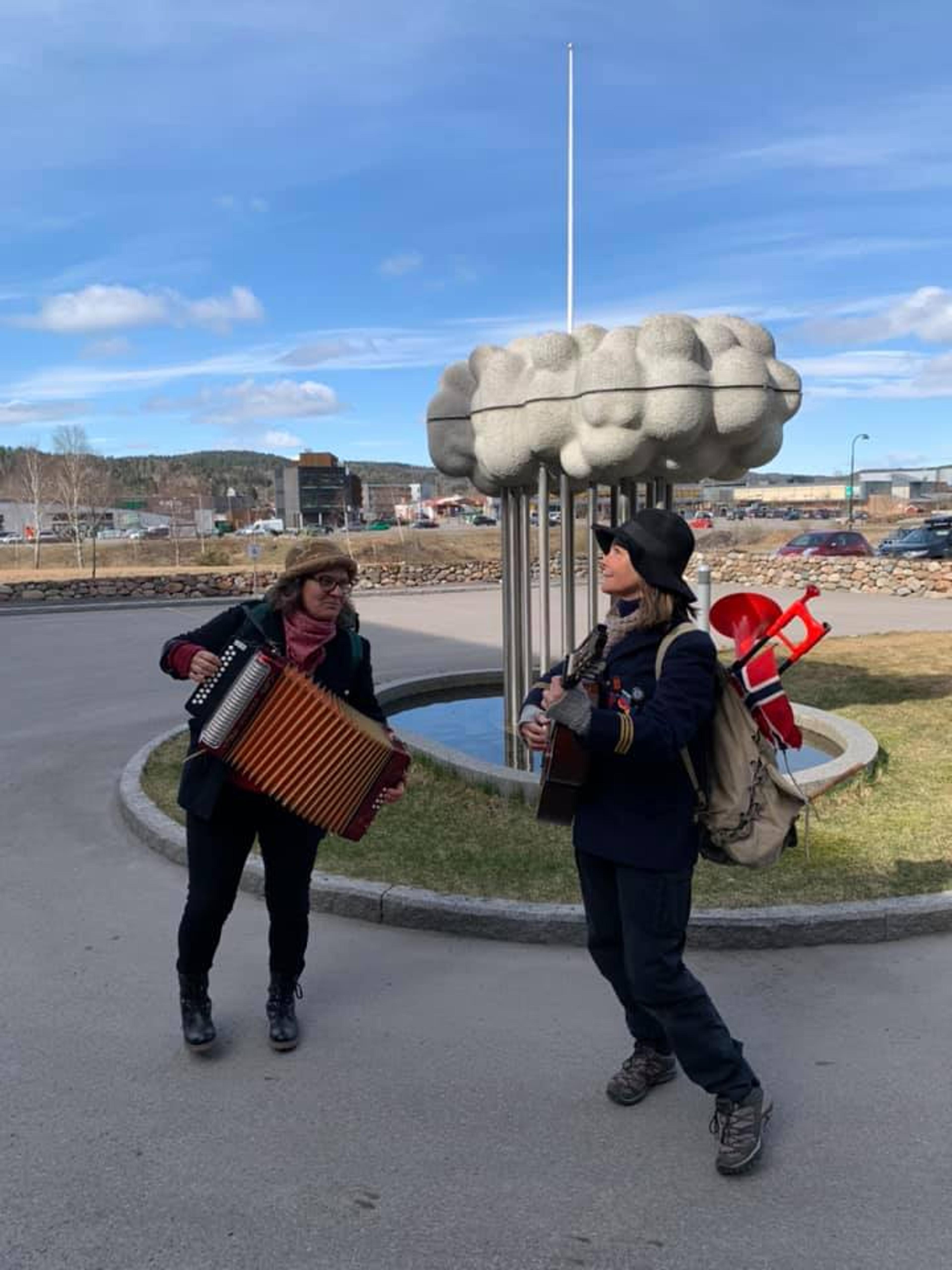 Sprell og moro, det er alltid en del av hverdagen ved Re helsehus. Heller ikke her, som ellers i bygda vår, tar man seg sjæl så fryktelig høytidelig – det har vært mange artige dager med mange merkelige utkledninger. Her var det bare tursekk og trekkspill som rekvisitter. Foto: Stian Ormestad, ReAvisa.